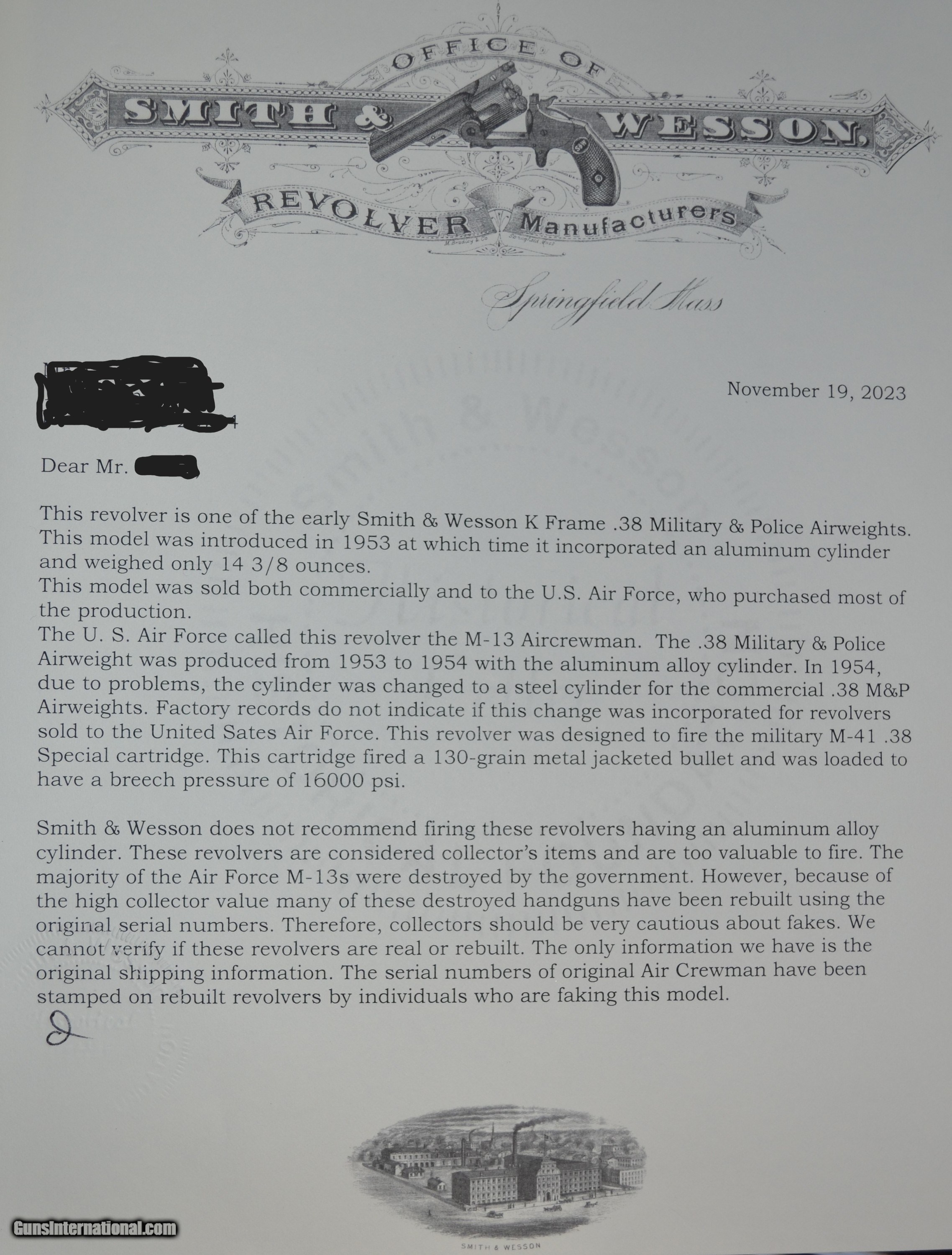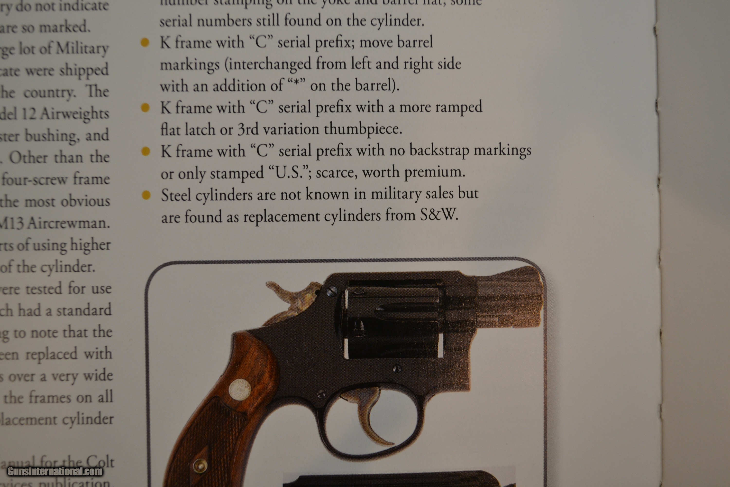 Description: For sale is a lettered S and W aircrewman, matching and nice, rare "US" marking back strap (see photo from s and w book), cylinder Aluminum matching , right grip matching, barrel un numbered, this feature was discontinued this late inproduction. Finish is strong with handling expected. FFL or c and r. Price is neg, OBO I will be out and about so, email would be better. SOLD Handgun Caliber: .38 Special |