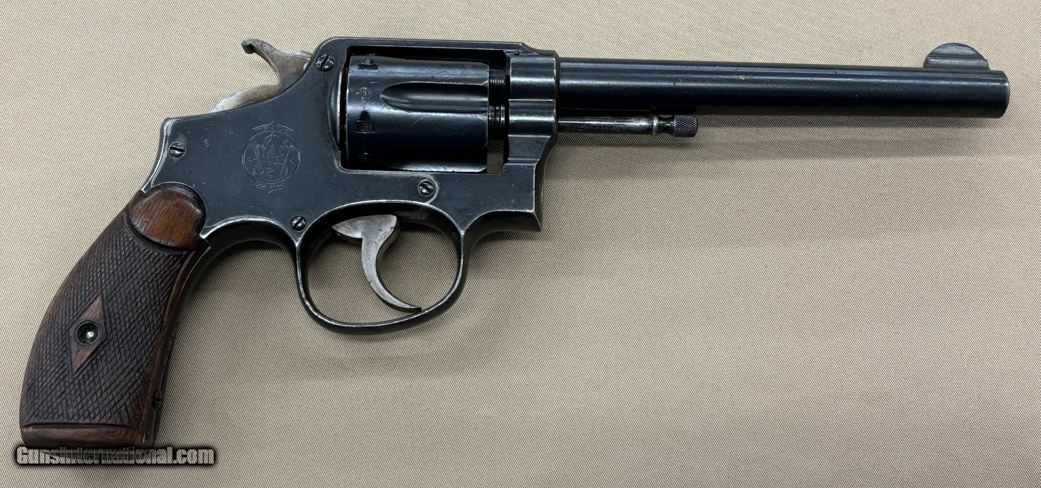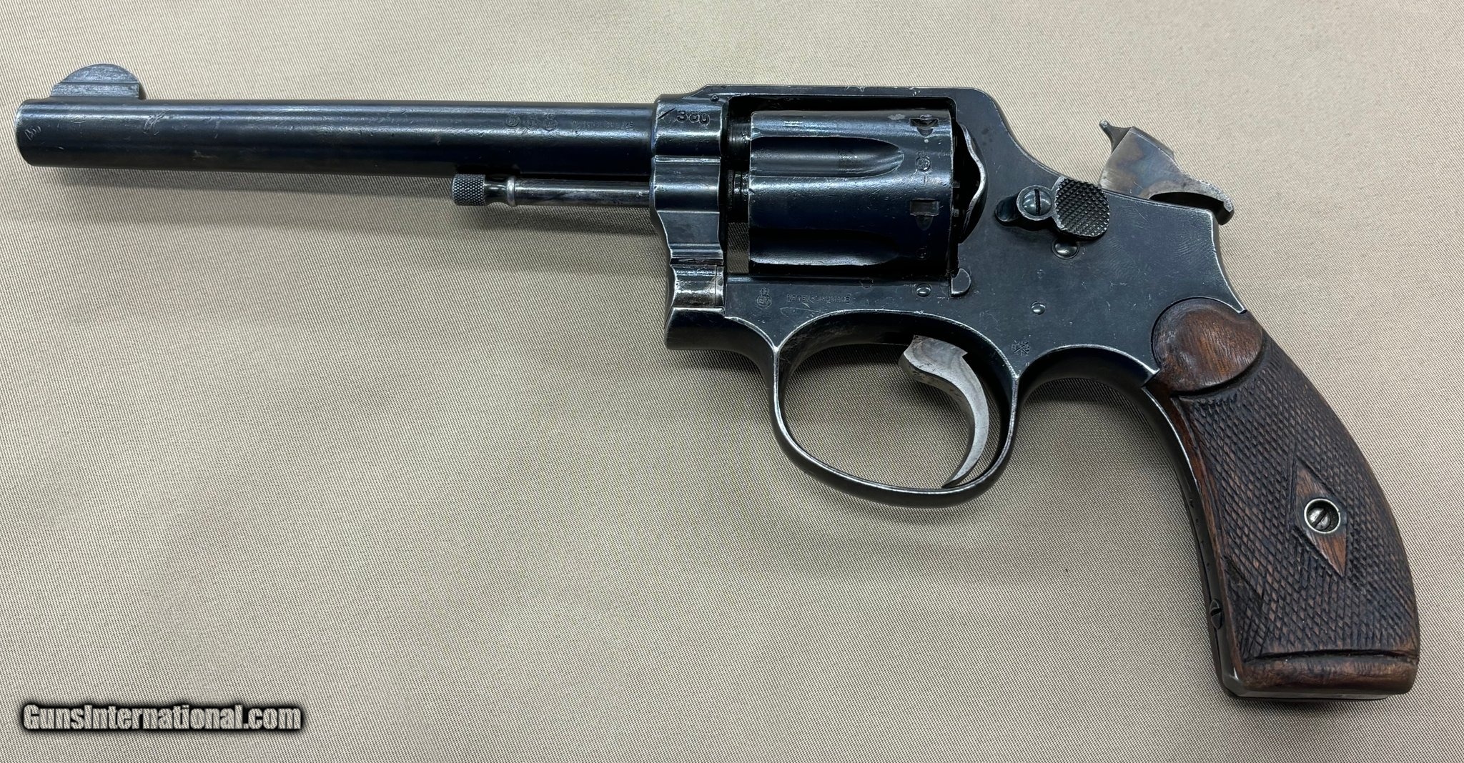 Description: Guns Listing ID: 1434292 This Smith & Wesson Model 1899 Military (USN) .38lc was one of approximately 1,000 Made for the USN. About 1/2 of these revolvers were sent to England (Pre-Lend Lease). It is stamped \"NOT ENGLISH MADE\" (see pics) and was tapped for a Lanyard. The Lanyard was removed and hole filled prior to the gun‚‚s return to the U.S. The original USN Anchor is still present on the butt (see pic). The condition is Good to Very Good with wood grips. Do your research. This beauty is truly RARE SOLD Manufacturer: SMITH & WESSON Model: 1899 USN Caliber Info: .38 LC Condition: Used - Non-Certified Barrels: 6 BARREL Finish: BLUED |