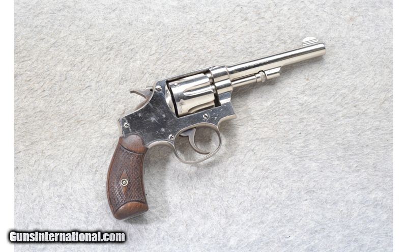 Description: This Smith & Wesson Model 1903 is a 6 shot double action revolver in .32 Long Cal. It has a 4.25 inch barrel. A blade front sight and an integral notch rear sight. The grip is a diamond checkered walnut. The hammer spur is checkered. S/N 365324. .32 S&W Long SOLD Chambers: 6 shot fluted cylinder. Metal Condition: Fair. Has a lot of surface blemishes and handling marks. Wood Condition: Fair. Has some wear and handling marks. Bore Condition: Very good. Barrels: 4.25 inch barrel. Stock Dimensions: Single Action / Double Action Weight: 20 oz. Sights: Blade front. Integral notch rear. Item Location: Richfield, WI |