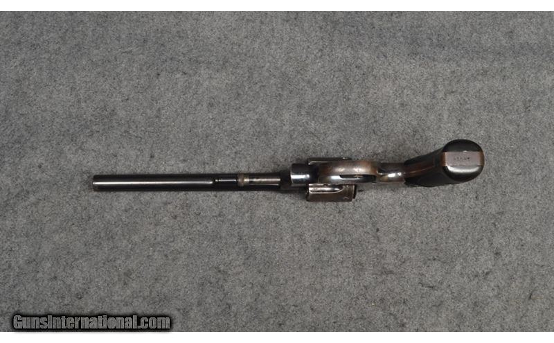 Description: This revolver is a Smith & Wesson Model 1903 hand ejector chambered for .32 long colt. This revolver features a 6 in barrel, case colored hammer and trigger, and checkered black plastic S&W grips. This revolver is in overall fair shape, with loss of finish around grip, as well as the cylinder. Finish on the frame remains about 40%, while the grips are in good shape with light handling wear on right scale. The barrel retains most of the bluing, but has pitting on both sides near muzzle and in the rifling under the front sight. .32 Long Colt SOLD Metal Condition: Overall fair condition Wood Condition: Overall good condition Bore Condition: "Crisp rifling, mild pitting in last inch of barrel under front sight Fore End: Plastic grips Weight: 1 LB 6 OZ Sights: Iron sights Item Location: Wichita, KS |