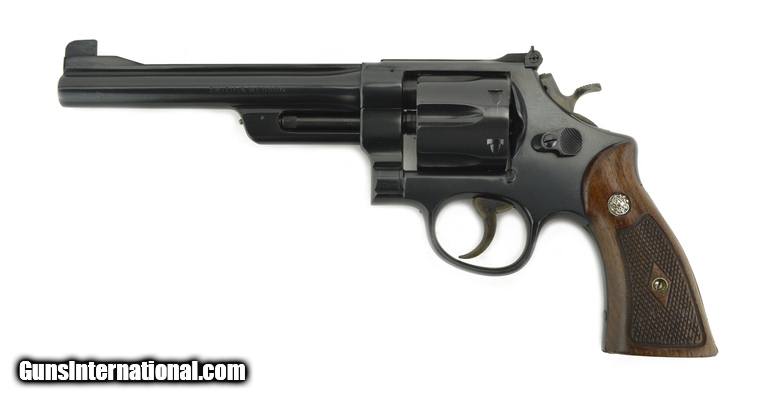 Description: Smith & Wesson 1950 Target .44 Special caliber revolver. 6 1/2” Blue 5-screw pre-model 24. The gun is in beautiful condition with 99% original finish. The grips are correct style post-war magnas but numbered to an earlier gun. The grips show a bit more wear than the gun. A very desirable S&W 5-screw .44.