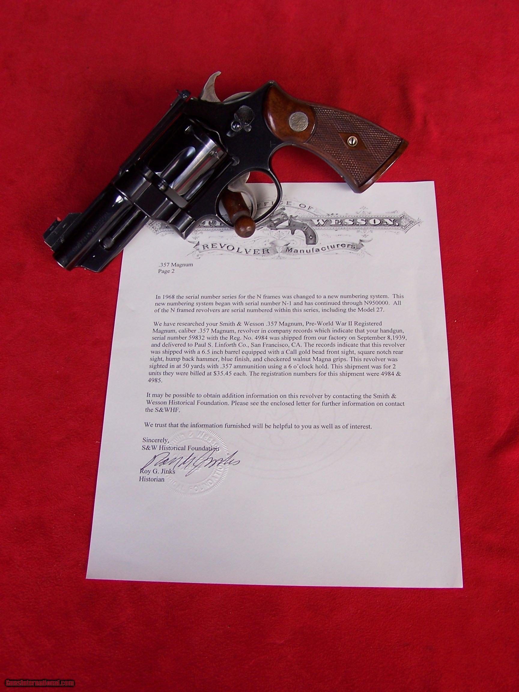 Description: This is a S&W .357 Registered Magnum with the very desirable 3 1/2” barrel. It has a King red bead reflector front sight and the hump back hammer. According to the factory letter it was shipped from the factory in 1939 and left with a 6 1/2” barrel so it must have been converted at some point. The letter confirms the hump back hammer and Magna grips. The registration number is 4984 and that number is shown on the frame. The serial number is shown in the ejected housing, the cylinder and on the bottom of the grip frame. The bluing would rate 97-98% with just a few small handling marks. The gun is mechanically perfect as it the bore. The action is extremely smooth and the best that I have seen on any revolver. The grips are like new and free from cracks, chips and dents. This gun was made in September of 1939 and shipped to San Francisco, California. I offer a three day inspection on all of my guns and it will be packaged correctly with the gun being shipped in a zipper pouch. This gun requires a C&R or FFL license for shipment. Price is $5250 plus $45 insured shipping. Please call Cam 931-484-3200 with any questions. Lay-A-Way Plan is available on this gun. Please Note: This gun is sold pending funds. SOLD Curio/Relic: Yes Manufacturer: Smith & Wesson Model: .44 Registered Magnum Serial Number: 59832 Caliber Info: .44 Magnum Bore: Excellent Condition: Excellent Metal Condition: 97-98% Wood Condition: As new Bore Condition: Excellent Barrels: 3 1/2 Barrel Type: King Sights Action: Double Action Sights: King Manufacture Date: September 8, 1939 |