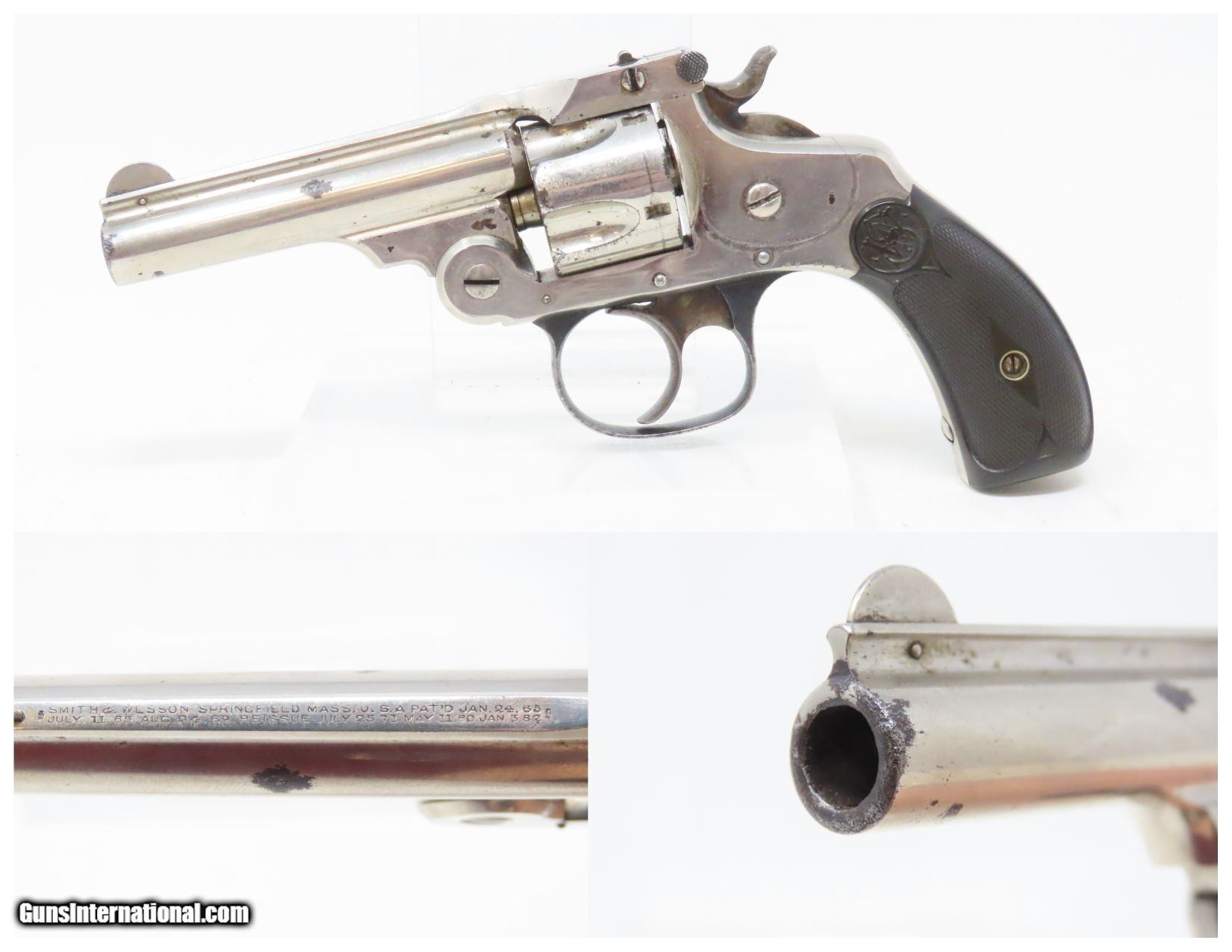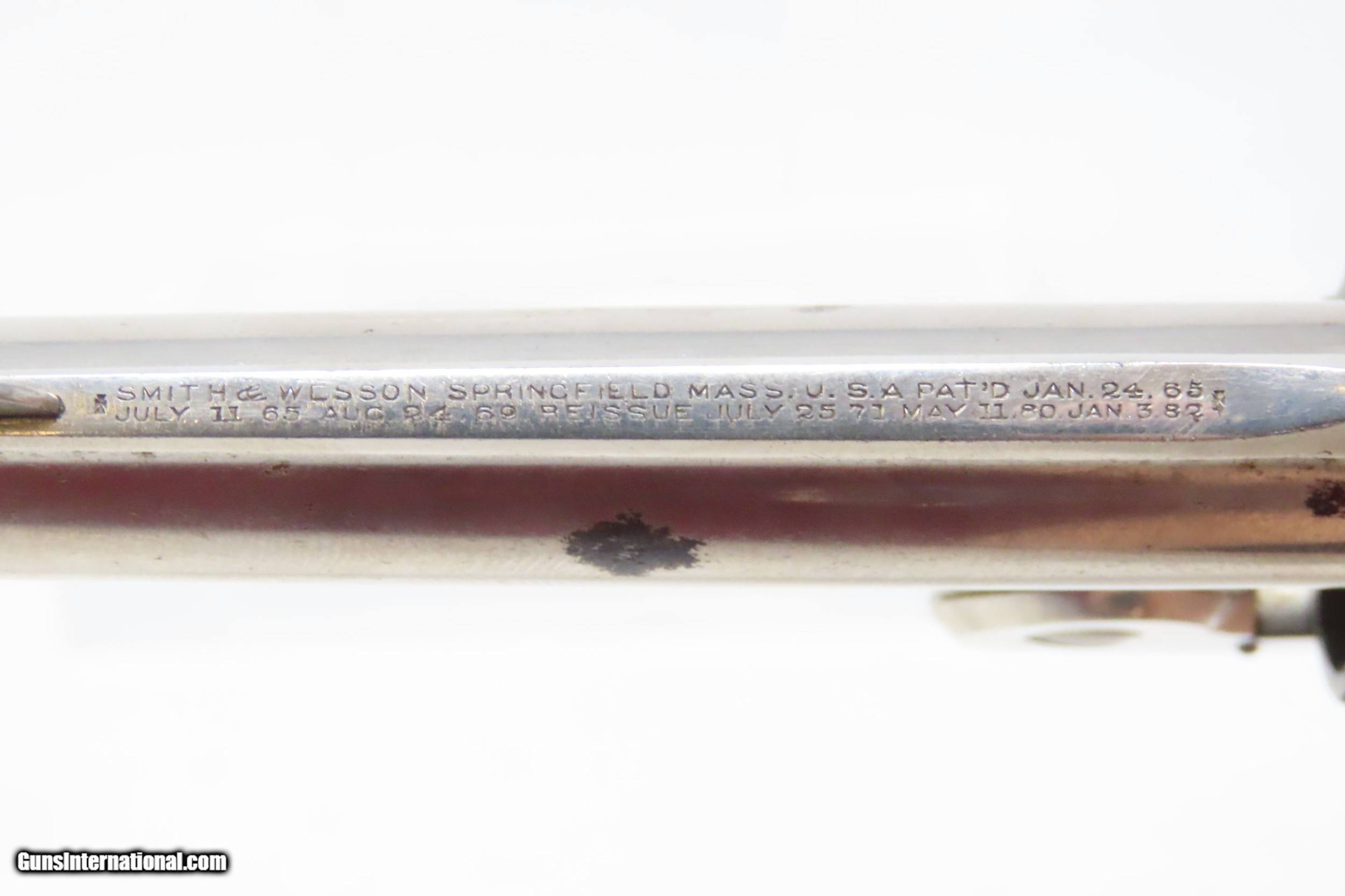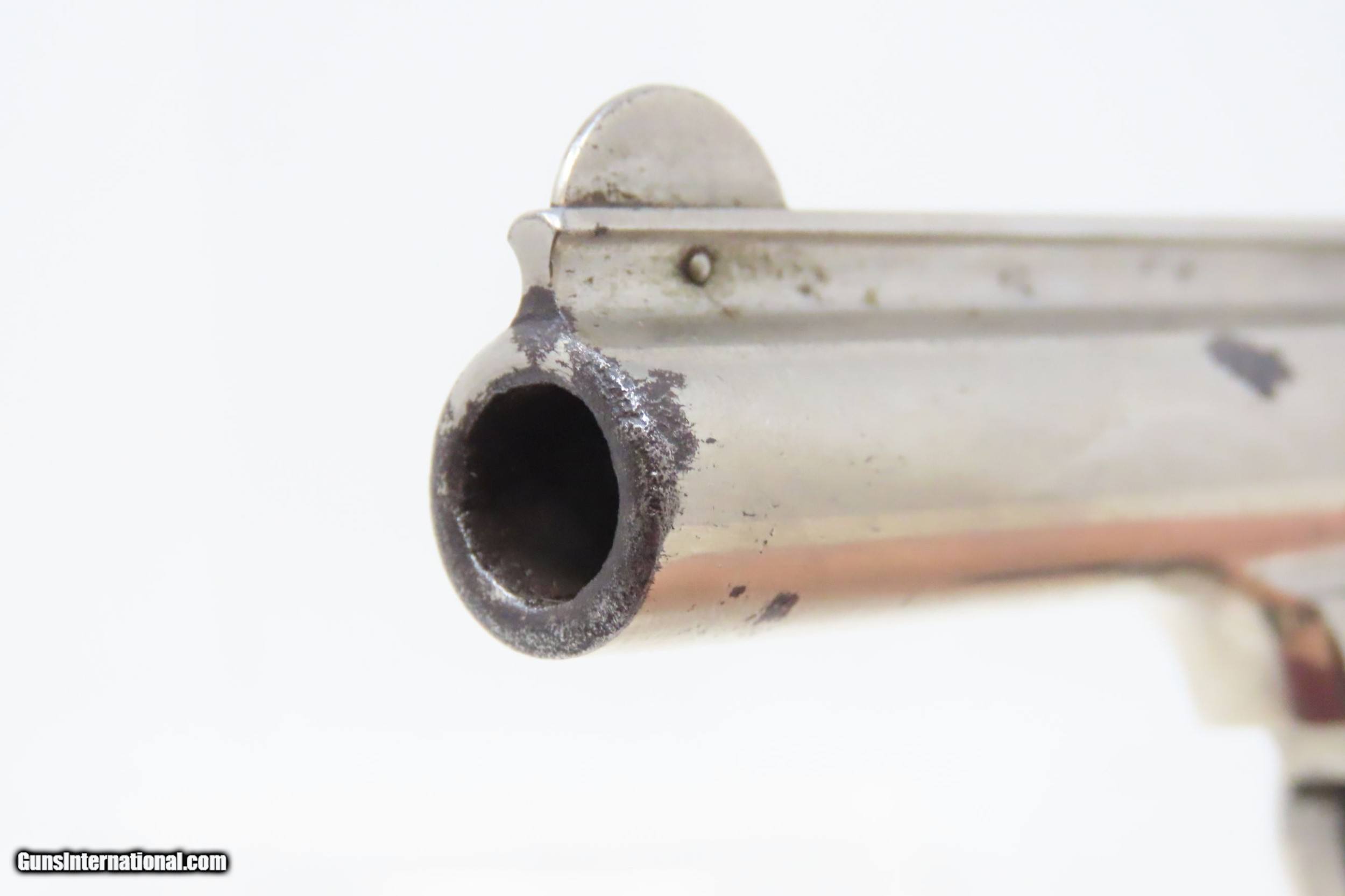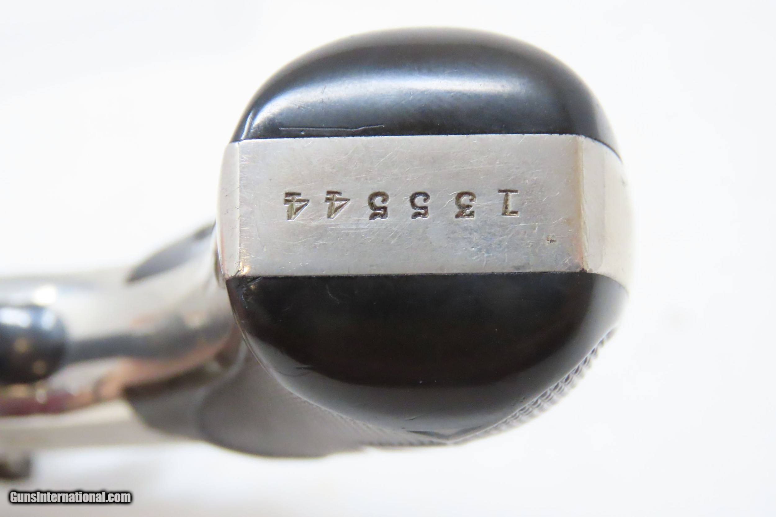 Description: SMITH & WESSON .32 Caliber 4th Model DOUBLE ACTION Top Break C&R REVOLVER Turn of the Century .32 S&W Conceal & Carry Revolver Here we present a C&R Smith & Wesson Double Action Top Break Revolver in .32 S&W, made circa the turn of the Century in Springfield, Massachusetts. The 4th model was made between 1883 and 1909 with a total of roughly 240,000 revolvers made. The fourth model ran from serial number 43,406 and continued to about 282,999. Improvements in the 4th model were in the trigger guard, and internal changes in the shape of the sear and the cylinder stop. At the end of the 4th model production about 10,000 guns of the 5th model used some parts from both. Additional barrel lengths of 8″ and 10″ were offered and sold. This would have been a nice gun to wear in a small belt holster or slip into a pocket for self-defense. Smith & Wesson, then as now, were known for their high quality revolvers. The overall condition is fine. Original finish. Excellent action. Semi-bright bore with light spots of pitting. Legible markings. Numbers match. Both grips are in fine shape with less than average wear from handling. This firearm is classified as a Curio & Relic. Barrel is 3 inches. Caliber: .32 S&W Overall condition as seen in photos. Very Fast. Very Safe. FREE SHIPPING. Will need to be sent to your local FFL or C&R licensee. This firearm is classified as a Curio & Relic. Guaranteed AUTHENTIC & Includes CERTIFICATE OF AUTHENTICITY. ancestryguns $1050 #220500 SOLD Curio/Relic: Yes |