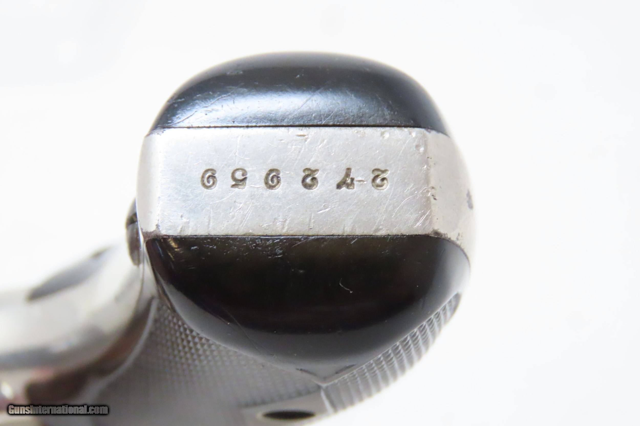 Description: SMITH & WESSON .32 Caliber 4th Model DOUBLE ACTION Top Break C&R REVOLVER Turn of the Century Revolver w/HOPKINS & ALLEN BOX Here we present a C&R Smith & Wesson Fourth Model Double Action Top Break Revolver in .32 S&W, made circa the turn of the Century in Springfield, Massachusetts. The 4th model was made between 1883 and 1909 with a total of roughly 240,000 revolvers made. The fourth model ran from serial number 43,406 and continued to about 282,999. Improvements in the 4th model were in the trigger guard, and internal changes in the shape of the sear and the cylinder stop. At the end of the 4th model production about 10,000 guns of the 5th model used some parts from both. Additional barrel lengths of 8″ and 10″ were offered and sold. This would have been a nice gun to wear in a small belt holster or slip into a pocket for self-defense. Smith & Wesson, then as now, were known for their high-quality revolvers. The overall condition is fine. Original finish. Excellent action. Bright bore. Both grips are in good shape with light handling wear. Clear markings. Numbers match. The included box is in good shape. This firearm is classified as a Curio & Relic. Barrel is 3-1/2 inches. Caliber: .32 S&W Overall condition as seen in photos. Very Fast. Very Safe. FREE SHIPPING. Will need to be sent to your local FFL or C&R licensee. This firearm is classified as a Curio & Relic. Guaranteed AUTHENTIC & Includes CERTIFICATE OF AUTHENTICITY. ancestryguns $900 #220499 SOLD Curio/Relic: Yes |