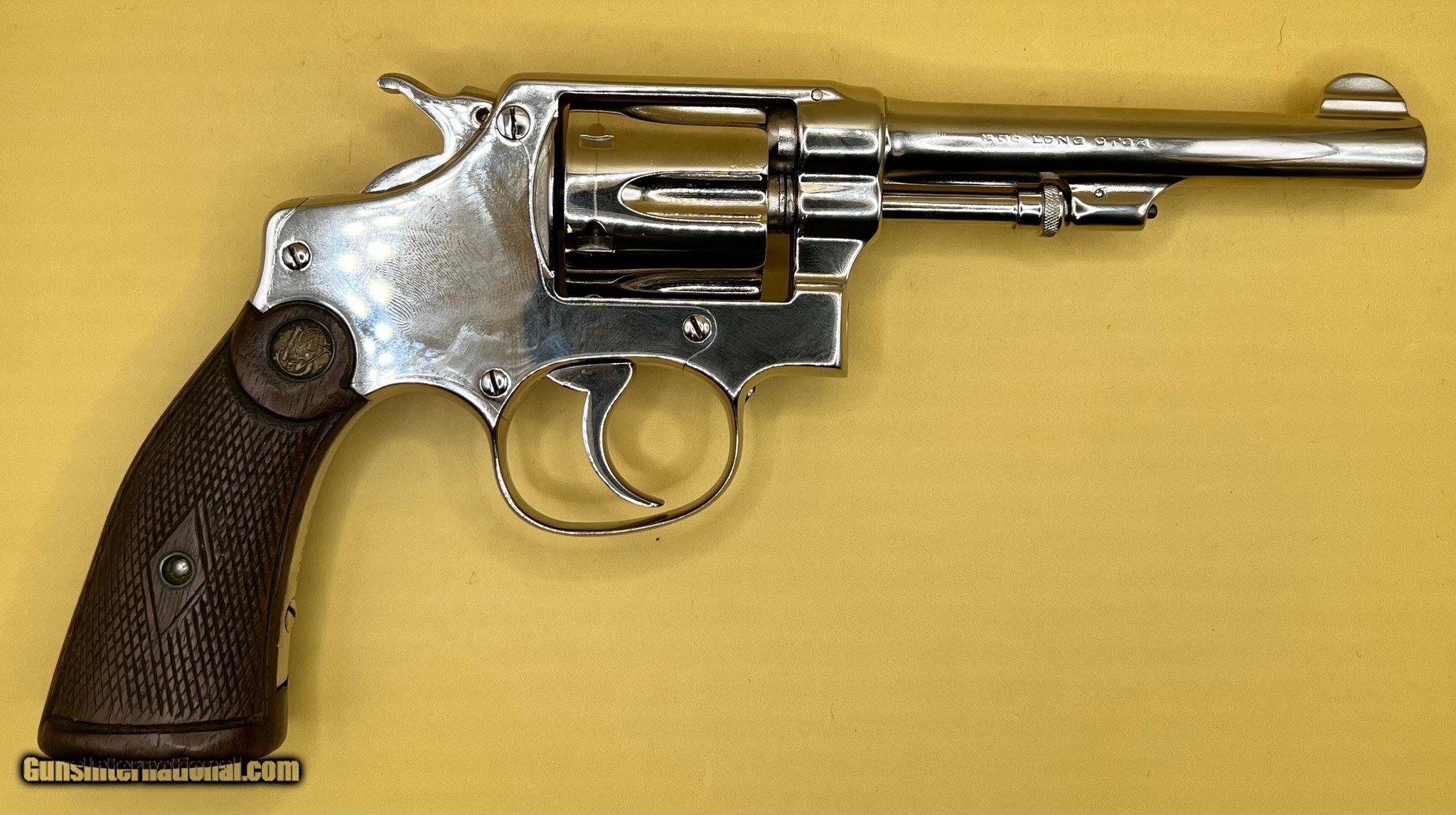 Description: Guns Listing ID: 1416384 The first revolver to be given the name was the .32 Hand Ejector Model of 1896, its year of introduction. It was made on a new frame size called the I-frame, which had been designed for a new cartridge, the .32 S&W Long. Smith & Wesson lengthened the case of the .32 S&W by 1/8 inch to increase its powder capacity, and this required a slightly larger frame SOLD Manufacturer: SMITH & WESSON Model: 32 HAND EJECTOR Caliber Info: .32 S&W Condition: Used - Non-Certified Barrels: 4 BARREL Finish: NICKEL |