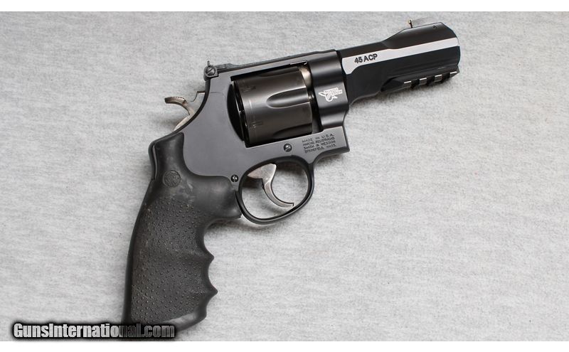 Description: Excellent, light wear, few small scratches. Comes with hard case and box. Smith & Wesson Performance Center large frame S&W .45 Auto caliber revolver, 4" barrel with full underlug and pic rail for accessory mounting. Adjustable sights, smooth double action trigger, S&W hard rubber grips. .45 Auto SOLD Chambers: Revolver Metal Condition: Excellent Wood Condition: Grips are excellent Bore Condition: Bright Barrels: 4 Triggers: Double and single action Fore End: Rail for accessory mounting Butt Pad: Factory grips Sights: Adjustable Item Location: La Vista, NE |