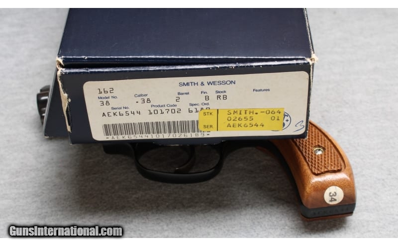 Description: Excellent condition, few light wear and handling marks, comes with original box. Classic S&W "snub nose" revolver, polished blue finish, 2" barrel, fixed sights, shrouded hammer and S&W checkered wood grips. A great choice for S&W collectors. .38 Special SOLD Chambers: Revolver Metal Condition: Excellent Wood Condition: Grips are excellent Bore Condition: Bright Barrels: 2 Triggers: Double action and single action Butt Pad: Wood grips Sights: Fixed sight channel Item Location: La Vista, NE |