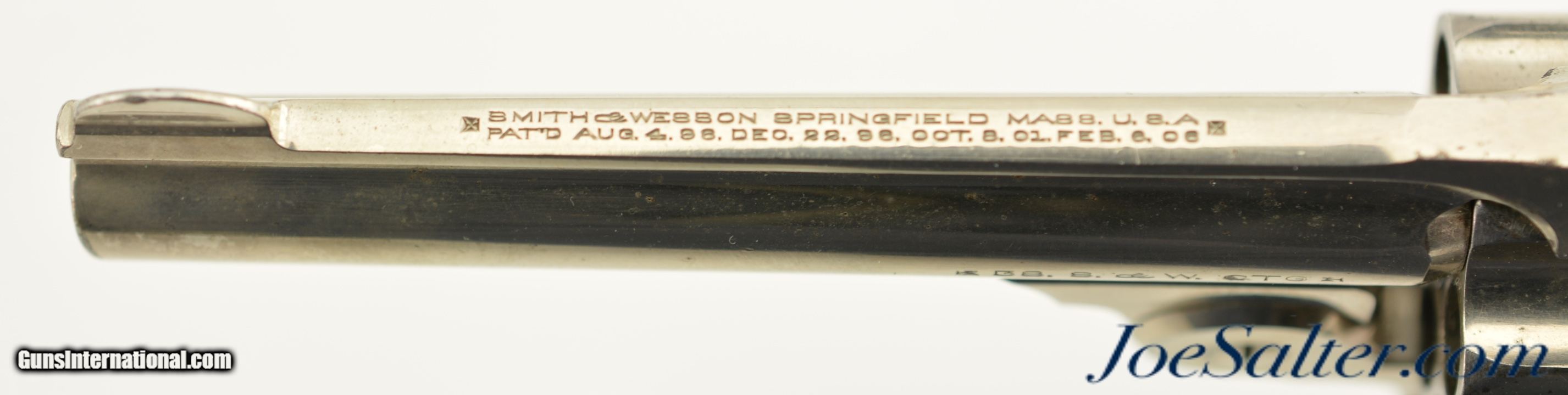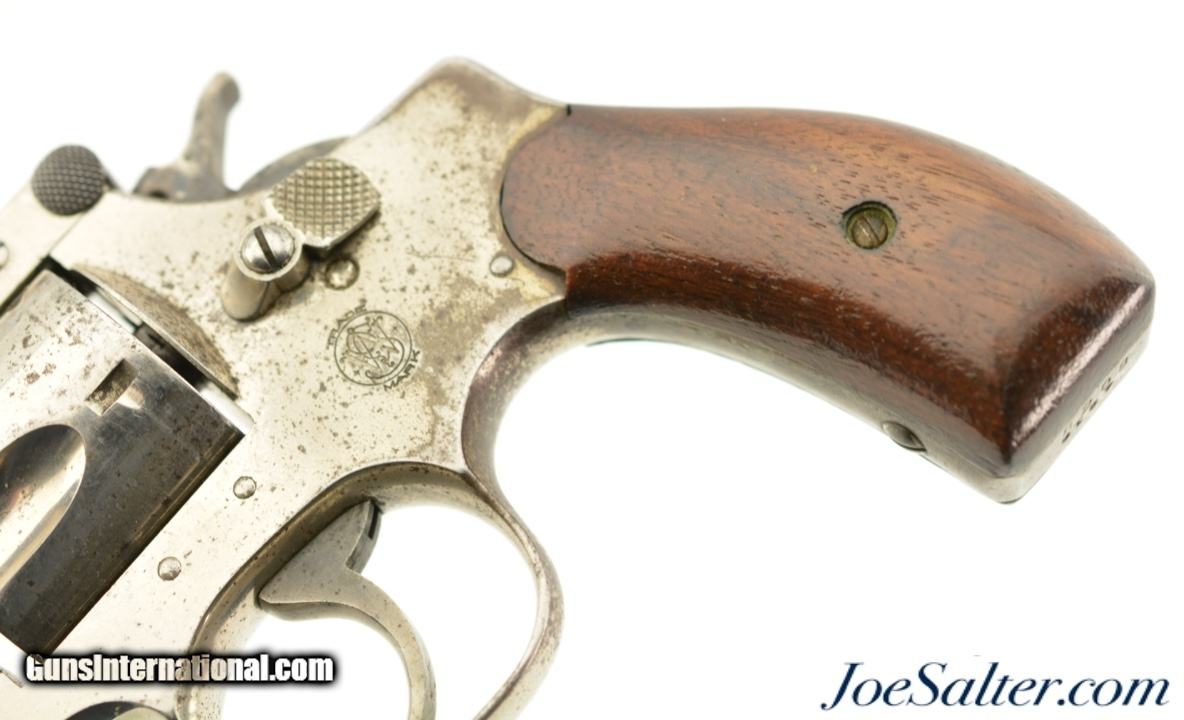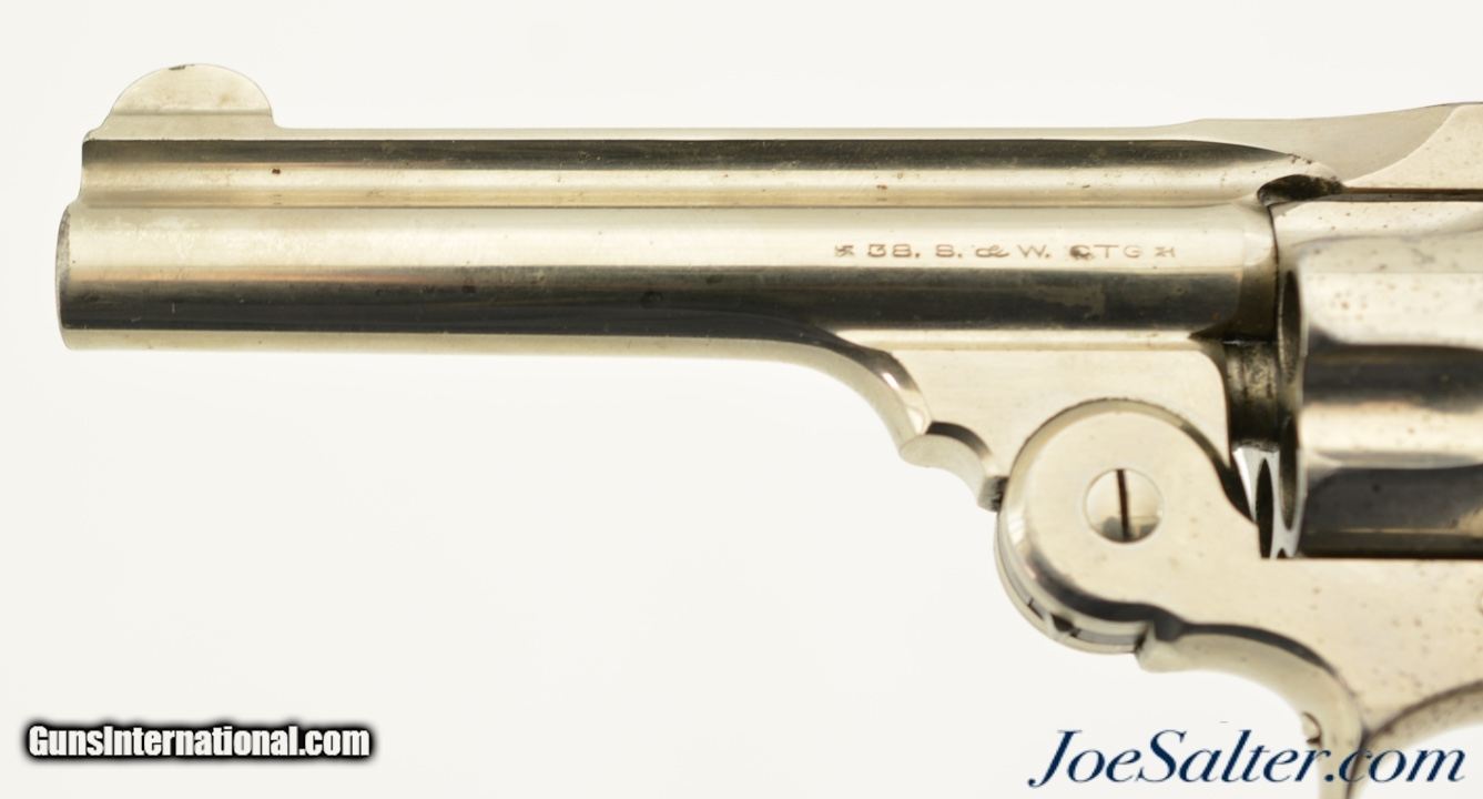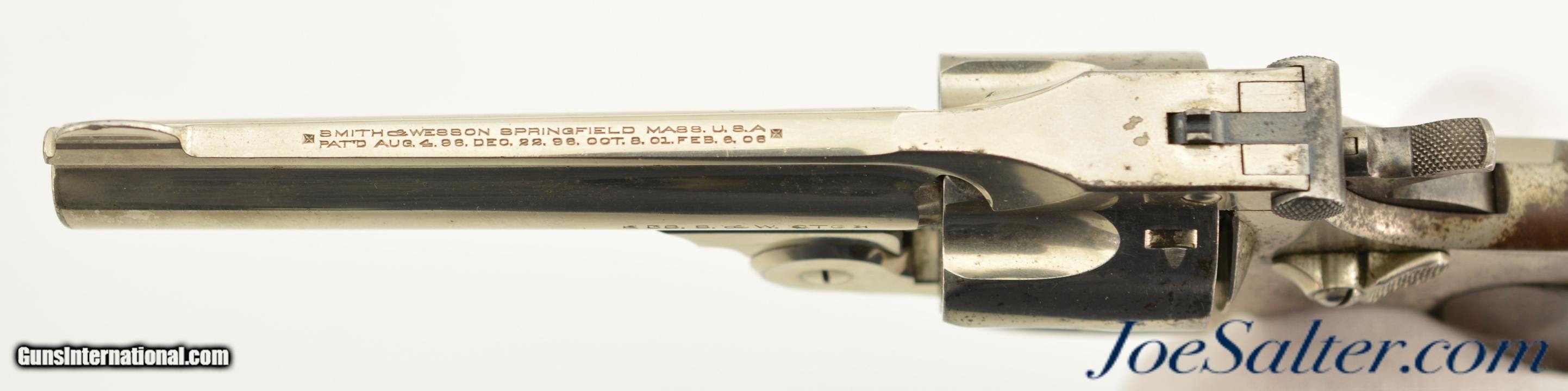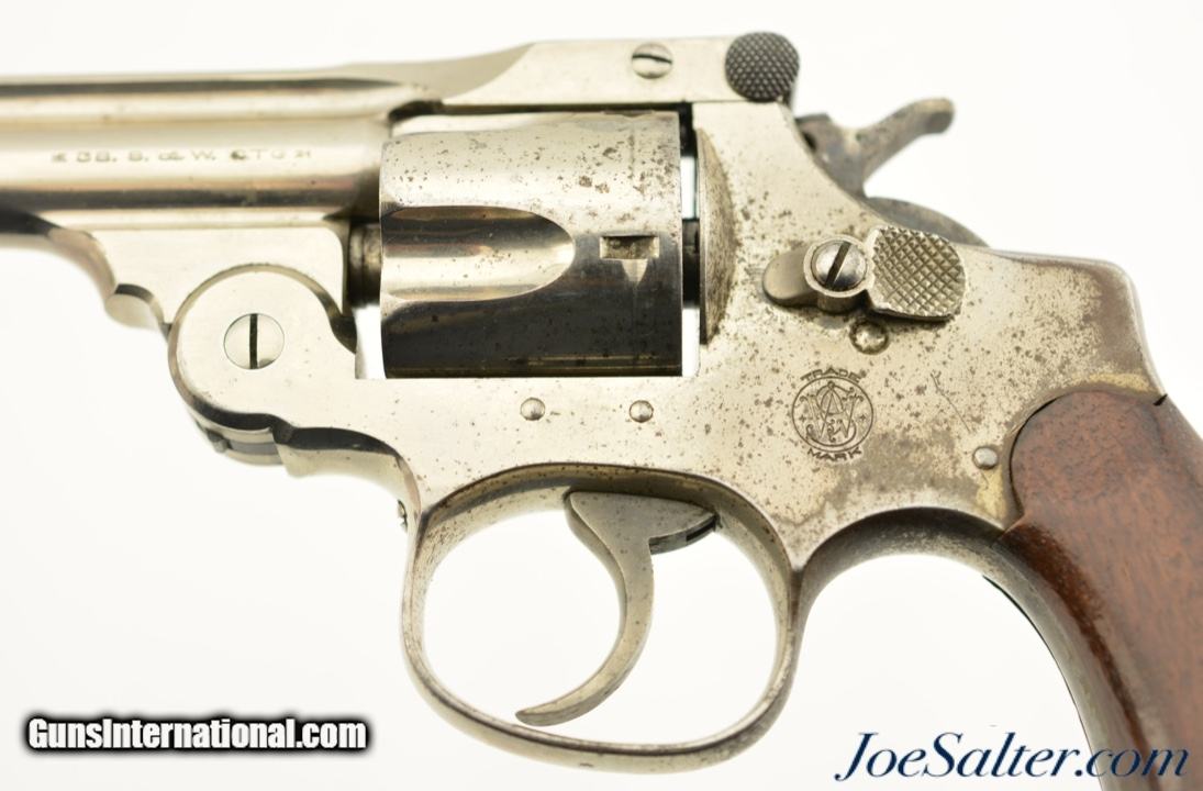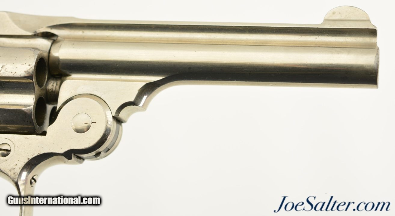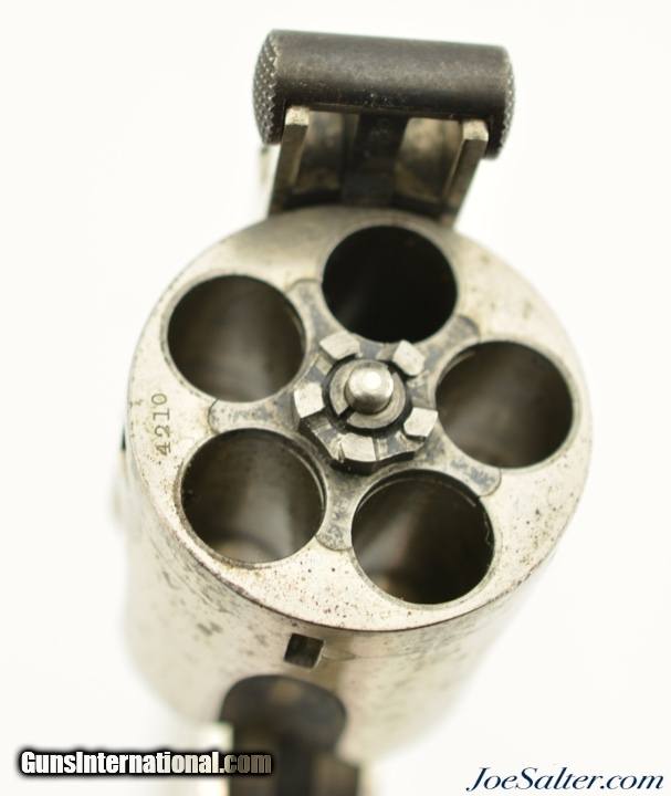 Description: Serial #4210, .38 S&W, 4 inch round ribbed barrel with integral front sight and a very fine bore showing some light pitting just forward of the breech with strong rifling. This is the .38 Double Action Perfected model manufactured by Smith & Wesson from 1909-1920 and represents the last of the top break revolvers featuring both a top latch and side thumb release. This model was also the only one to have the side plate located on the right side of the frame. The nickel plated revolver is in near excellent overall condition with the barrel, frame, and cylinder retaining about 85-90% of the original finish with most of the loss on the grip strap and frame. The hammer and trigger show muted original case color. The plain, unmarked walnut grips appear original to the gun and rate about excellent with some light use marks and finish loss. Mechanically it functions properly with tight lock up having only the slightest of vertical barrel movement. C&R SOLD |