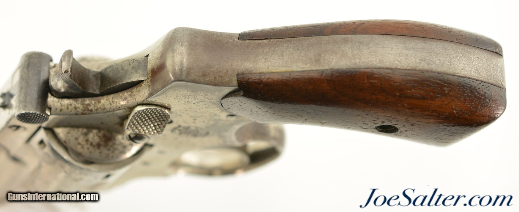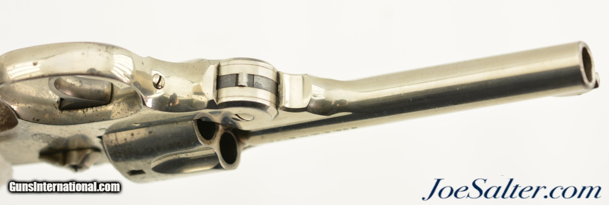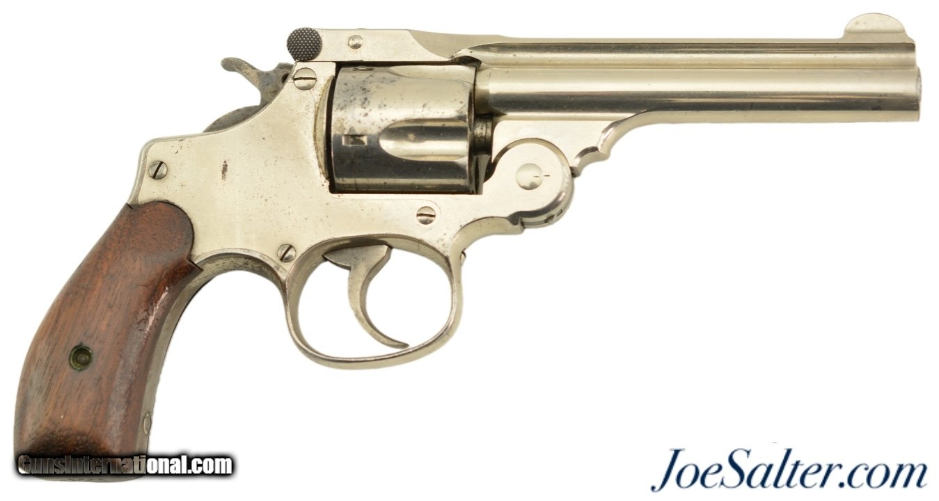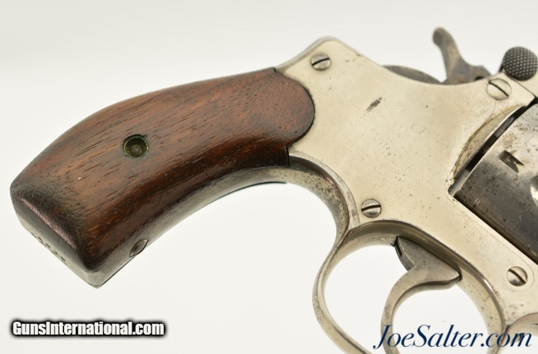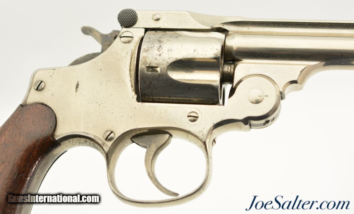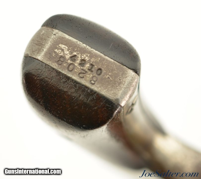 Description: Serial #4210, .38 S&W, 4 inch round ribbed barrel with integral front sight and a very fine bore showing some light pitting just forward of the breech with strong rifling. This is the .38 Double Action Perfected model manufactured by Smith & Wesson from 1909-1920 and represents the last of the top break revolvers featuring both a top latch and side thumb release. This model was also the only one to have the side plate located on the right side of the frame. The nickel plated revolver is in near excellent overall condition with the barrel, frame, and cylinder retaining about 85-90% of the original finish with most of the loss on the grip strap and frame. The hammer and trigger show muted original case color. The plain, unmarked walnut grips appear original to the gun and rate about excellent with some light use marks and finish loss. Mechanically it functions properly with tight lock up having only the slightest of vertical barrel movement. C&R SOLD |