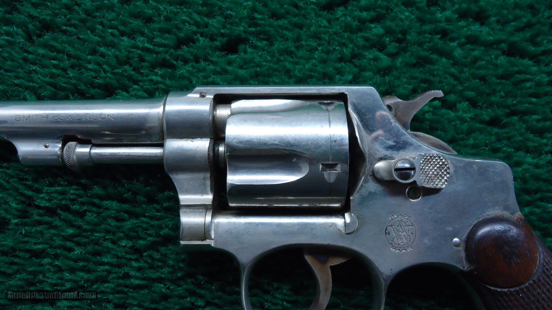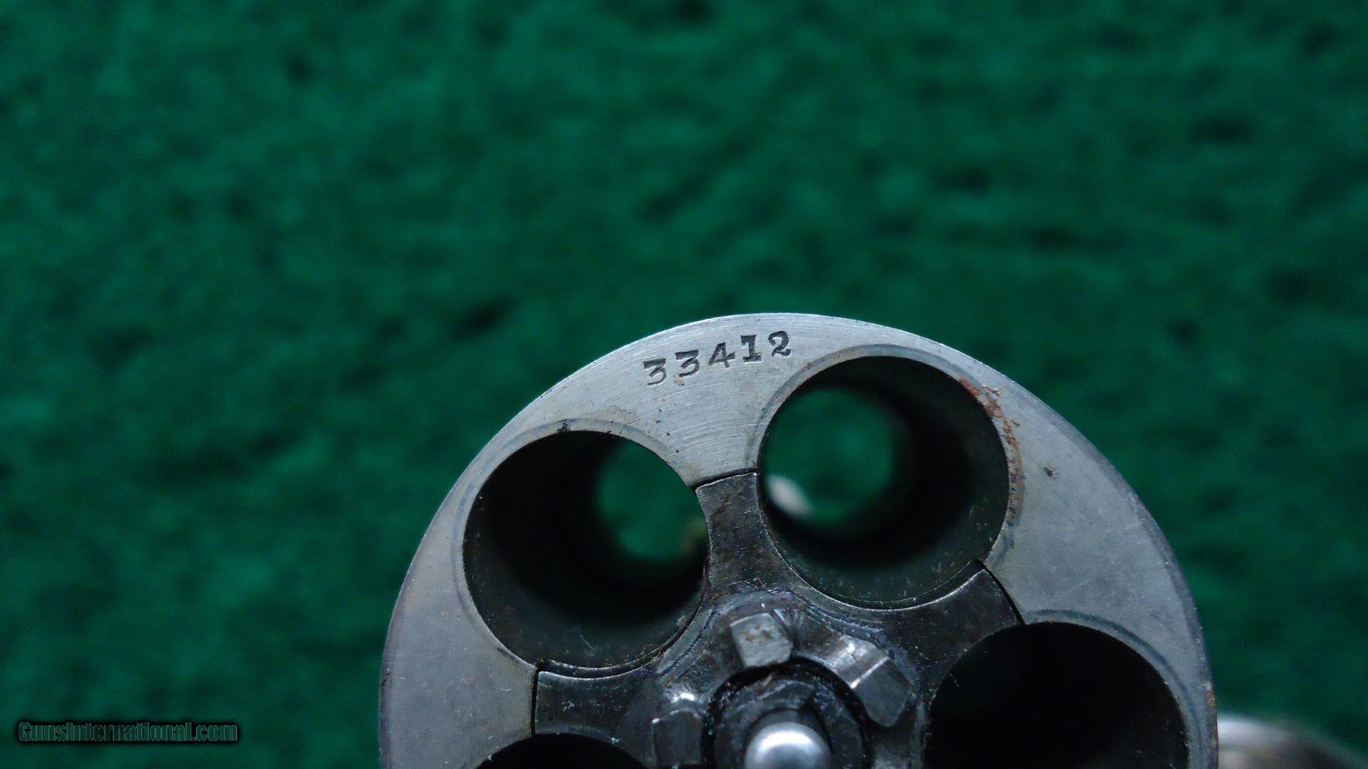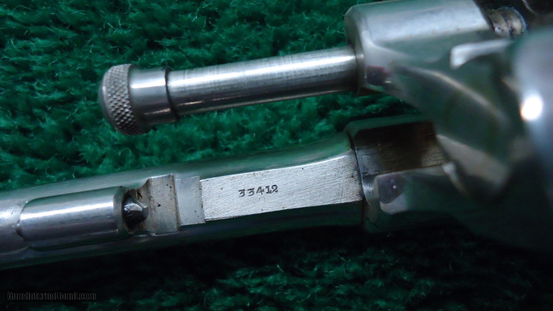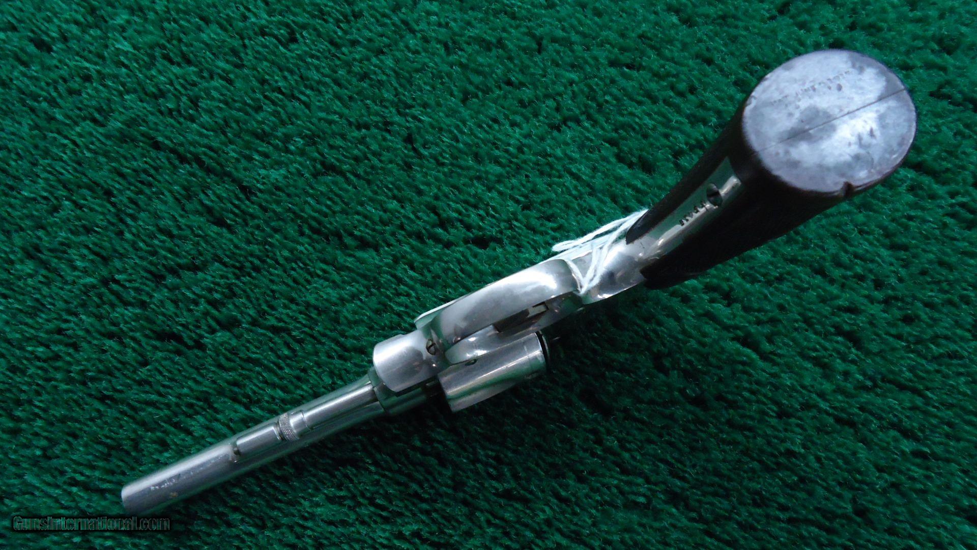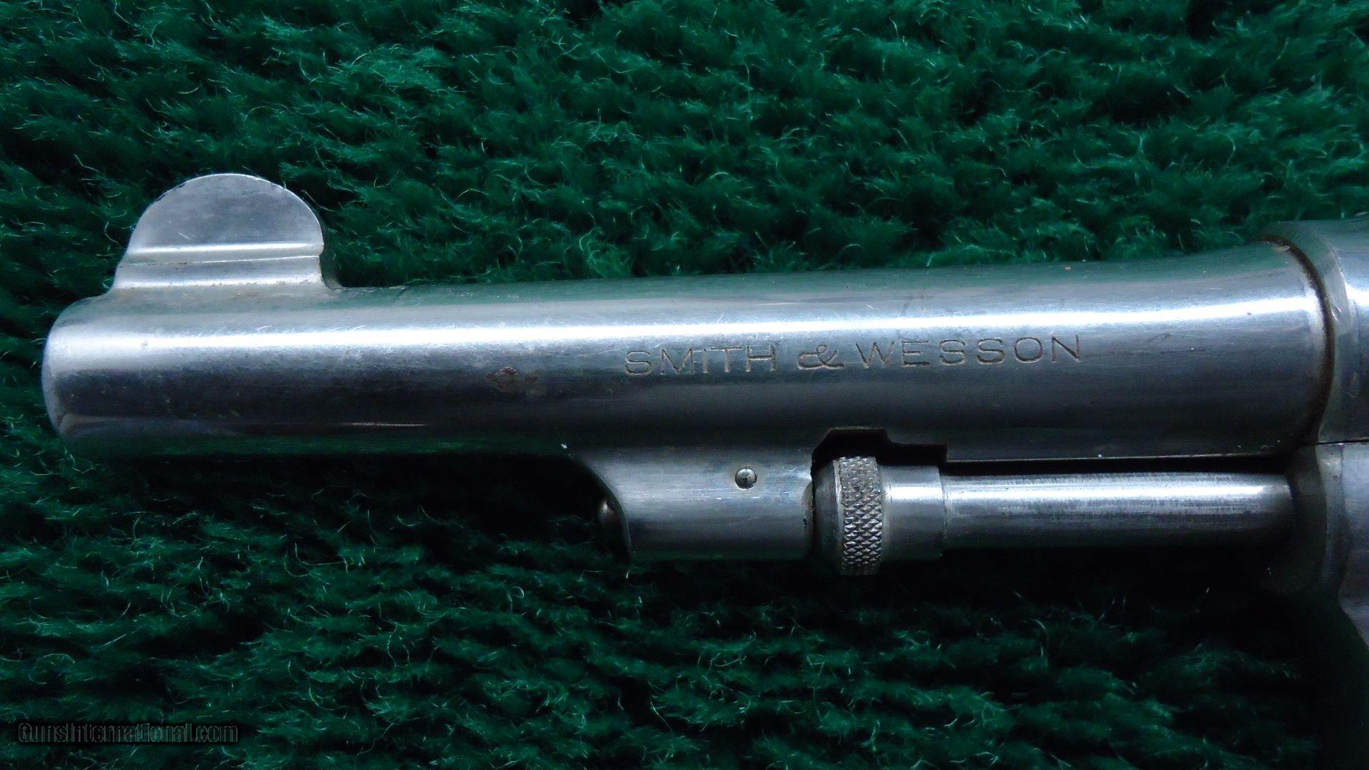 Description: 4 inch round barrel chambered in 38 S&W caliber. 5-shot fluted cylinder. Most all of the original nickel remains. Good shiny bore with strong rifling. Traces of case color on the hammer and trigger. Crisp action. Original checkered walnut grips are numbered to the gun and stamped on bottom of grips "Pat. June 5 1917" are in condition with only slight wear. These were made between 1917-1940. This one was made about 1930. Leroy Merz Antique Firearms specializes in antique and vintage Winchesters and other fine American firearms. Since 1965 Mr. Merz has taken part in the world of firearms and has been a contributor to many well known reference books. Just recently we mailed the 128th edition of our privately-published catalog. We have hundreds of additional guns in every price range at our home online. Search for Merz Antiques in google. SOLD Curio/Relic: Yes |