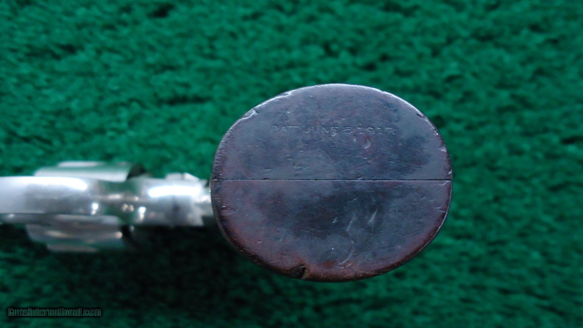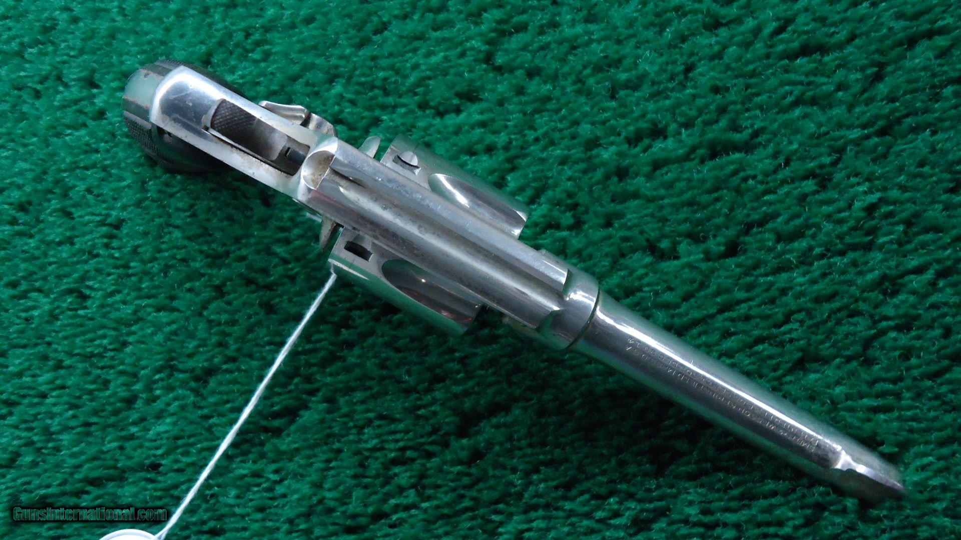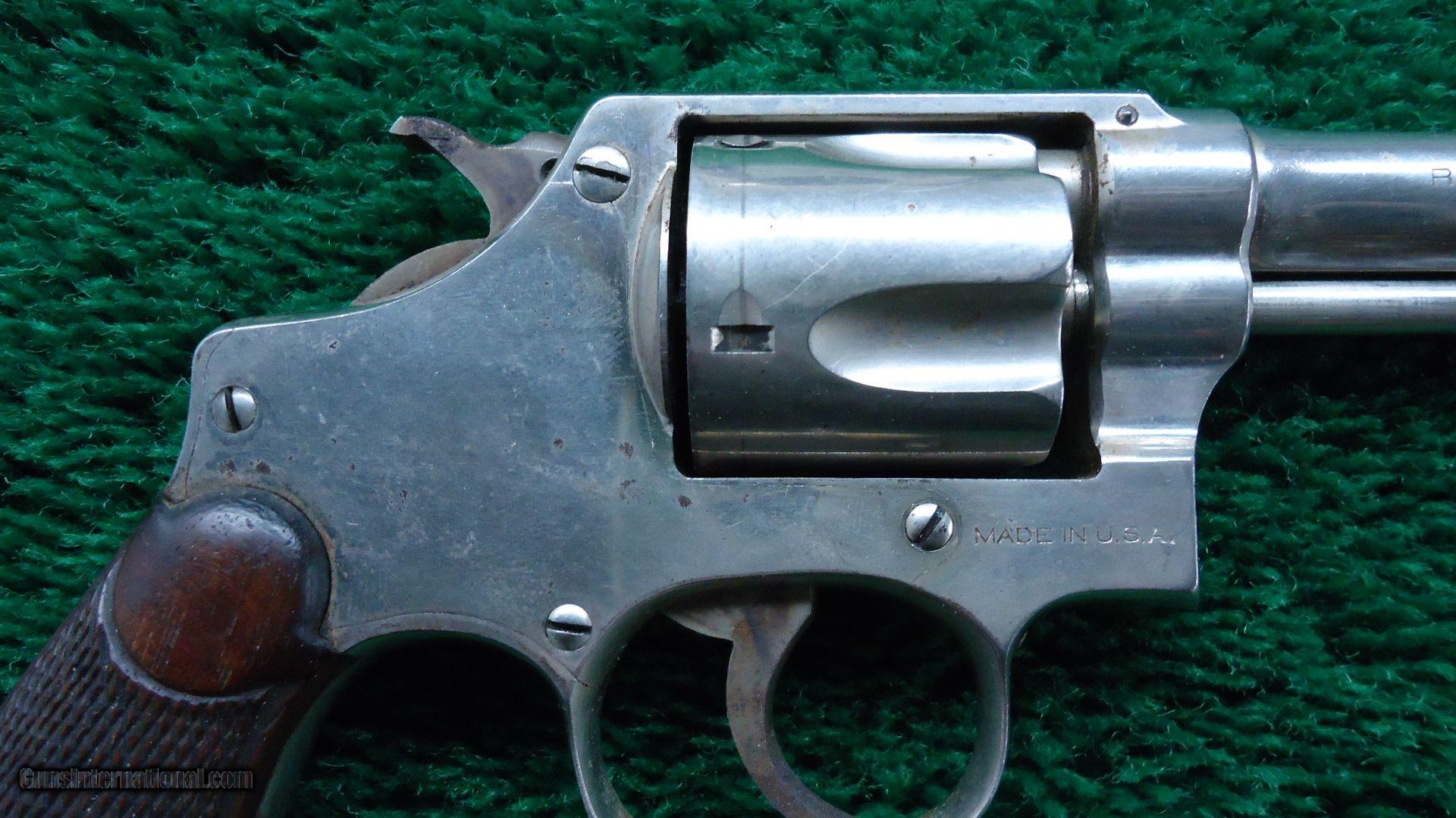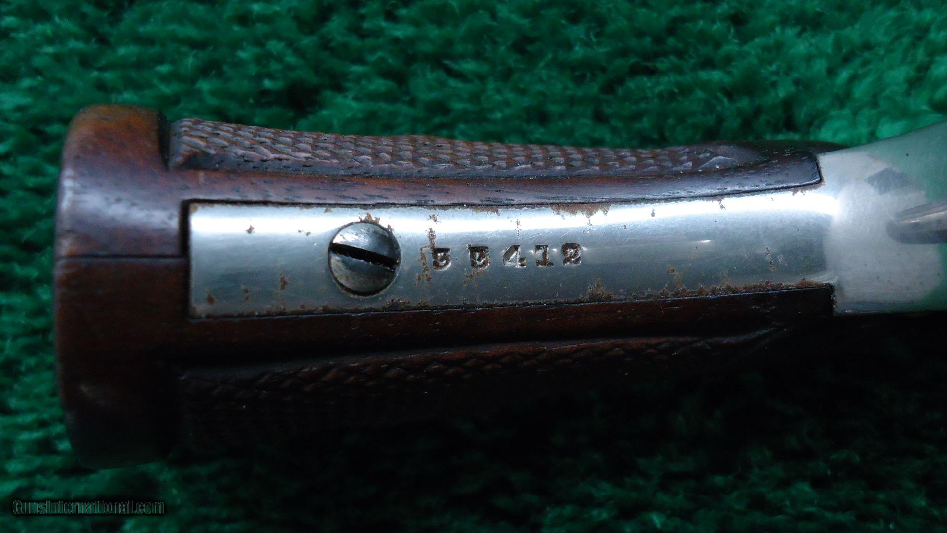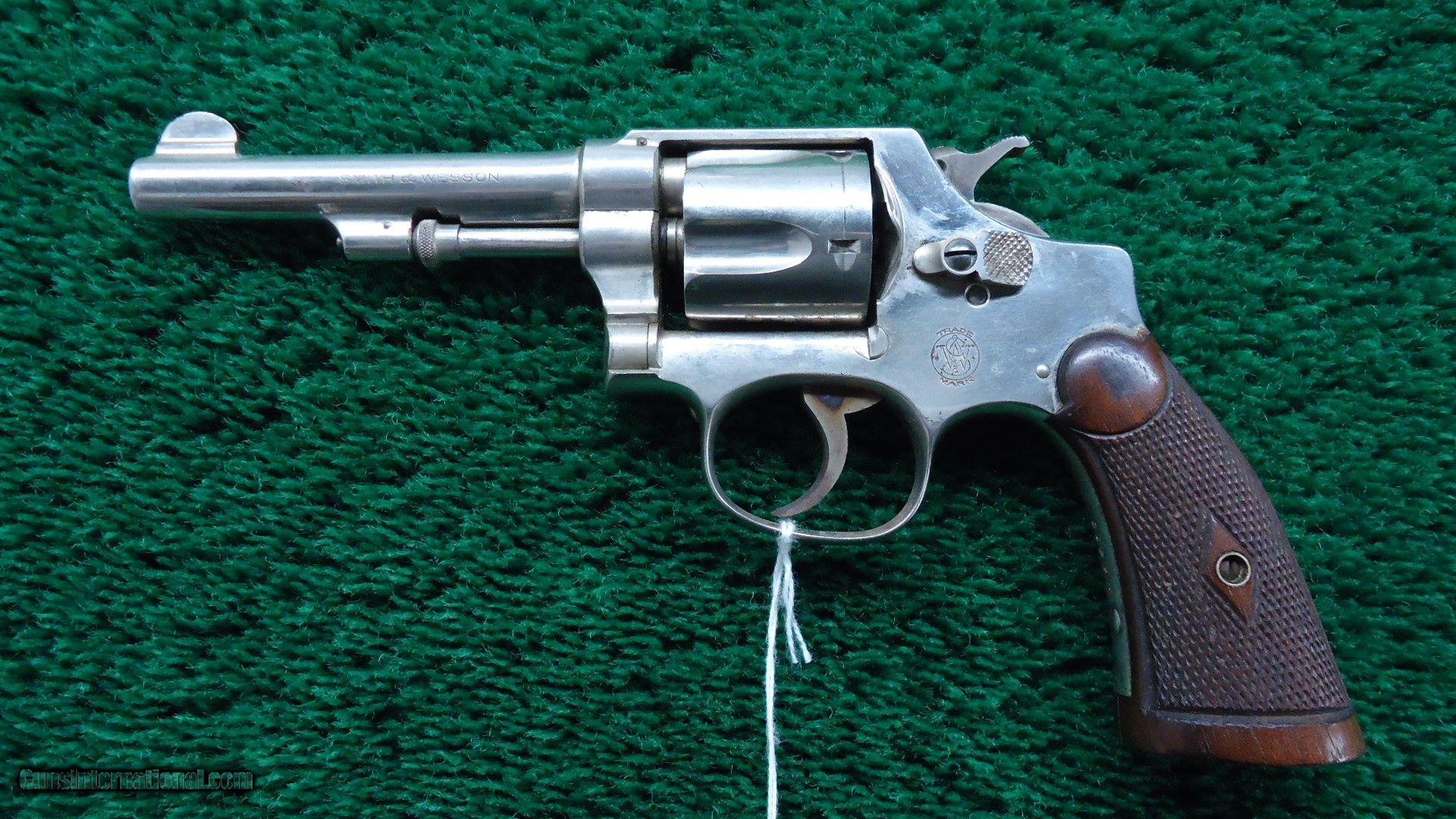Description: 4 inch round barrel chambered in 38 S&W caliber. 5-shot fluted cylinder. Most all of the original nickel remains. Good shiny bore with strong rifling. Traces of case color on the hammer and trigger. Crisp action. Original checkered walnut grips are numbered to the gun and stamped on bottom of grips "Pat. June 5 1917" are in condition with only slight wear. These were made between 1917-1940. This one was made about 1930. Leroy Merz Antique Firearms specializes in antique and vintage Winchesters and other fine American firearms. Since 1965 Mr. Merz has taken part in the world of firearms and has been a contributor to many well known reference books. Just recently we mailed the 128th edition of our privately-published catalog. We have hundreds of additional guns in every price range at our home online. Search for Merz Antiques in google. SOLD Curio/Relic: Yes |