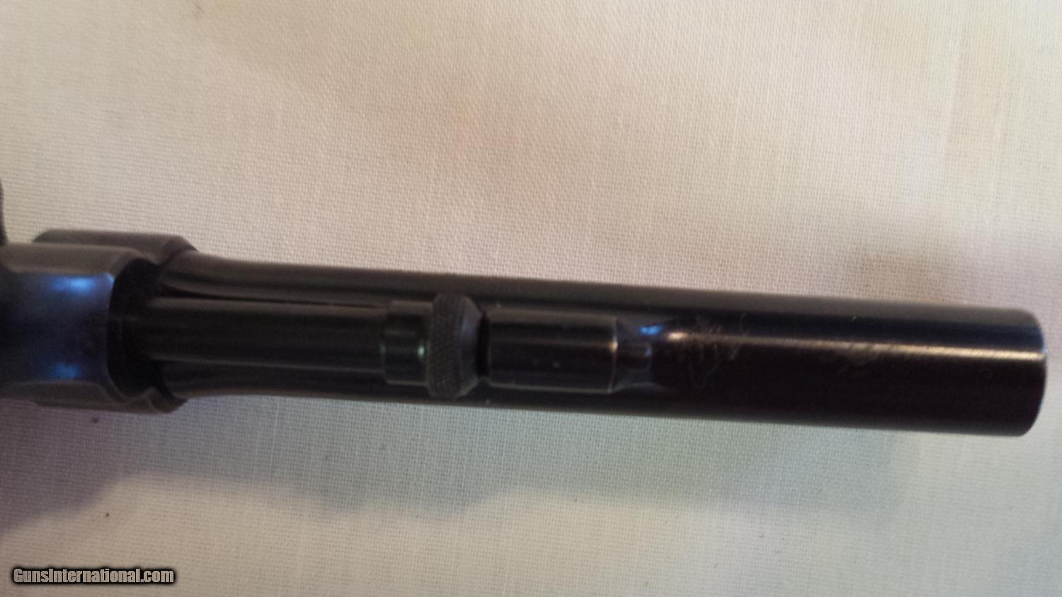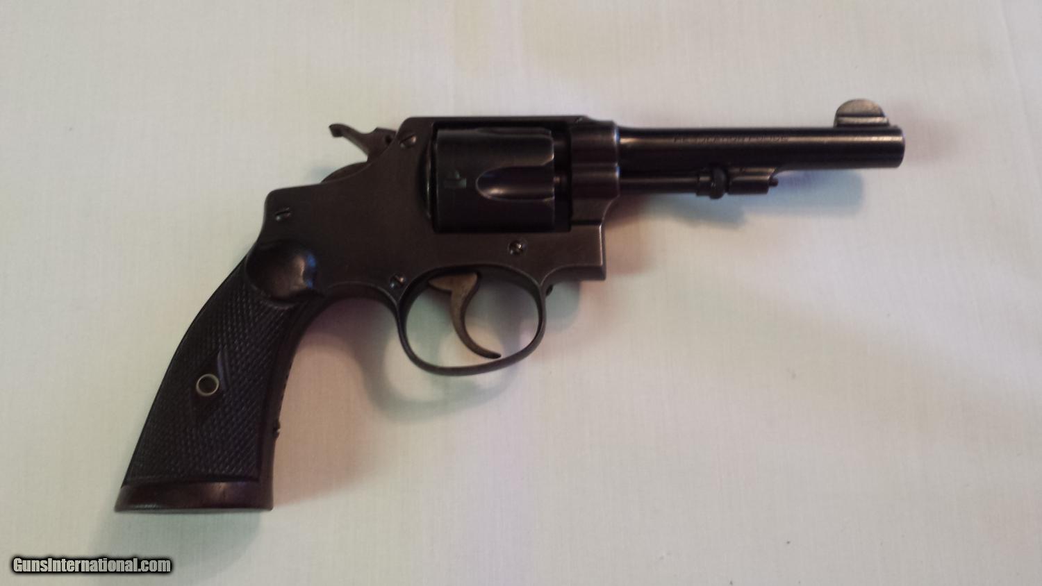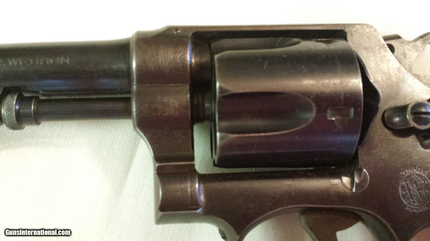 Description: Smith & Wesson Regulation Police .38 S & W CTG with a 4 inch barrel with walnut grips, This is a Pre-war five- screw I- -frame, with a pinned barrel. All serial #s match, on the front tang and forstrap and on the cylinder. On the bottom of the grips Pat. Jun 5 1917 is stamped in the wood. Smith & Wesson is marked on the left side of the barrel, on the right in 2 lines it is marked Regulation Police with 38 S & W CTG on the 2nd line. The firearm is in good condition with light swirls on the bluing. There is a small 1/8 in diameter mark on the bluing in front of the trigger guard on the right. Buyer pays all shipping costs. Please call or email with questions. SOLD Curio/Relic: Yes Manufacturer: Smith & Wesson Serial Number: 216XX |