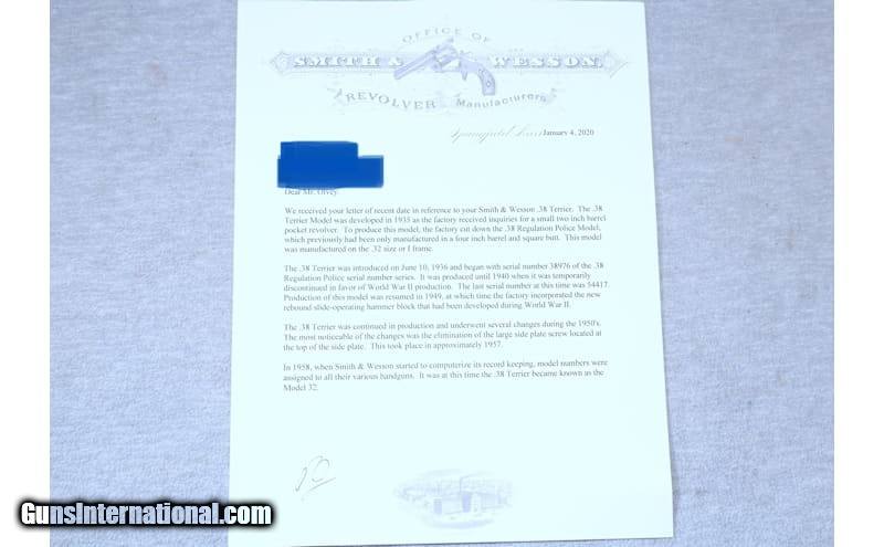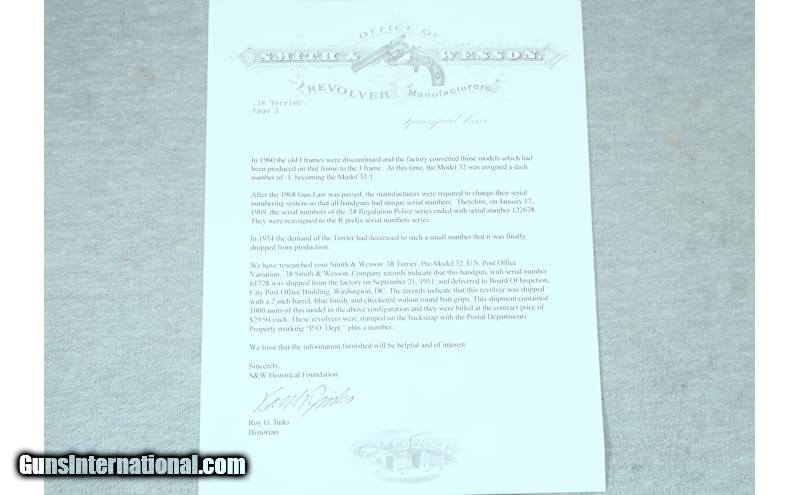 Description: Smith & Wesson .38 Terrier (Pre-32) .38 S&W This has some neat history as it was issued to the post office in 1951. Comes with a post office holster and a letter from the Smith & Wesson Historical Foundation detailing the history of the gun. The letter goes in deep detail and says the gun originally was shipped to the post office in Washington D.C. Pistol is in great shape. Picture of the letter in photos. .38 S&W SOLD Metal Condition: very good Wood Condition: very good Bore Condition: bright Barrels: 2" pinned barrel Butt Pad: wood grips Weight: 1 lb Sights: factory sights Item Location: La Vista, NE |