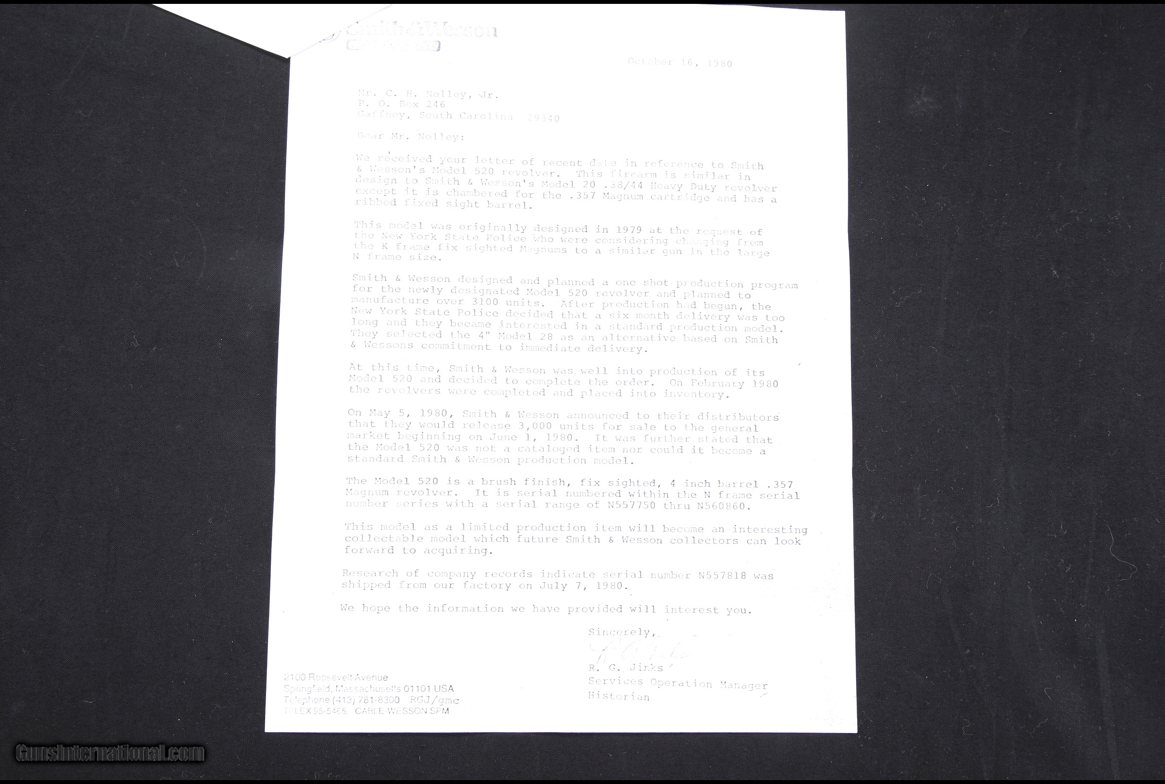Description: "Box, paperwork, tools. Hang tag likely from original sale. SOLD Manufacturer: Smith & Wesson Model: 520 (Ordered by New York State Police, but never adopted. 1 of 3,100 made) Serial Number: N558122 Caliber Info: 357 Magnum Barrels: 4 inches |