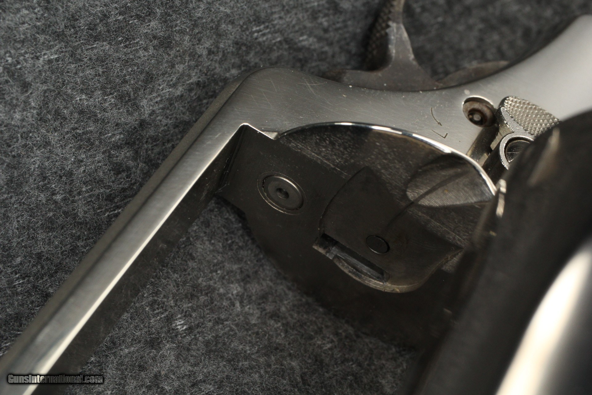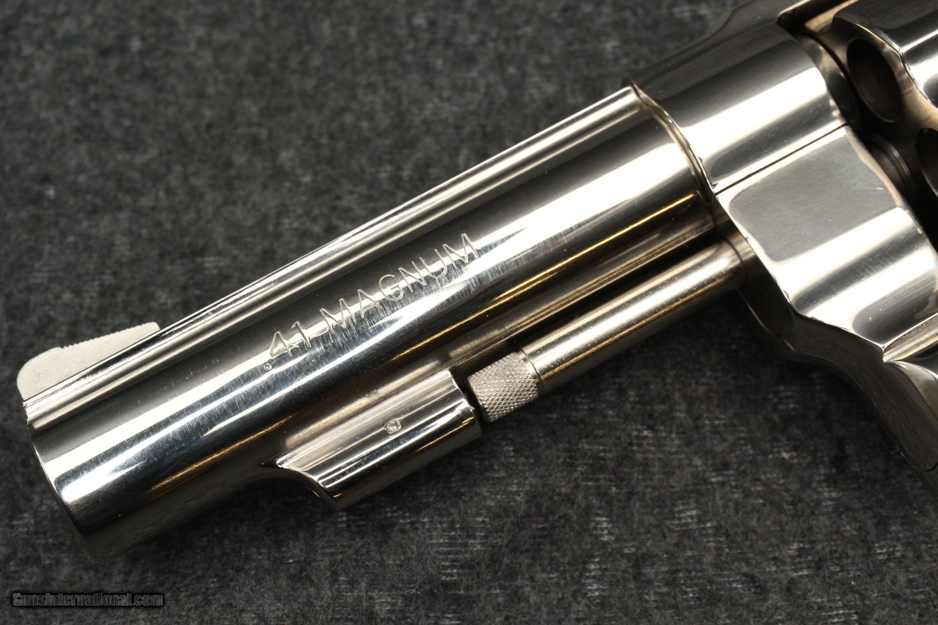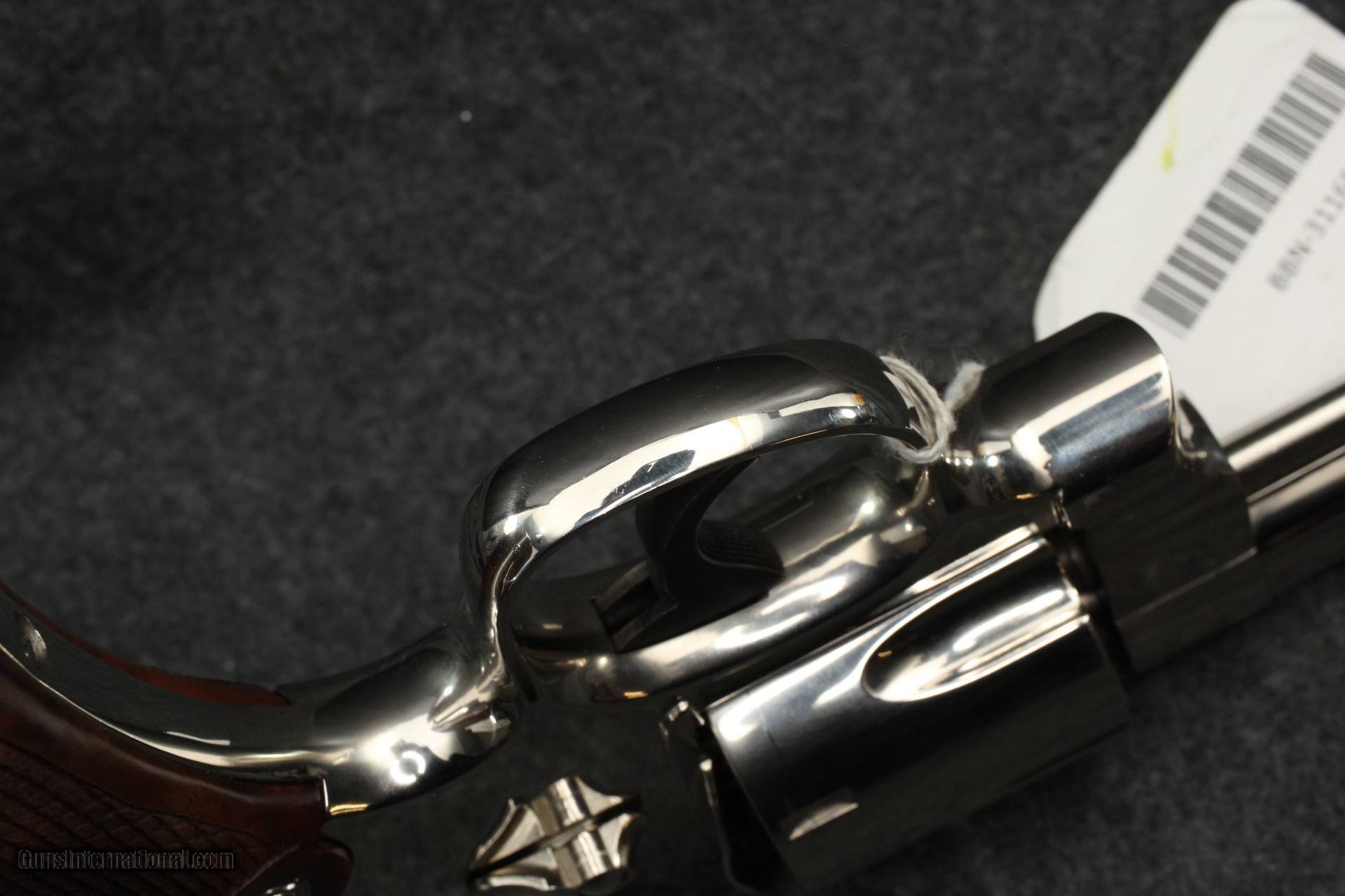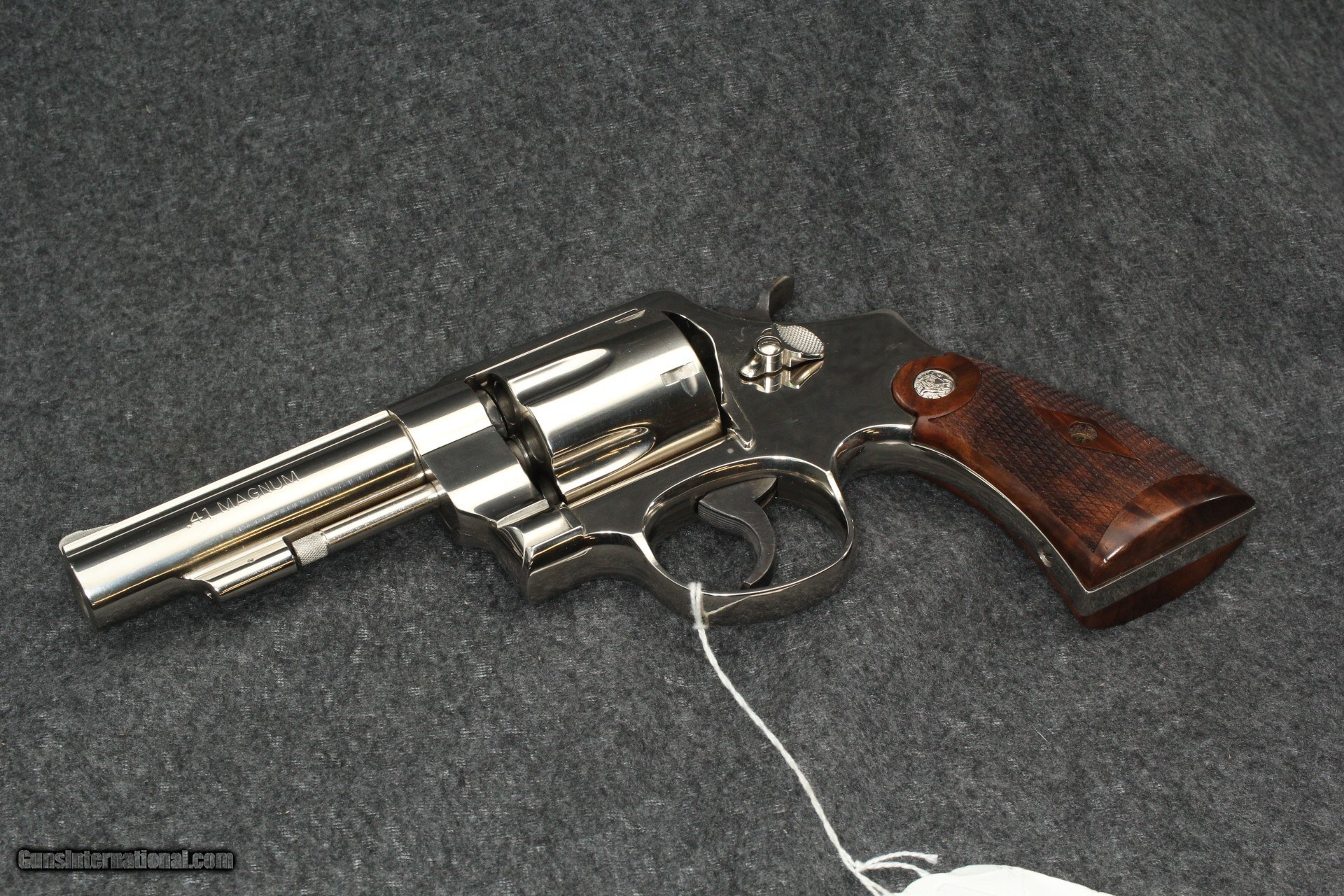 Description: 41 Mag, serial number CNP56XX. 4' barrel, square butt, factory nickel finish. Lock. Overall in excellent condition. Grips are excellent, very little to no wear. Metal is excellent, no flaking in finish. Very light cylinder ring. Bore and cylinders are excellent. Gun is possibly unfired. Does not have factory box. More photos on request. Please add $40.00 for shipping and insurance. SOLD Handgun Caliber: .41 Remington Magnum |