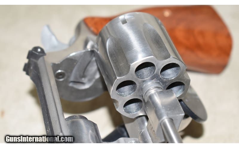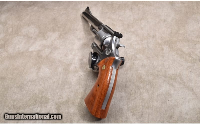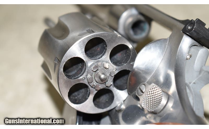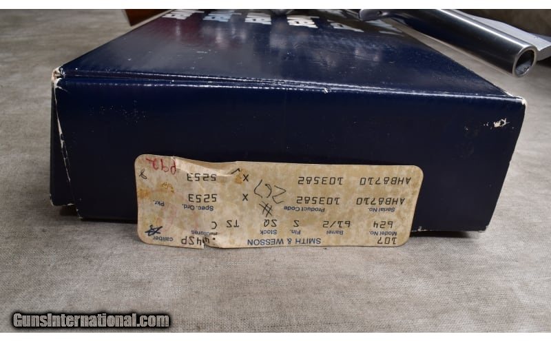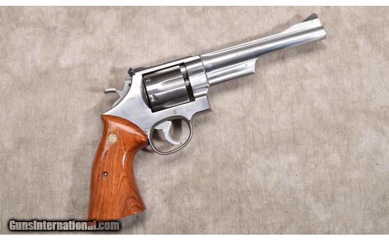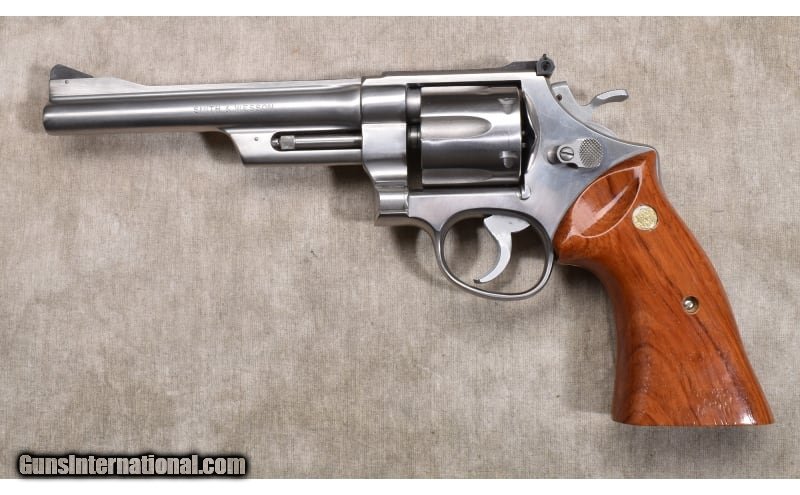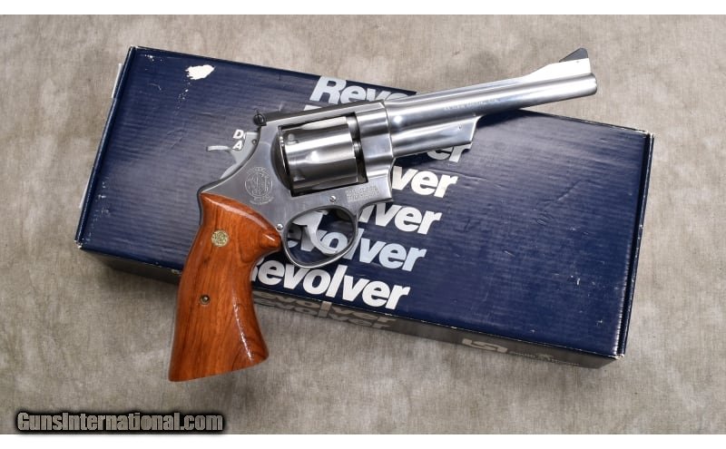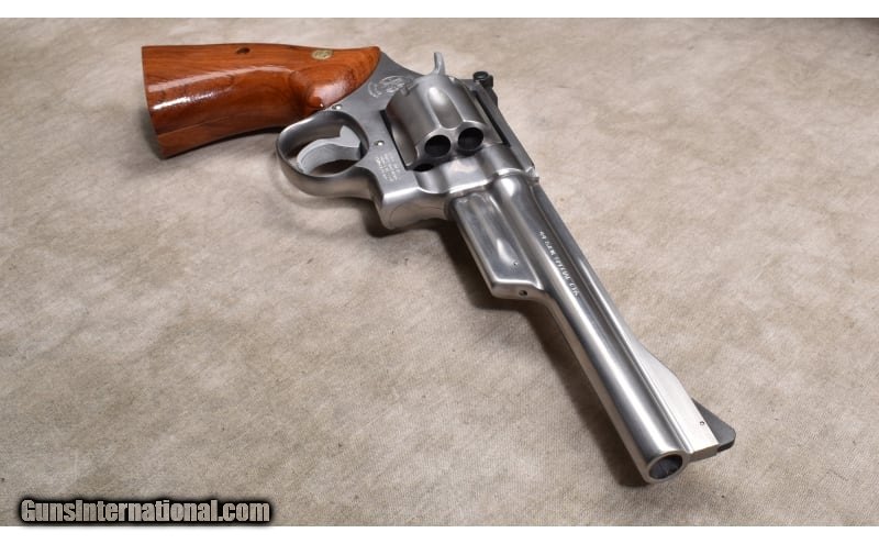 Description: This all-stainless steel revolver features hand-filling walnut grips, adjustable sights, knurled trigger/hammer, and 66-1/2 inch barrel. The pistol appears unfired and would suitable for all purposes. .44 S&W Special SOLD Chambers: 6 rounds Metal Condition: Excellent. Wood Condition: Excellent. Bore Condition: Shiny and bright with good rifling. Barrels: 6-1/2 inch Triggers: Factory double/single action trigger. Butt Pad: Smooth walnut oversize grips with S&W medallions. Weight: 43 oz Sights: Serrated ramp and adjustable notch. Item Location: Rogers |
