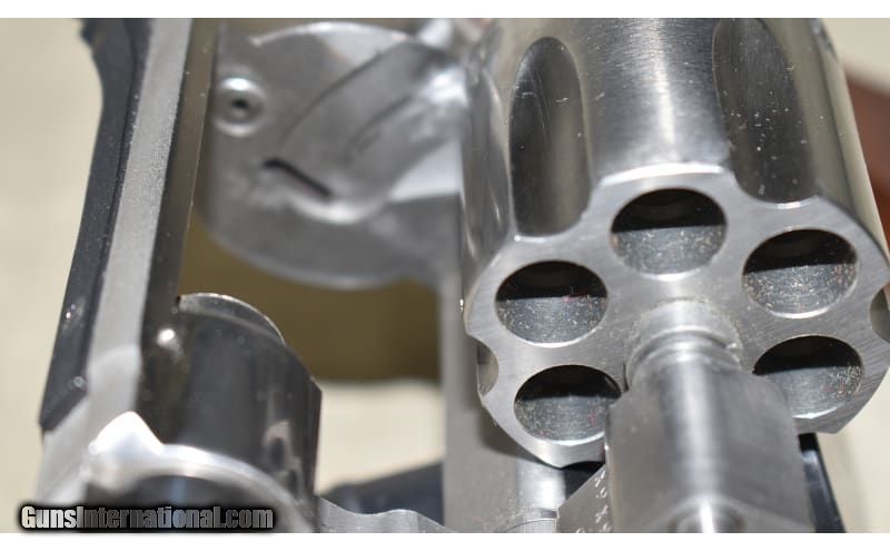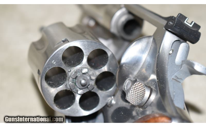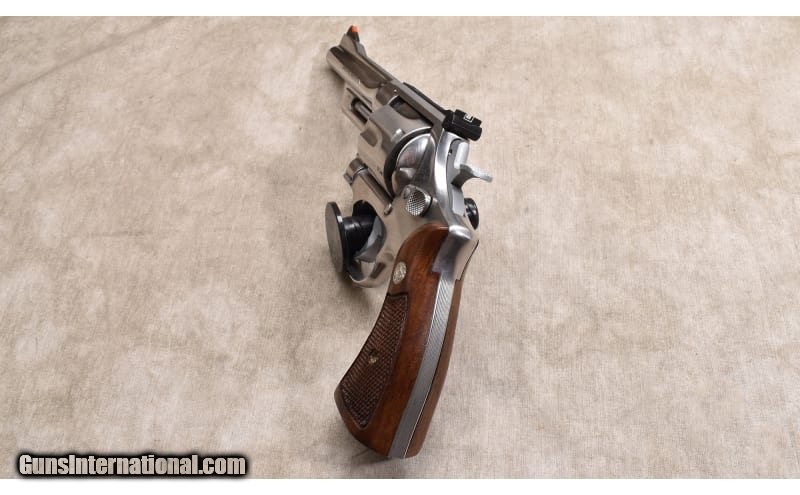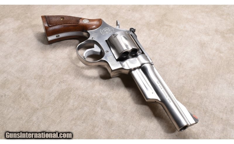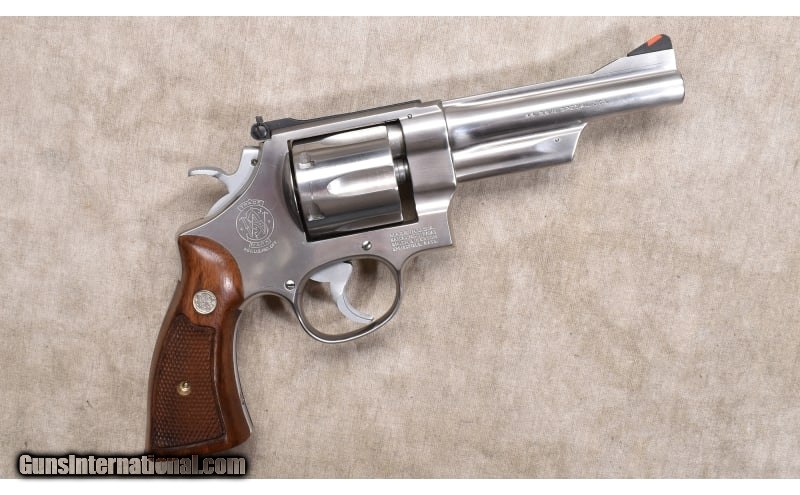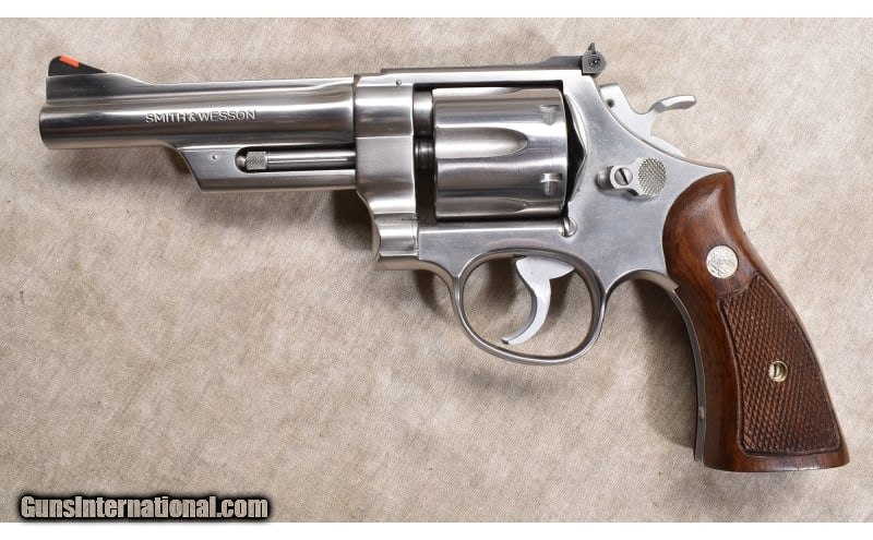 Description: This all-stainless steel revolver features a wide grooved trigger, a wide knurled hammer, slim but hand-filling walnut grips, adjustable target sights, and a comfortable 5-inchbarrel. It would be a suitable choice for target, self-defense, and even light hunting. It is in excellent and apparently unfired condition. .44 S&W Special SOLD Chambers: 6 rounds Metal Condition: Excellent. Wood Condition: Excellent. Bore Condition: Shiny and bright with good rifling. Barrels: 5-inch Triggers: Wide and grooved factory Double and Single action trigger. Butt Pad: Checkered walnut with S&W medallions Weight: 39 oz Sights: "Serrated ramp with red insert, adjustable notch rear sight. Item Location: Rogers |