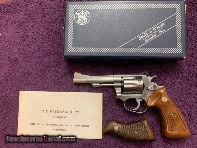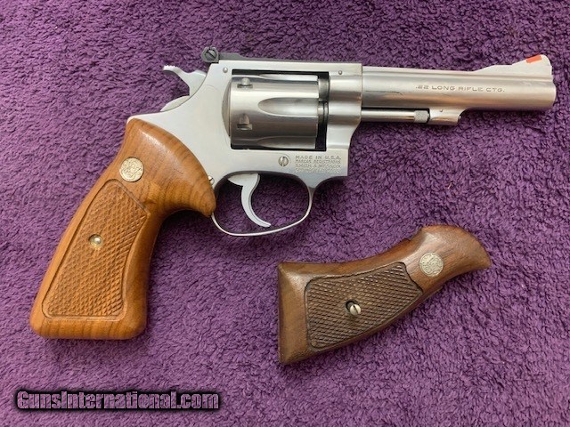 SMITH & WESSON 63 NO DASH, 4” STAINLESS, 22 LR., TARGET & REGULAR GRIPS, LIKE NEW IN THE BOX