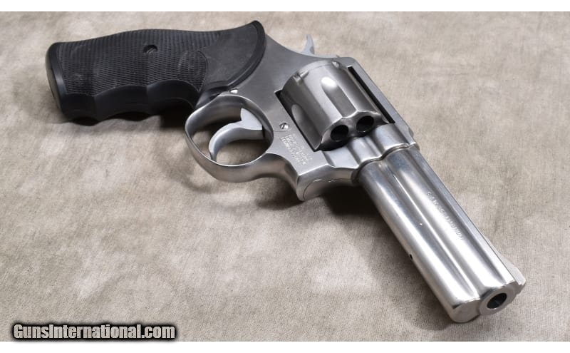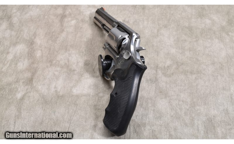 Description: This 4-inch service revolver features combat style grips, 4-inch barrel, and fixed sights. It shows a bit of firing residue on the cylinder face but mostly shows little use. .357 Magnum SOLD Chambers: 6 Metal Condition: Excellent. Wood Condition: Excellent. Bore Condition: Shiny and bright with good rifling. Barrels: 4-inch Triggers: Factory double and single action trigger. Butt Pad: Black rubber combat style finger groove grips. Weight: 41 oumces Sights: Serrated ramp with red insert and top-strap groove. Item Location: Rogers |