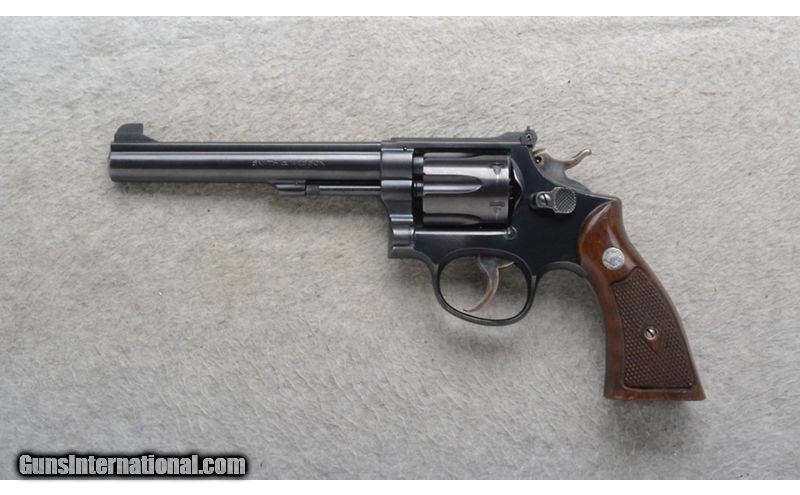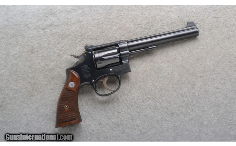 Description: This Smith & Wesson Double Action Model is a 6 shot revolver in .38 Special Cal. It has a 6 inch barrel. A blade front sight and an adjustable notch rear sight. The grip is a diamond checkered walnut with silver S&W medallions. S/N K144557. .38 Special SOLD Chambers: 6 shot. Metal Condition: Excellent. Wood Condition: Excellent. Bore Condition: Excellent. Barrels: 6 inch. Triggers: SA/DA Weight: 36 oz. Sights: Blade front. Adjustable notch rear. Item Location: Richfield, WI |