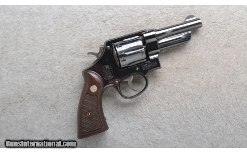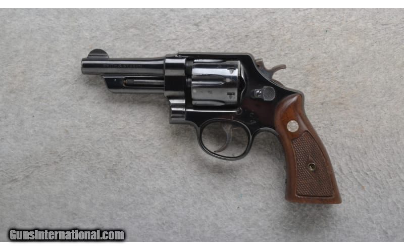 Description: This Smith & Wesson revolver is a double action model in .38 Special Cal. It has a 4 inch barrel. A blade front sight and a notch rear sight. The grip is a diamond checkered walnut with a silver S&W Medallion. .38 Special SOLD Chambers: 6 shot. Metal Condition: "Good. Has some blue wear spots, minor handling marks and minor freckling. Wood Condition: Good. Light wear/use. Bore Condition: Very Good. Barrels: 4 inch. Triggers: SA/DA Weight: 40 Oz. Sights: Blade front. Notch rear. Item Location: Richfield, WI |