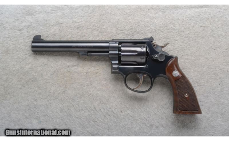 Description: This Smith & Wesson Double Action Model is a 6 shot revolver in .38 Special Cal. It has a 6 inch barrel. A blade front sight and an adjustable notch rear sight. The grip is a diamond checkered walnut with silver S&W medallions. S/N K144557. .38 Special SOLD Chambers: 6 shot. Metal Condition: Excellent. Wood Condition: Excellent. Bore Condition: Excellent. Barrels: 6 inch. Triggers: SA/DA Weight: 36 oz. Sights: Blade front. Adjustable notch rear. Item Location: Richfield, WI |