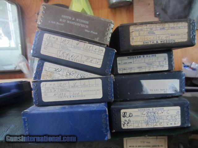 Description: SMITH & WESSON REVOLVER BOXES ALL WITH METAL CORNERS, SOME HAVE PAPER WORK 8 BOXES COMPLETE TOP AND BOTTOM 3 BOXES HAVE TOPS ONLY TOTAL OF 11. ALL FROM AN OLD GUN SHOP THAT HAS BEEN CLOSED. PRICE FOR ALL WITH UPS INSURED SHIPPING $ 150.00 NEED MORE INFORMATION PLEASE CALL OUR OFFICE 716-941-3946 SOLD |