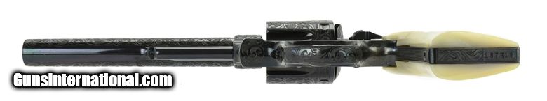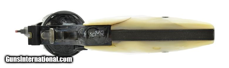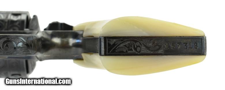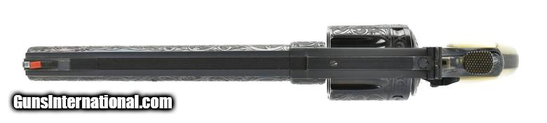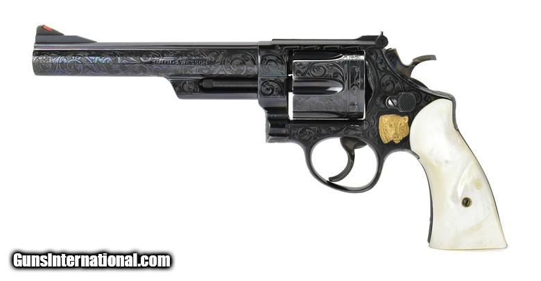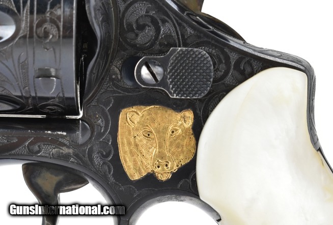 Description: Smith & Wesson Engraved .44 Magnum .44 Magnum caliber revolver. Custom engraved 5-screw pre-model 29. Full coverage scroll engraving with a gold inlay on the frame. The grips are beautiful genuine pearl. A very desirable S&W .44 Magnum, luxuriously decorated.