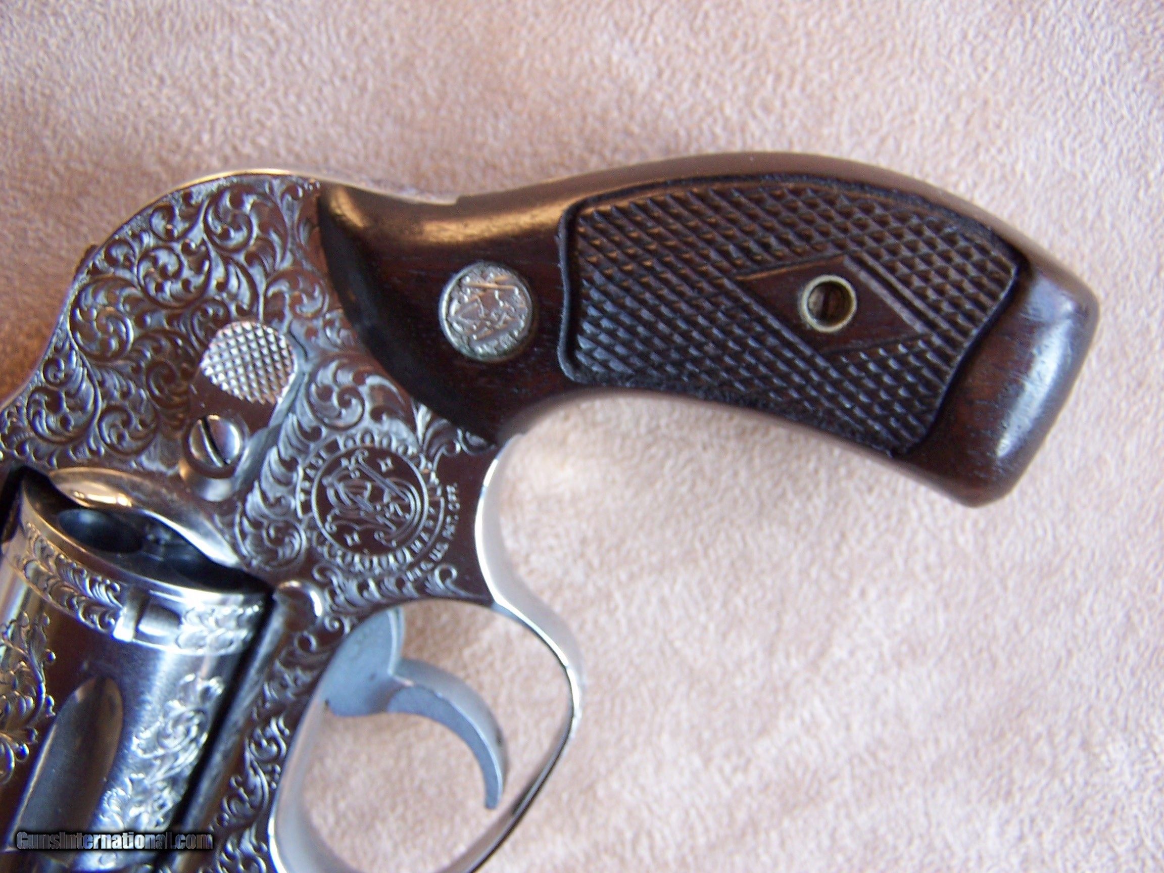 Description: This is certainly the best engraved Smith & Wesson Model 649 that we have ever encountered. Beautiful tight scroll engraving fills both side panels, backstrap, and cylinder. Additional engraving covers the front of the crane area and end of the barrel. The gun remains new & unfired and is mechanically perfect. It is chambered in .38 Special and has the 1 7/8” barrel. The engraver signed with his initials on the bottom of the grip frame. A stunning Smith & Wesson Model 649 that is profusely engraved and remains in new and unfired condition. Built for someone who wants to carry the best. ??I offer a three-day non-firing inspection period and always want the buyer to be satisfied with their purchase. The gun will be packed correctly and shipped via FedEx with insurance to your FFL dealer in the continental United States for $55 (California is extra because I have to ship through my local dealer). This gun requires an FFL license for transfer. I ship the following day after the payment arrives and provide tracking information. Please see my other Colts and various collectible firearms that I have listed. Thanks for your interest and please let me know if you have any questions. Price is $3250.00 plus shipping. Please Note: A same as cash price Lay-A-Way plan is available on this gun. Please call to discuss. Sold Pending Funds SOLD Handgun Caliber: .38 Special Manufacturer: Smith & Wesson Model: Model 649 Serial Number: BAT 1071 Barrel Length: 1 7/8 Condition: As New Metal Condition: New Wood Condition: New Bore Condition: New and unfired Action: Double Action Finish: Stainless Steel Engraving: Yes, Profusely Engraved Item Location: Tennessee |