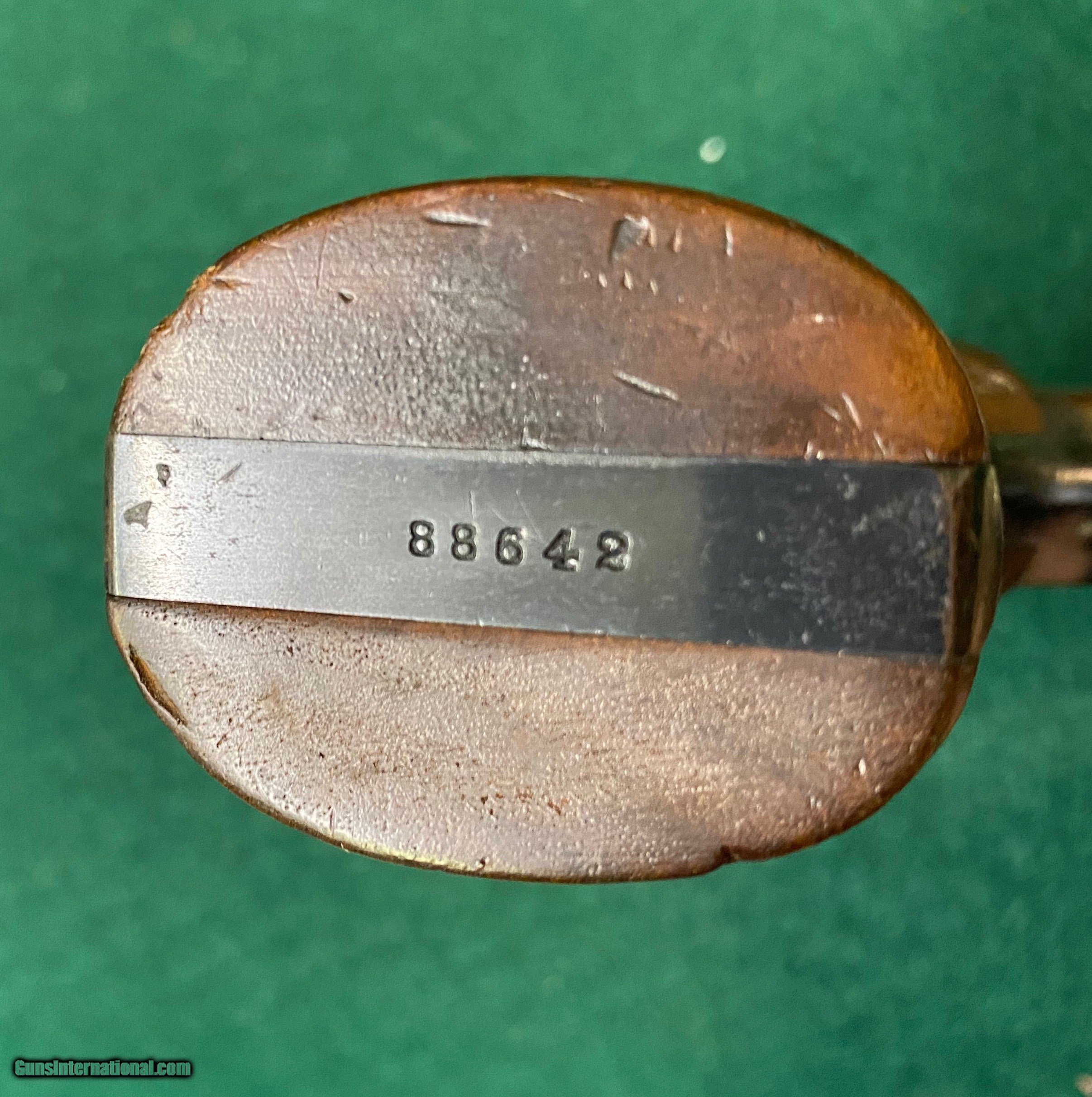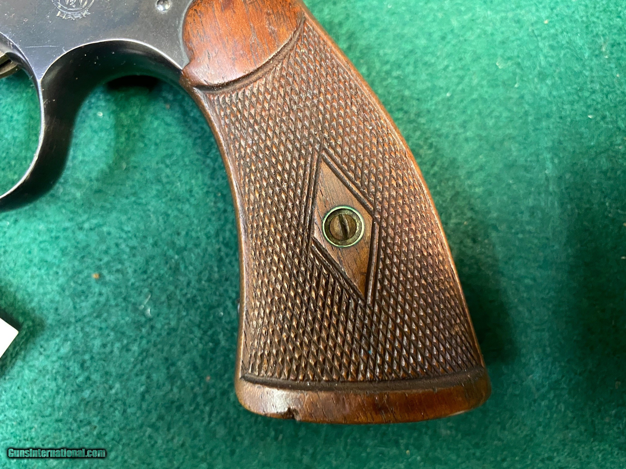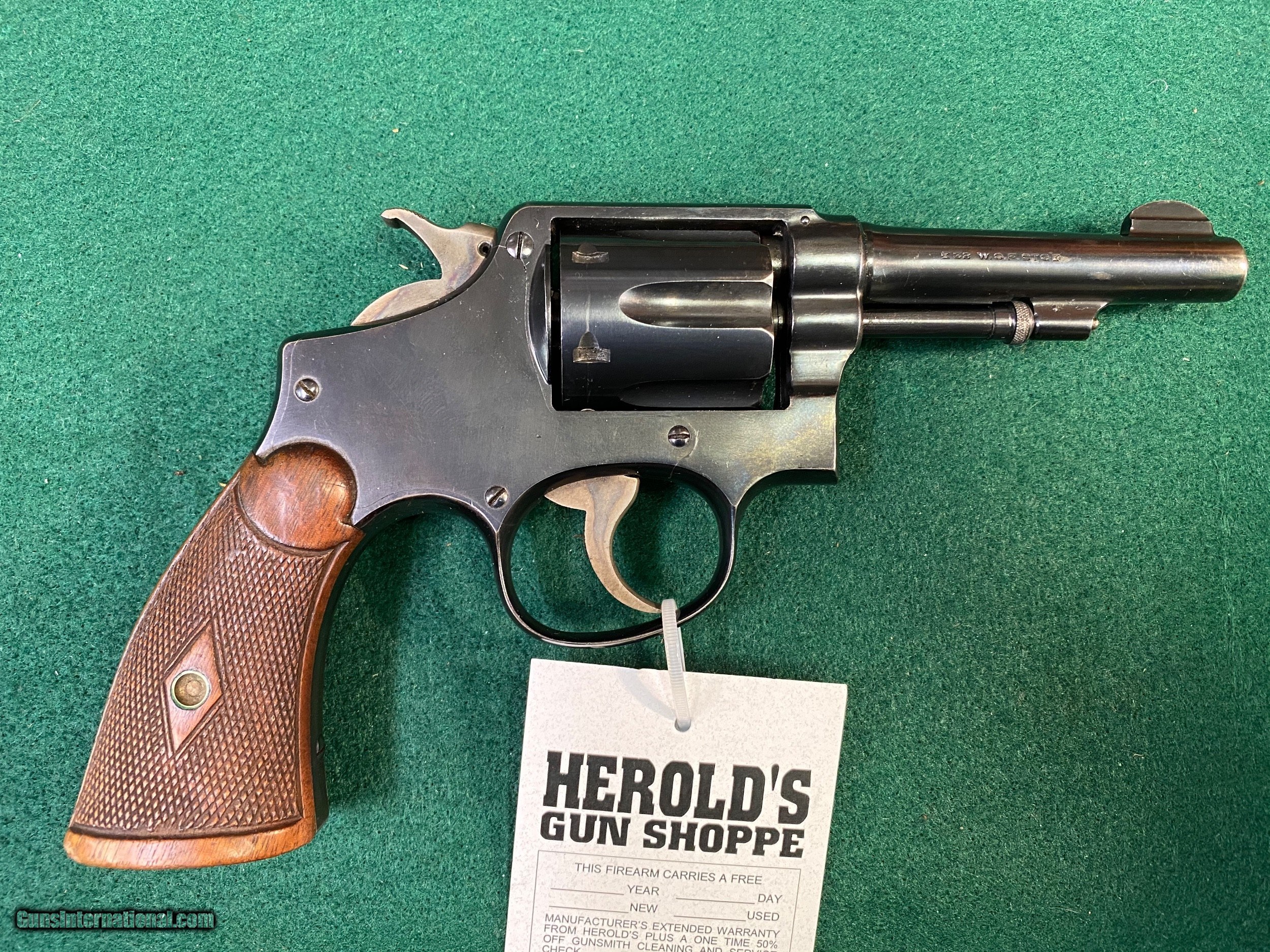 Description: Another gem we found at the estate sale. This time it's a Smith & Wesson Hand Ejector in .32-20 caliber in VG/EXC condition. (Has a small nick at the bottom of the left grip, see pics) Has a 4" barrel w/SN #886xx. Old school diamond grips, overall a very nice addition to your Smith & Wesson revolver collection. We will accept your C & R license on this item. Serial # places production between 1915 and 1940 according to the Standard catalog of Smith & Wesson fourth edition. We reserve the right to sell this item at our retail location until an offer is placed on Guns International. Preferred method of payment is a USPS money order. We do take major credit cards with a 4% surcharge. Please allow us up to three business days to answer emails and return phone calls. Occasionally we get quite busy with walk/in traffic and/or paperwork, thank you in advance for your patience and consideration in this matter. We are open Tuesday through Saturday, 9 AM to 5 PM. Closed on Sundays and Mondays. Stop on by to take a look at this item and other fine classic firearms at Herold's Gun Shoppe in Waynesboro, PA. We look forward to meeting you! SOLD Curio/Relic: Yes Manufacturer: Smith & Wesson Model: Hand Ejector Serial Number: 886xx Barrel Length: 4” Caliber Info: .32-20 Condition: VG/EXC |