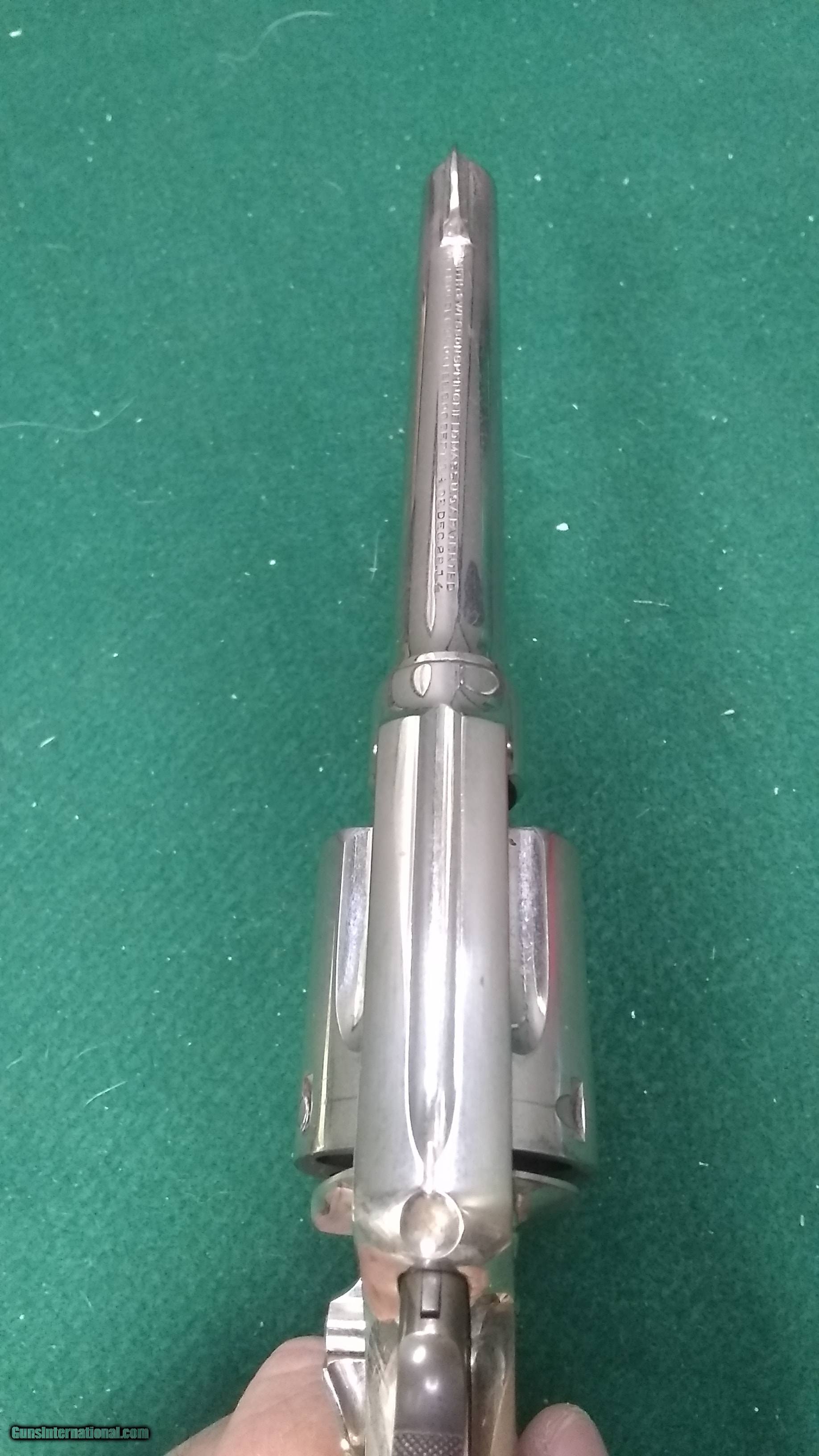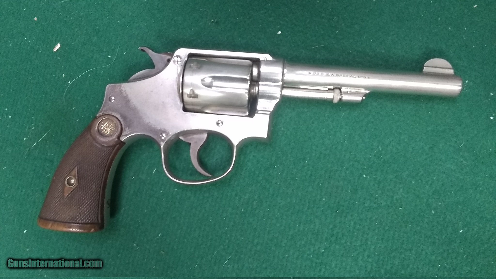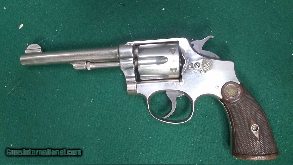 Description: Guns Listing ID: 334238 This classic Smith & Wesson Hand Ejector model is chambered in 38 spl. with a 5\" barrel and fixed sights. It has a nickel finish and walnut grip pannels. Lockup is outstanding and it has a good bore. The nickel finish shows wear on the right side of the frame near the grip. SOLD Manufacturer: SMITH & WESSON Model: hand ejector Caliber Info: .38 SPL Condition: Used - Non-Certified Barrels: 5 BARREL Finish: NICKEL |