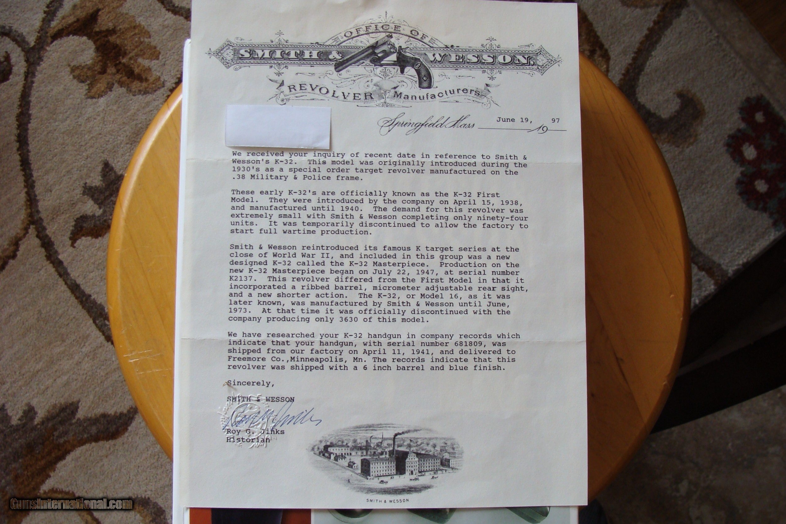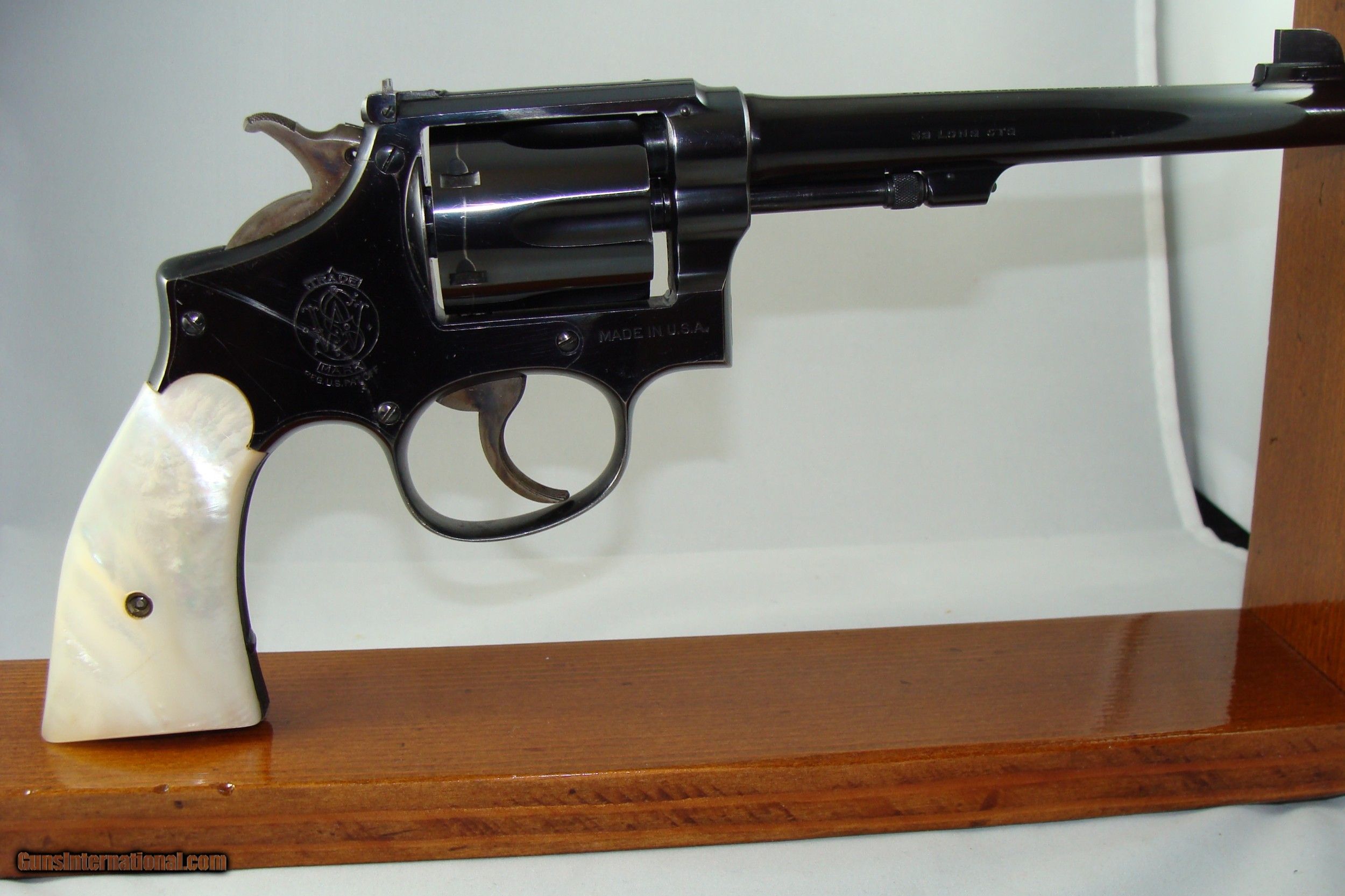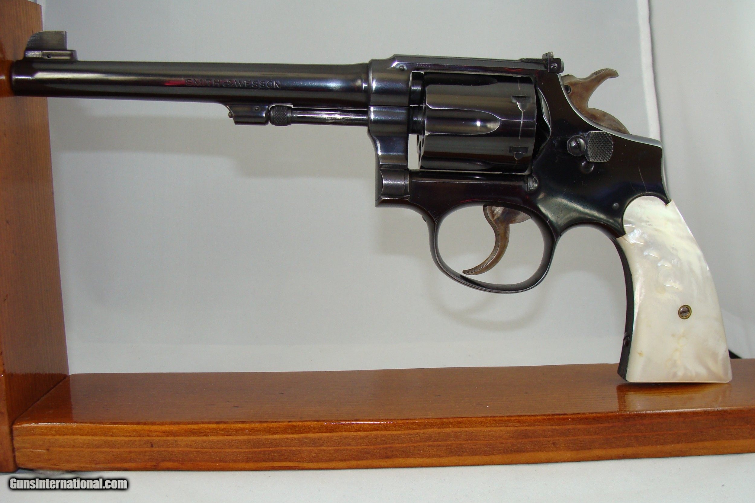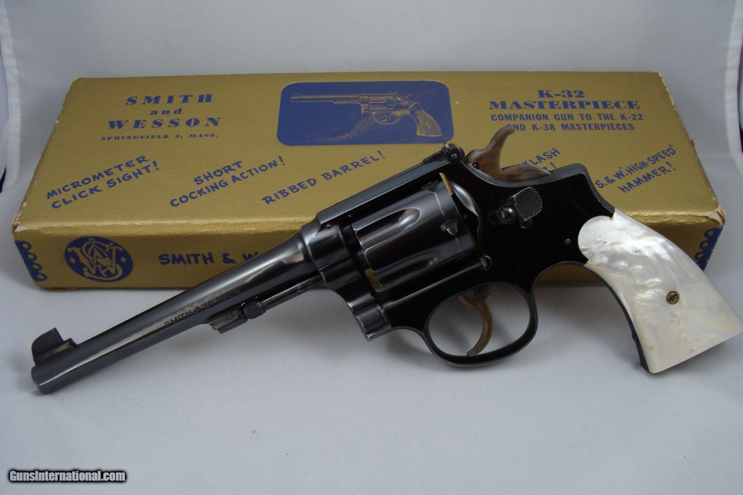 Description: Smith & Wesson K-32 Hand Ejector First Model. Bright bore. Very nice finish. A noticeable scratch on sideplate. Grips are very nice MOP not original. Box is very good condition but not original. With letter. Shipped April 11, 1941. All matching numbers. Only 94 produced making it a very rare Smith & Wesson. A mst have for collectors. No Ca sales. Certified check. Price includes shipping. 3 day inspection with buyer paying for return shipping cost SOLD Curio/Relic: Yes Handgun Caliber: .32 S&W Long (.32 Colt New Police) Manufacturer: Smith & Wesson Model: K-32 First Model Serial Number: 681809 Barrel Length: 6 Condition: Very Good Metal Condition: Very Good Bore Condition: Excellent |