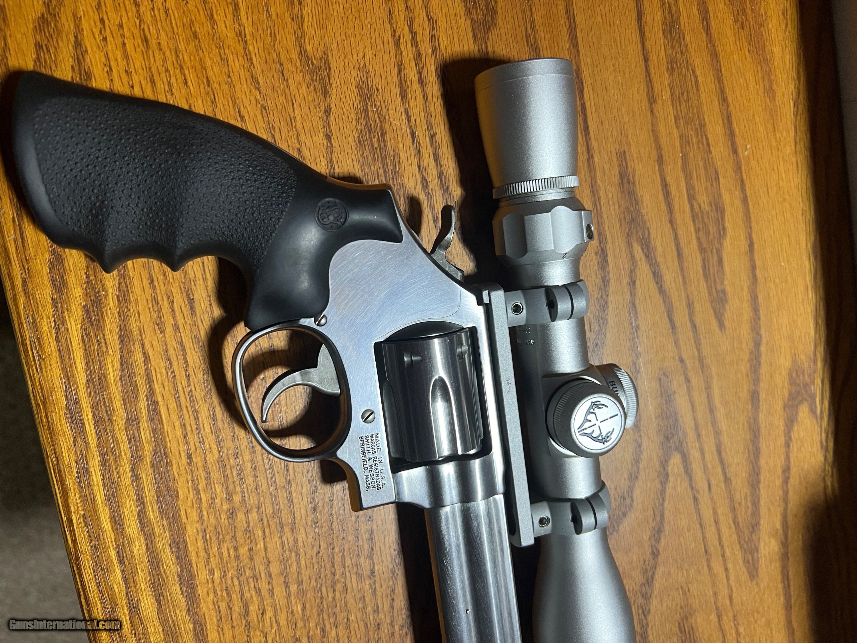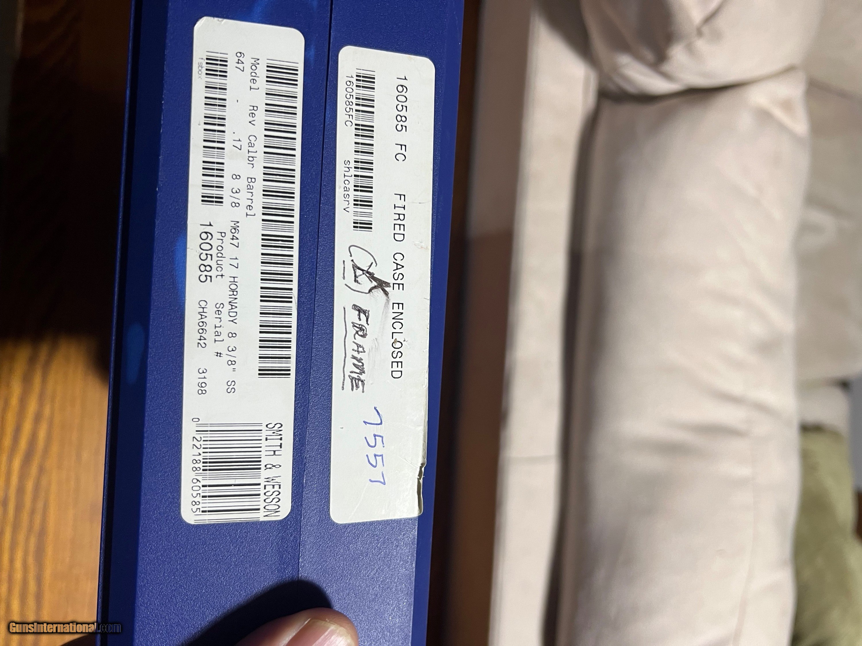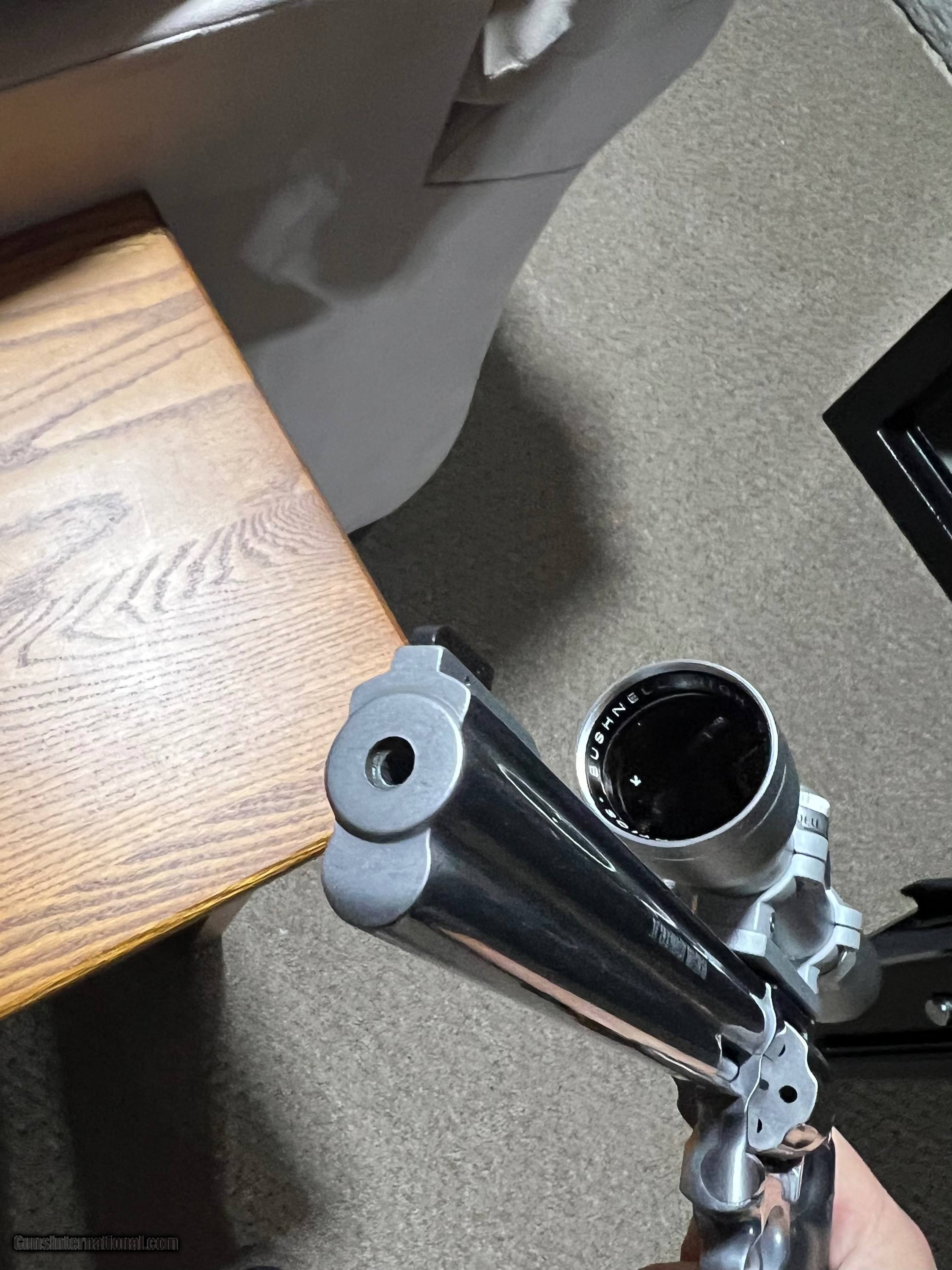 Description: Excellent condition Smiith & Wesson revolver in the rare 17 Hornady. It was only made in 2003/2004. This one comes with the box and paperwork. It also includes a Bushnell 2x6 scope. SOLD Handgun Caliber: .17 HMR Manufacturer: Smith & Wesson Model: M647 Barrel Length: 8 3/8 Chambers: 6 Condition: Great Metal Condition: Great Bore Condition: Great Manufacture Date: 2003/2004 Extras: Bushnell 2x6 scope |