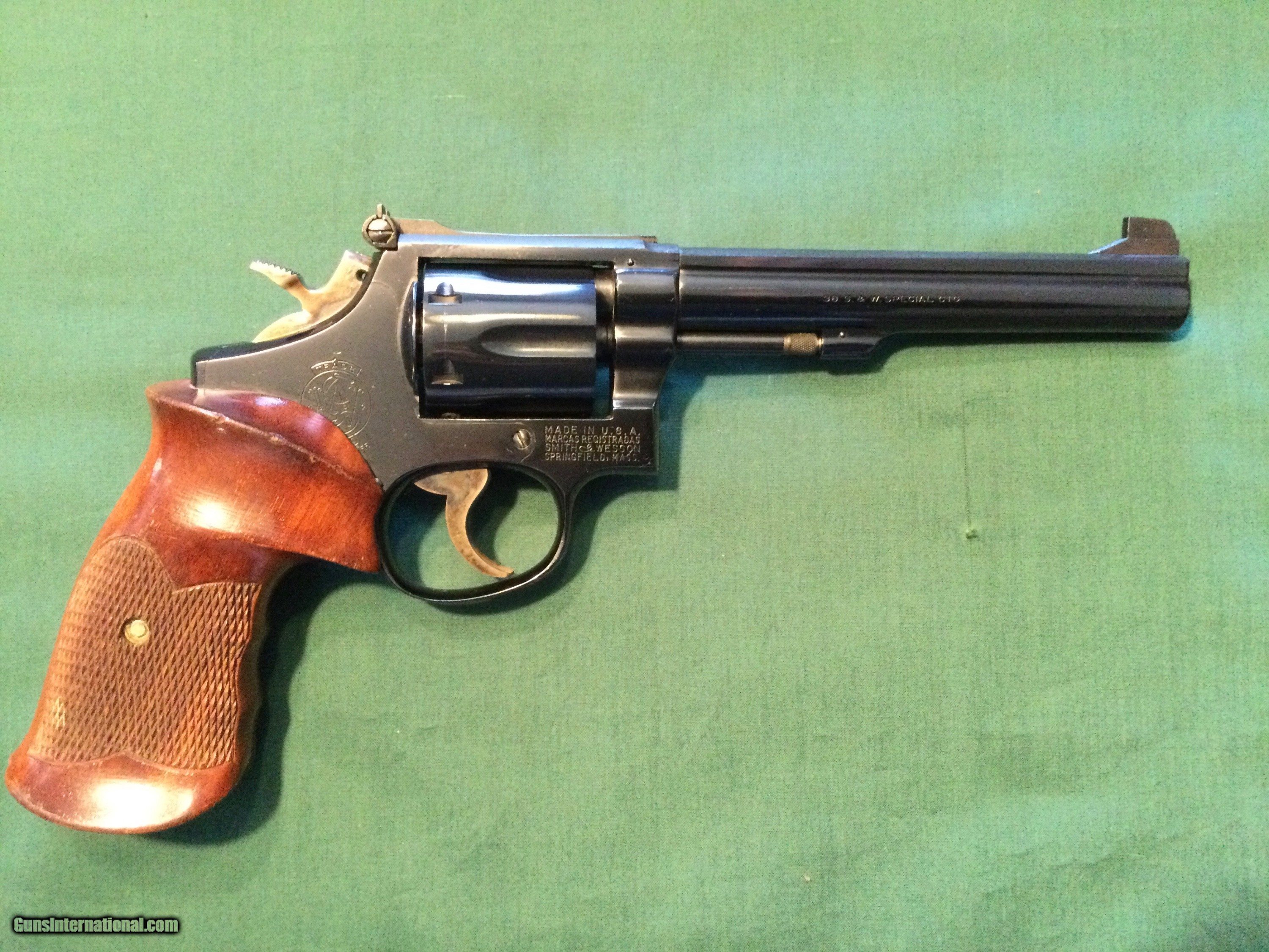 Description: This is a very nice old Smith 14-3 target 38, that I got from the estate of an old guy in Germany where it was originally sold. It was shot very little. 6" pinned barrel & excellent bore. Light cylinder marks. I got the gun, hoping to work on my Bullseye distinguished revolver rating but never got around to it. I can say though, having shot many target revolvers including S&W, Colt match, DW and Korth, ths is the most accurate revolver I've ever shot. I've put about 60 rounds of light wadcutter through it. Smooth tight action, great trigger and very solid comfortable ergonomic thumbrest grips. I have some other ergonomic target grips if the buyer prefers them to these thumb rest grips. Not much else to say about it. $35 insured priority shipping to your FFL in the lower 48. SOLD Handgun Caliber: .38 Special Manufacturer: Smith & Wesdon Model: 14-3 Barrel Length: 6” Condition: VG-exc |