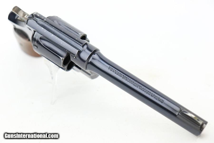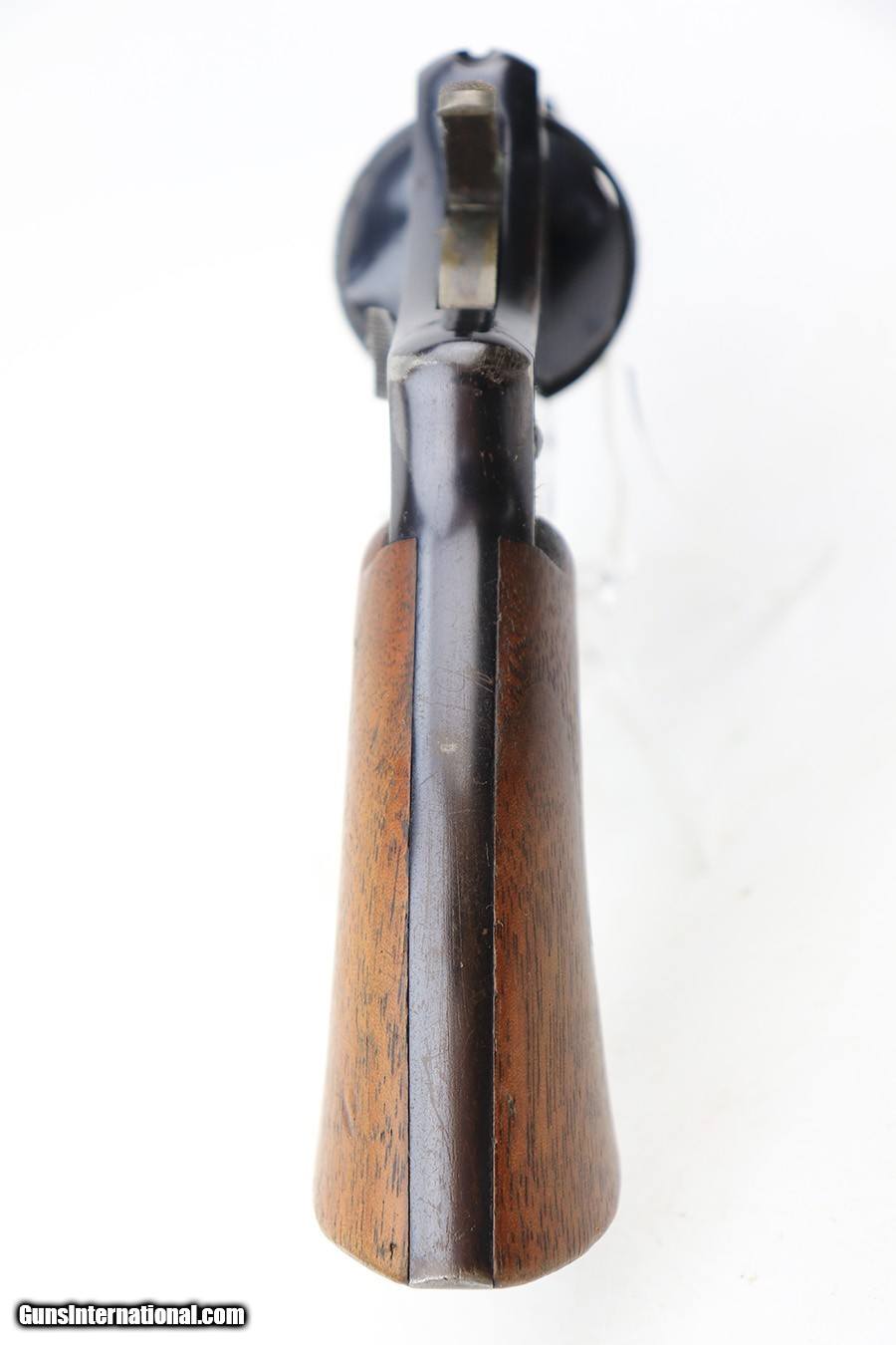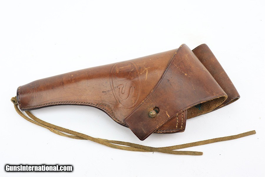 Description: This is a very nice example of a Smith & Wesson Model 1917 revolver issued to the US military during WW1. All matching, "United States Property" marked, and has the proper military inspection proof on the left side of the frame. It comes with an excellent 1917-dated holster with a leather lanyard. The gun itself has retained about 92-93% of its original high polish finish. The majority of the wear is around the muzzle and along both sides of the barrel. There is also minor wear around the high edges of the cylinder and a light roll mark. Minor dulling on the grip straps. Nice wood grips - the right panel is hand-numbered to match the gun. Some tiny dings along the bottom edge of the left grip panel. The bore has decent rifling, but there is pin-pricking throughout and some tiny pits in the grooves. SOLD Curio/Relic: Yes Handgun Caliber: .45 Colt |