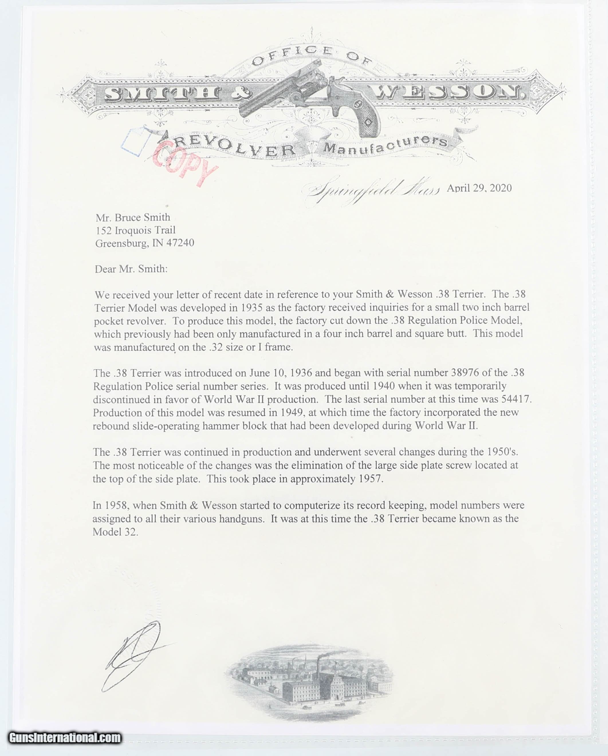 SOLD Handgun Caliber: .38 S&W (.38 Colt New Police, .38 Super Police) Manufacturer: SMITH & WESSON Model: 32-1 TERRIER Serial Number: 1030?? Barrel Length: 2 Condition: EXCELLENT |