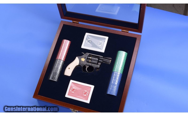 Description: Released in 2005, this Limited Edition Smith and Wesson Model 36-10 Revolver celebrates the game of Texas Hold'em and the spirit of the gambler. Factory scroll engraved, faux ivory grips, gold inlaid stripe on cylinder & barrel, "Dead Man's Hand" set of cards in a 24k gold inlay on right side. Pre-owned, # 1433 includes glass top presentation case with Smith and Wesson poker chips, and playing cards. Very high condition set shows few freckles on the pistol, case has a couple scuffs and imperfections on the liner. .38 Special SOLD Metal Condition: "Polished Blue, Scroll Engraved Bore Condition: Excellent Barrels: 1 3/4" Barrel Triggers: DA/SA Weight: 22 oz. Sights: "Notched Frame, Ramped Front Item Location: Buda, TX |