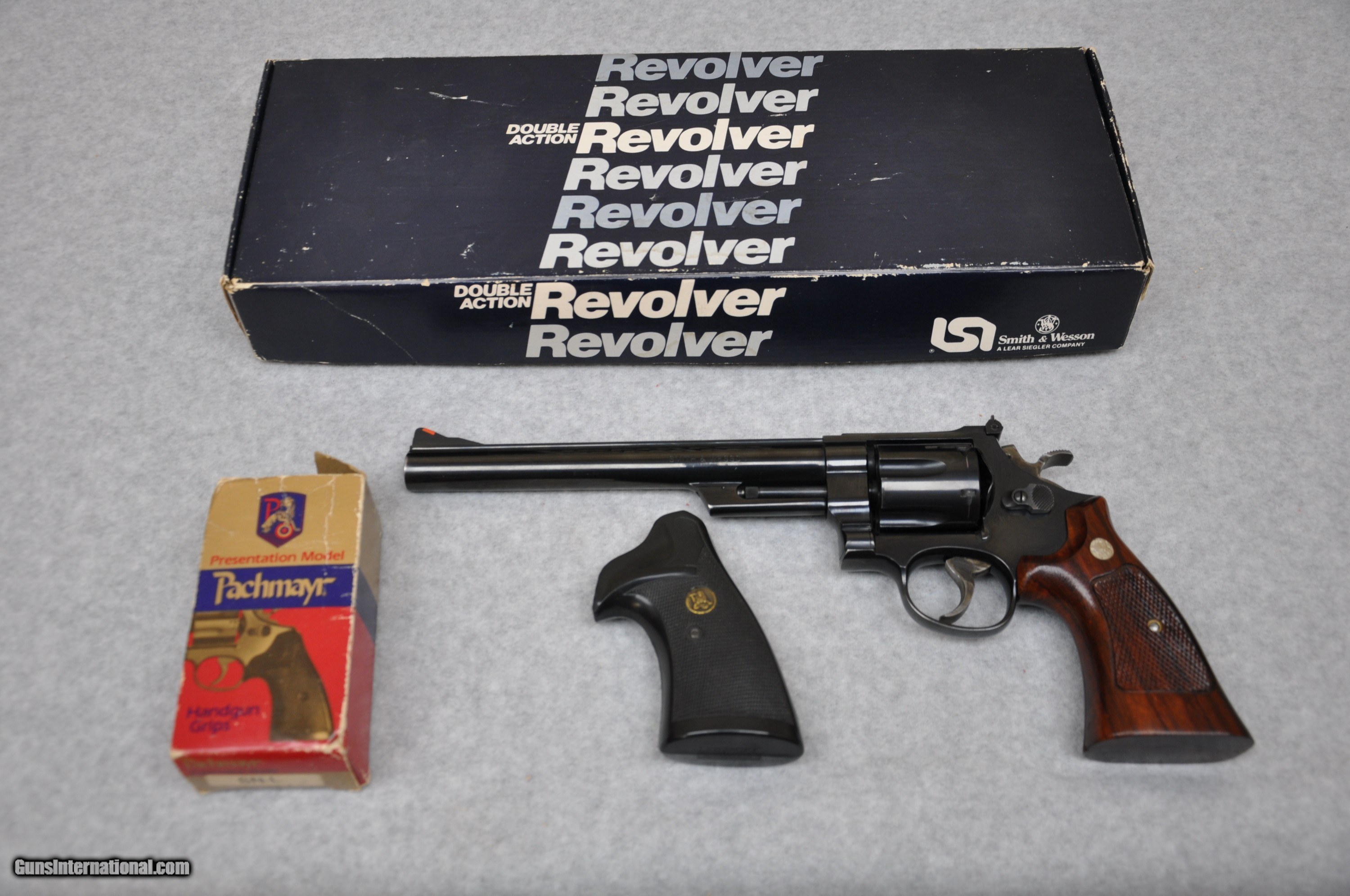 Description: Smith & Wesson Model 57-1 .41 Mag. 8 3/8-inch barrel. With original box and Pachmayr Presentation grips. Generally very clean with some bluing wear on sharp edges and at muzzle. Forward rib screw slot is slightly damaged. $45 shipping SOLD Handgun Caliber: .41 Remington Magnum |