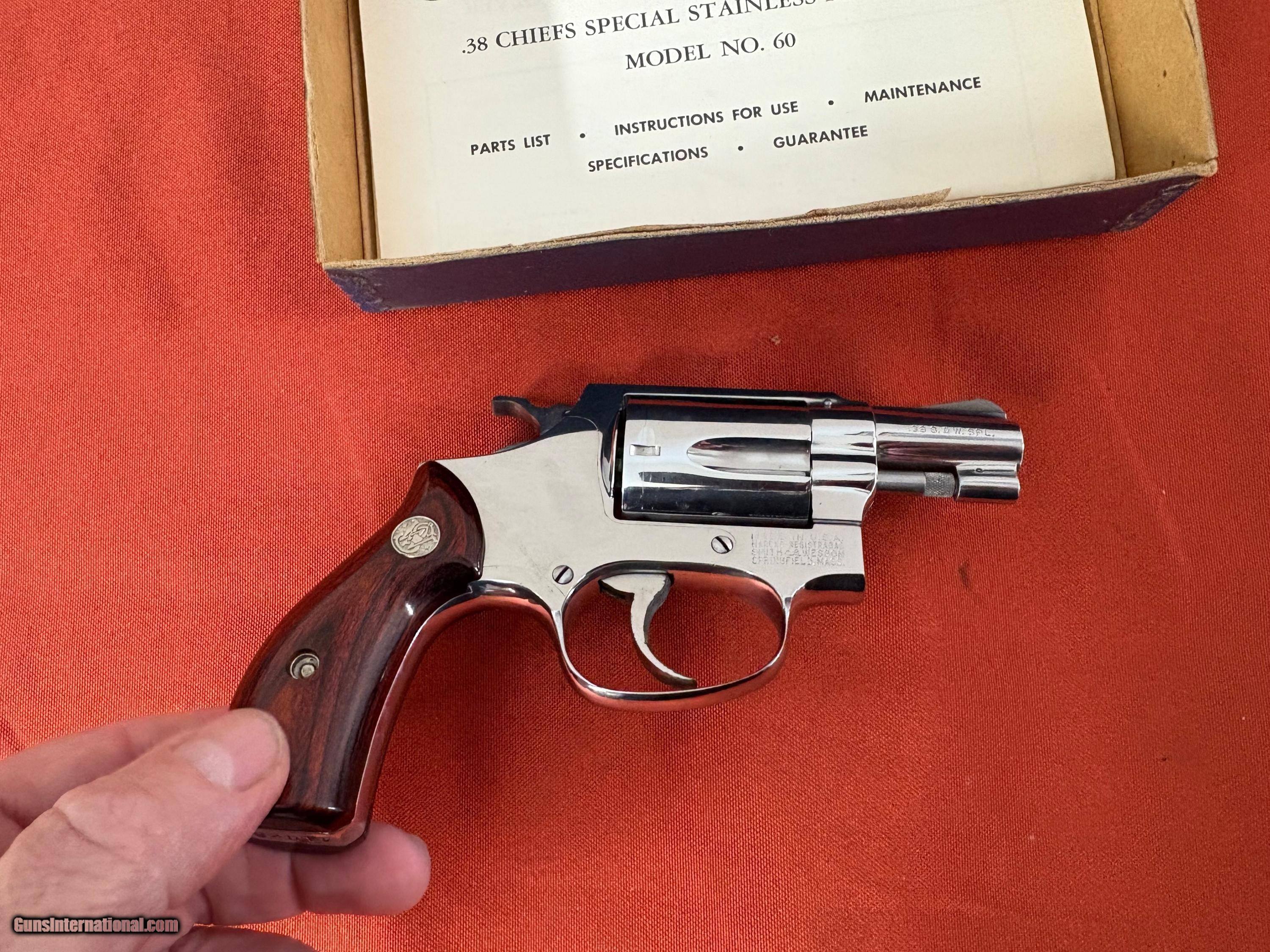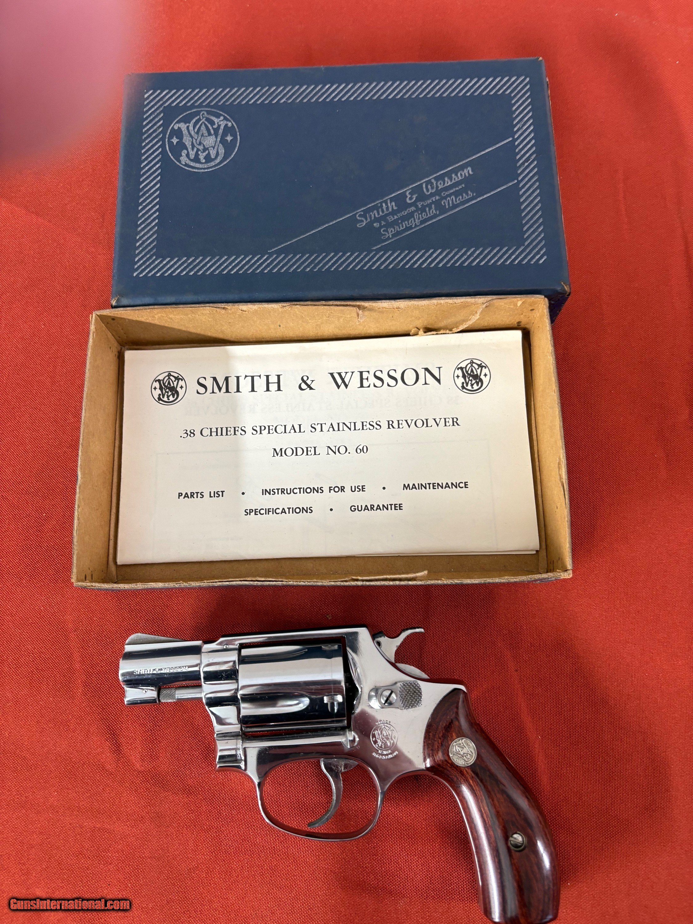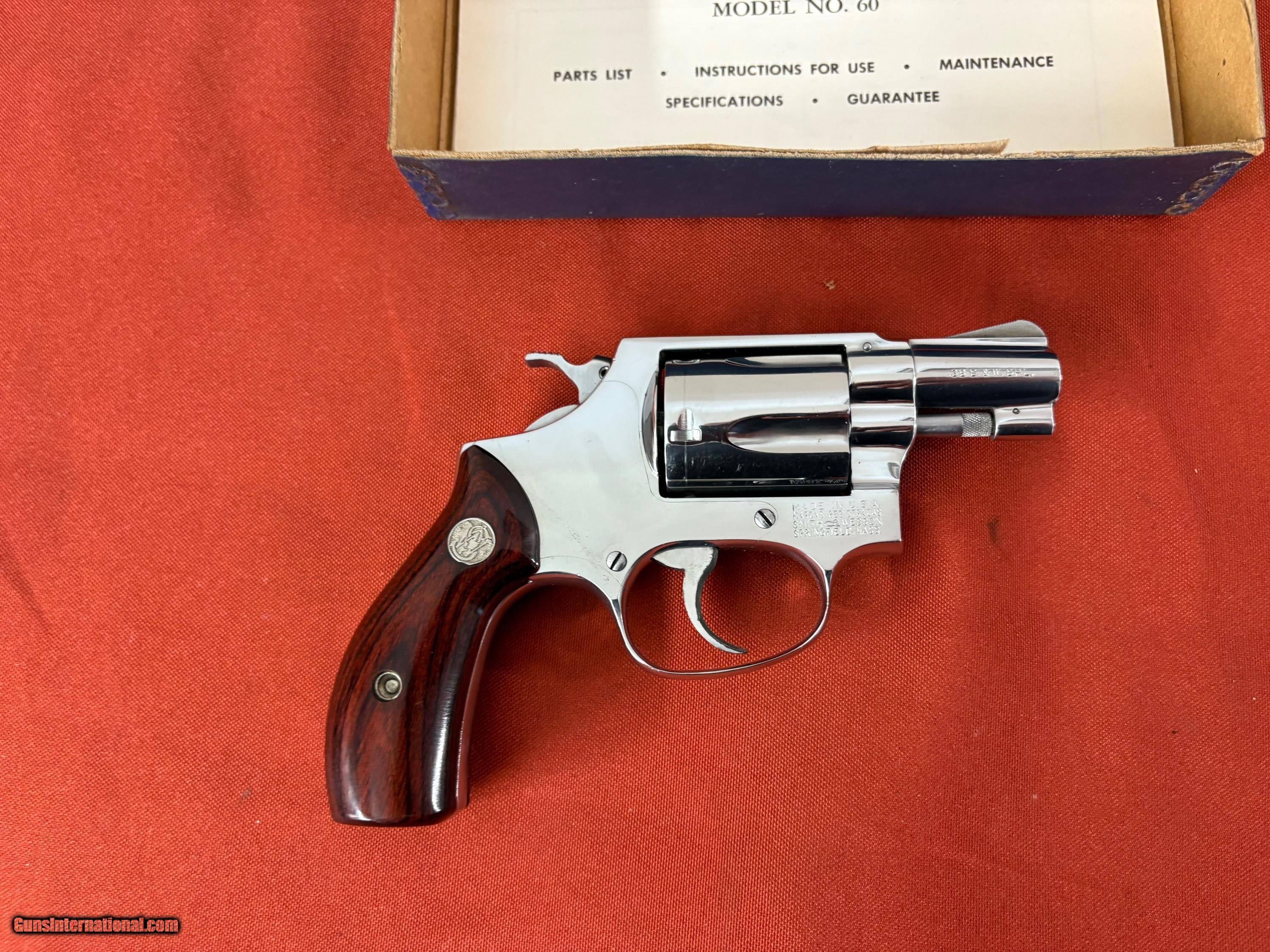 Description: SMITH & WESSON MODEL 60 FIRST RUN PRODUCTION , SERa#410284 MADE 1965-1966. BRIGHT STAINLESS FINISH . 2 INCH BARREL . GUNS IN VERY NICE CONDITION . COMES WITH ROSEWOOD S&W LOGO GRIPS AND A VINTAGE BOX BUT NUMBERED TO A 1974 VINTAGE GUN . RARE TO FIND THESE 1ST RUN PRODUCTION GUNS. The Smith & Wesson Model 60 "First Run" refers to its introduction in 1965, marking it as the first mass-produced stainless steel revolver, a significant innovation based on the smaller J-frame Chief's Special (.38 Special) but made durable with stainless steel for rust resistance, becoming instantly popular for concealed carry and off-duty law enforcement, and remaining a classic choice for personal defense ever since. Key Characteristics of Early Models: