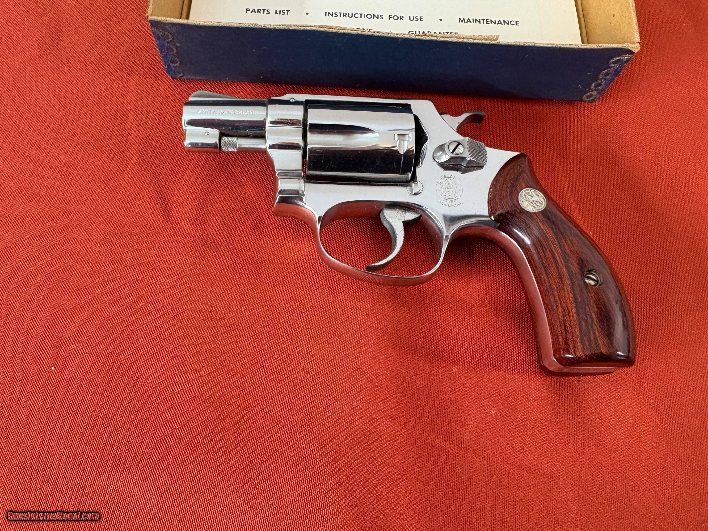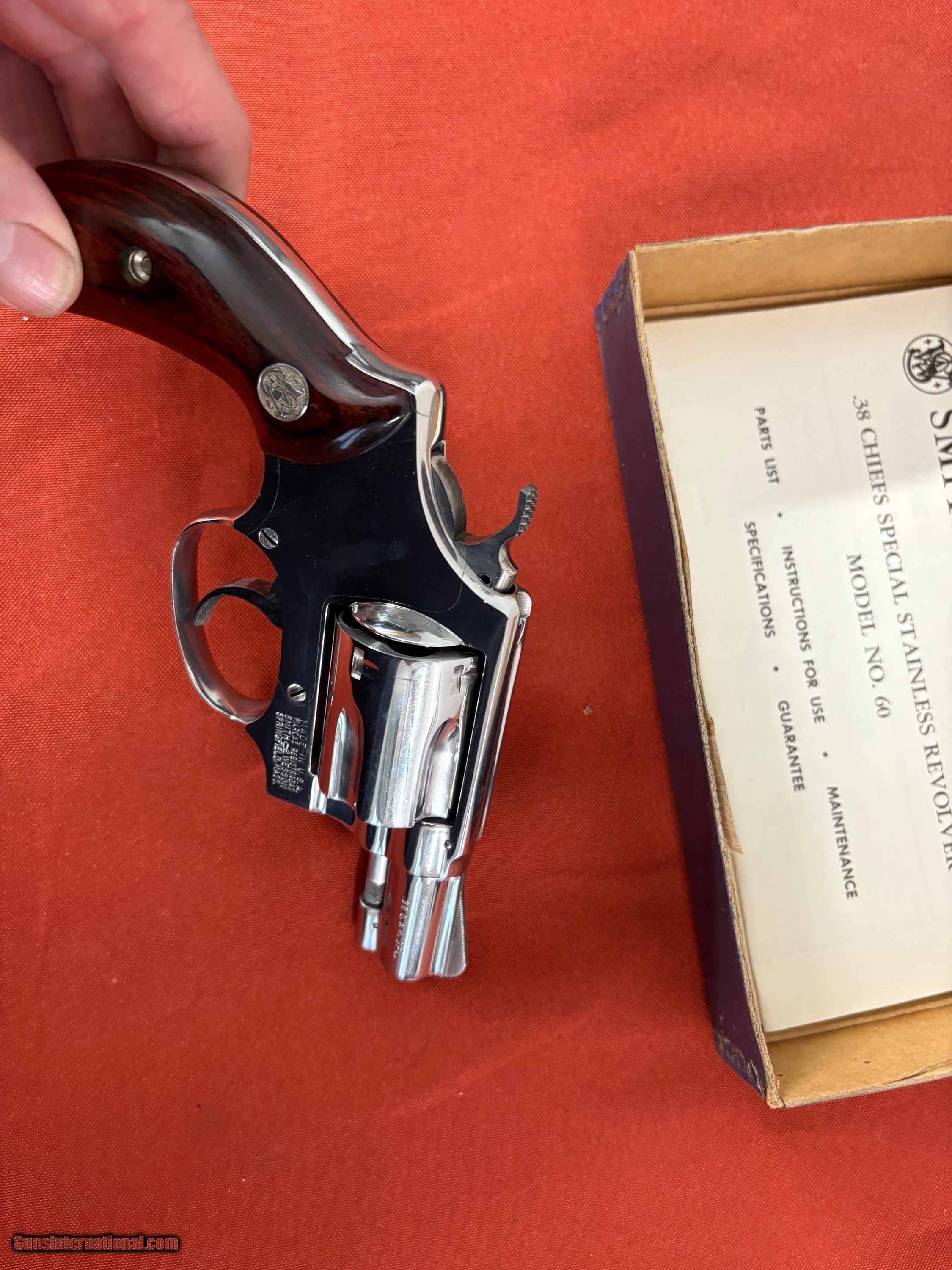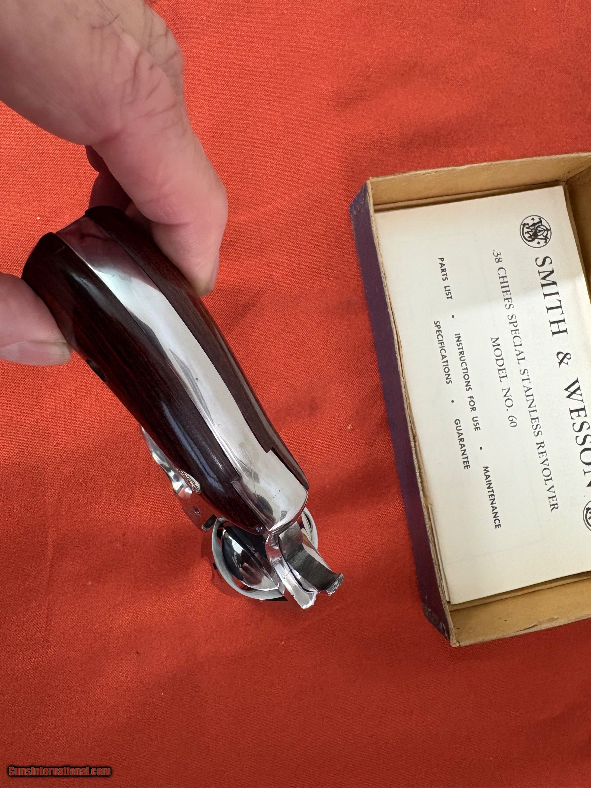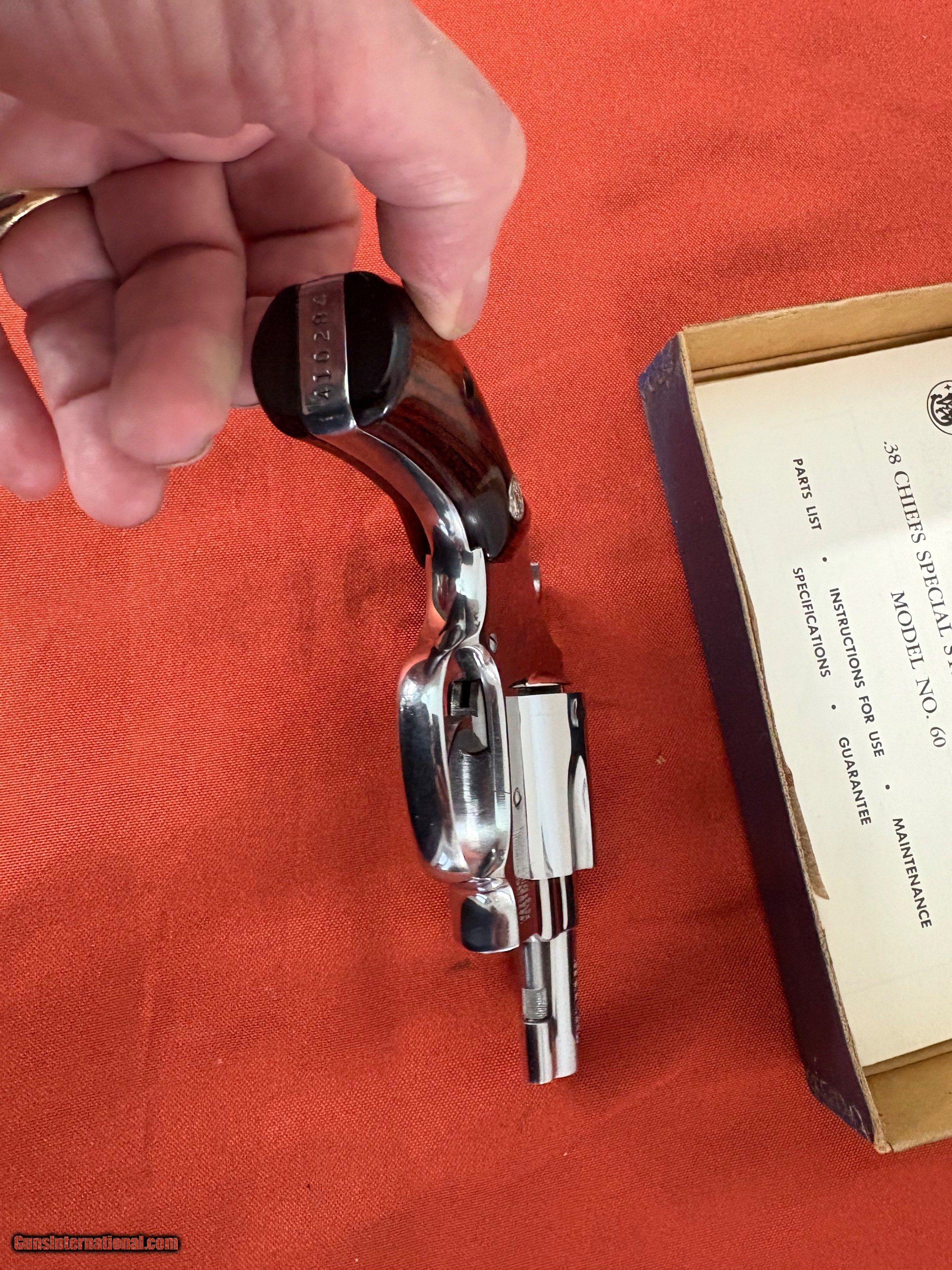 Description: SMITH & WESSON MODEL 60 FIRST RUN PRODUCTION , SERa#410284 MADE 1965-1966. BRIGHT STAINLESS FINISH . 2 INCH BARREL . GUNS IN VERY NICE CONDITION . COMES WITH ROSEWOOD S&W LOGO GRIPS AND A VINTAGE BOX BUT NUMBERED TO A 1974 VINTAGE GUN . RARE TO FIND THESE 1ST RUN PRODUCTION GUNS. The Smith & Wesson Model 60 "First Run" refers to its introduction in 1965, marking it as the first mass-produced stainless steel revolver, a significant innovation based on the smaller J-frame Chief's Special (.38 Special) but made durable with stainless steel for rust resistance, becoming instantly popular for concealed carry and off-duty law enforcement, and remaining a classic choice for personal defense ever since. Key Characteristics of Early Models: