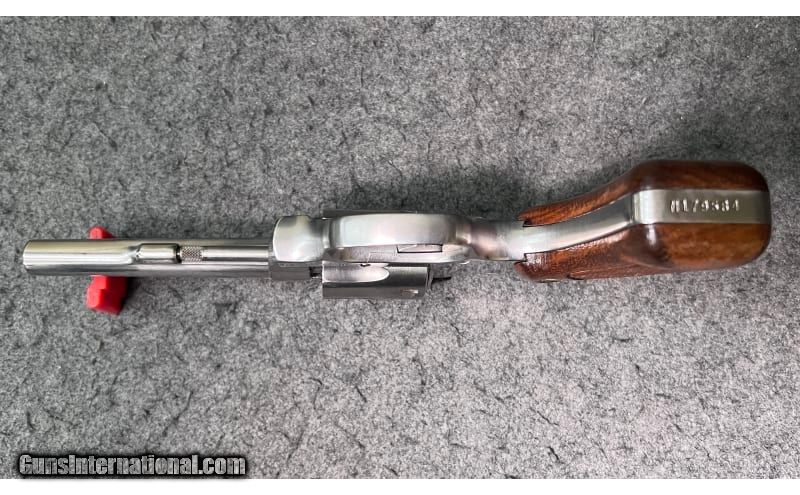 Description: This circa 1981 J frame double action satin stainless steel revolver is a Smith & Wesson Model 63 Kit Gun chambered in .22 Long Rifle. It has a six-round fluted counterbored cylinder, a 4" pinned barrel with serrated top rib, a ⅛ inch red serrated ramp on elevated ramp base front sight, a black stainless adjustable rear sight, a serrated curved trigger, a non-shrouded ejector rod, and has checkered Magna walnut grips with Smith & Wesson emblems. The Model 63 was S&W's first stainless steel J-Frame kit gun introduced in 1977 and made until 1998. Also known as the .22 Kit Gun, the Smith & Wesson Model 63 has been popular for many years with campers, hikers and those wanting a small .22 LR double action revolver for plinking. The Model 63 is one of those little revolvers that beg to be taken to the practice range. It feels great to hold due to the slim round-back grip which is extended just enough to give all three shooting hand fingers a place to rest. .22 Long Rifle SOLD Chambers: Six-round fluted counterbored cylinder Metal Condition: "The satin stainless steel finish is in very good to excellent condition, with some very light wear to the back strap and to the bottom of the trigger guard and butt Wood Condition: "Grips are in good condition with a great patina, but with no scratches, chips or cracks observable Bore Condition: Bore is very bright and shiny with strong rifling intact Barrels: 4 inch pinned stainless barrel with serrated top rib Triggers: Serrated curved trigger Stock Dimensions: 8¾ inches overall length Fore End: Non-shrouded ejector rod Butt Pad: Checkered Magna walnut grips with Smith & Wesson emblems Weight: 1 lb 8 ozs Sights: "⅛ inch red serrated ramp on elevated ramp base front sight, with black stainless adjustable rear sight Item Location: Wichita, KS |