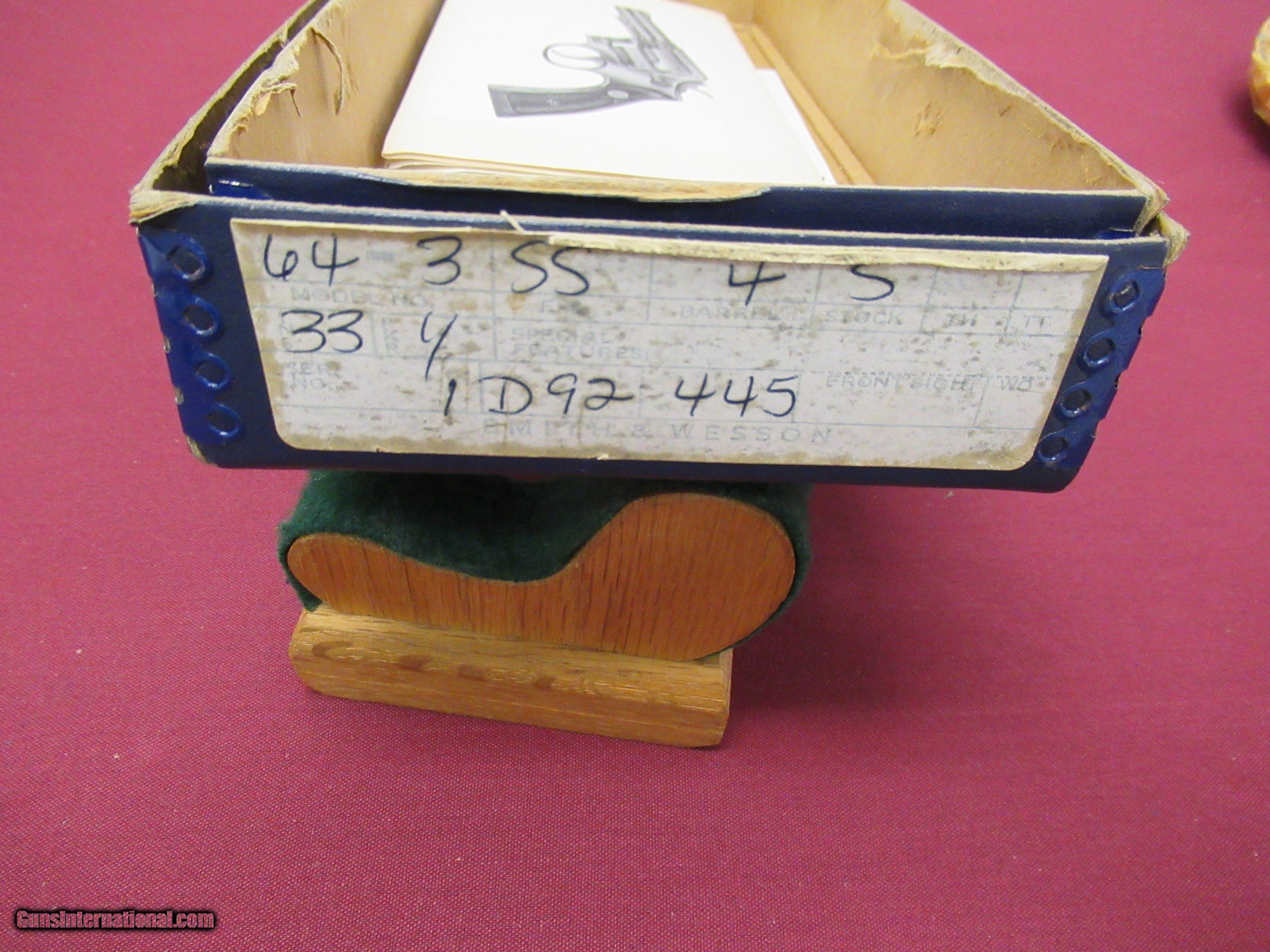 Description: Scarce Model 64-3 Smith & Wesson New & Unfired in Original Box. 38 Special Caliber, Stainless Steel Finish. Don't believe there is another one on the GI site. Had this gun for over 10 years. All the papers are in the box. One very small mark on the right side of receiver ( See Photo ) I would call it "Box Wear". SOLD |