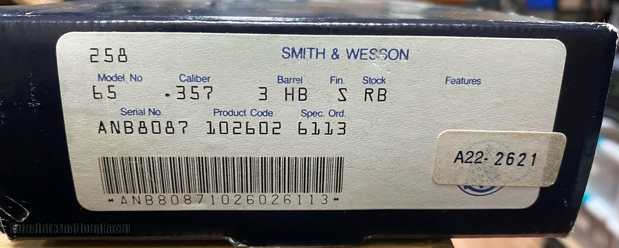 Description: Guns Listing ID: 493318 Up for sale is an Used - Excellent Condition Smith & Wesson Model 65-3 .357 Magnum 3\" 6rd Stainless Steel w/Factory Original Matching Box, Factory Documentation and Enhanced Trigger. This pistol is used, with very light handling wear present on the frame as pictured, mechanically flawless with custom light trigger 3.5 Lb trigger on single action and 5.5 Lb double action. This pistol was test fired with Federal American Eagle .357 Magnum and performed without issue. SOLD Manufacturer: SMITH & WESSON Model: Model 65-3 w/Factory Box, Accessories & Custom Trigger Caliber Info: .357 MAGNUM Condition: Used - Non-Certified Barrels: 3 BARREL Finish: STAINLESS |