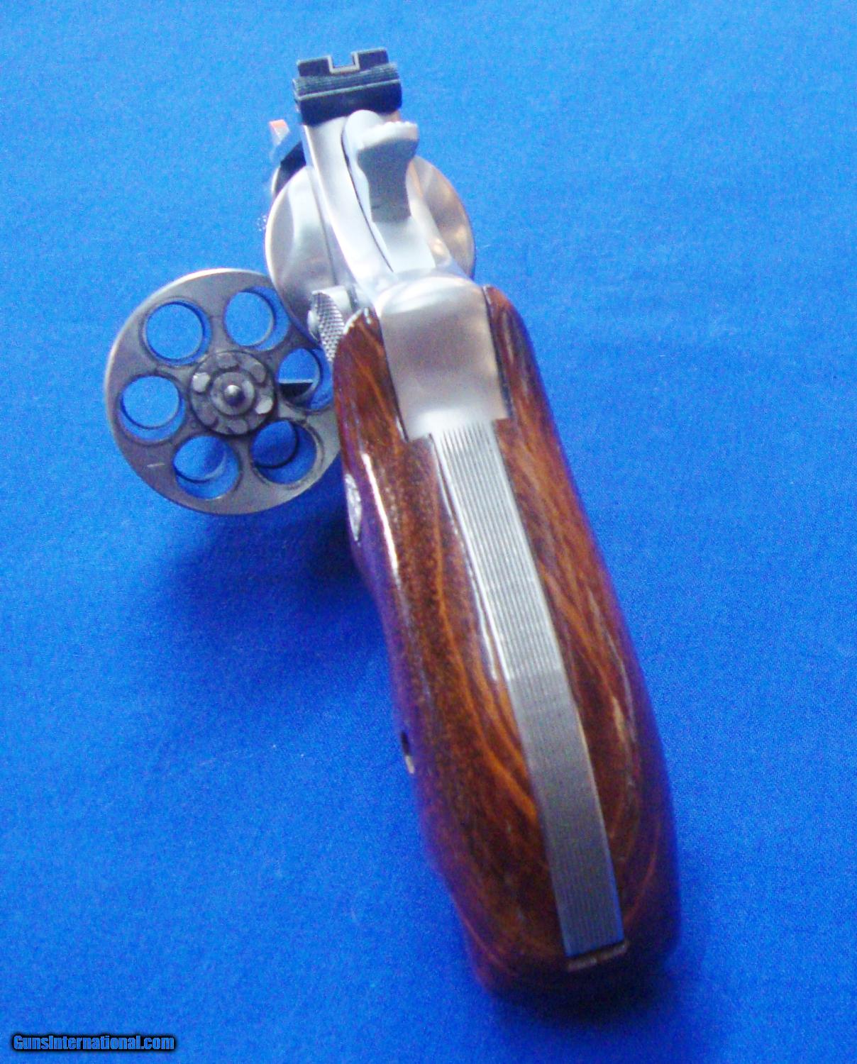 Description: Smith & Wesson Model 657.41Mag. This double action revolver has a six round fluted cylinder, stainless steel frame and cylinder, and round butt with Lew Horton style grips. The barrel is 3" with a red ramped front sight and an adjustable rear sight. Condition is very good with a slight cylinder score. Comes with Galco shoulder holster. SOLD |