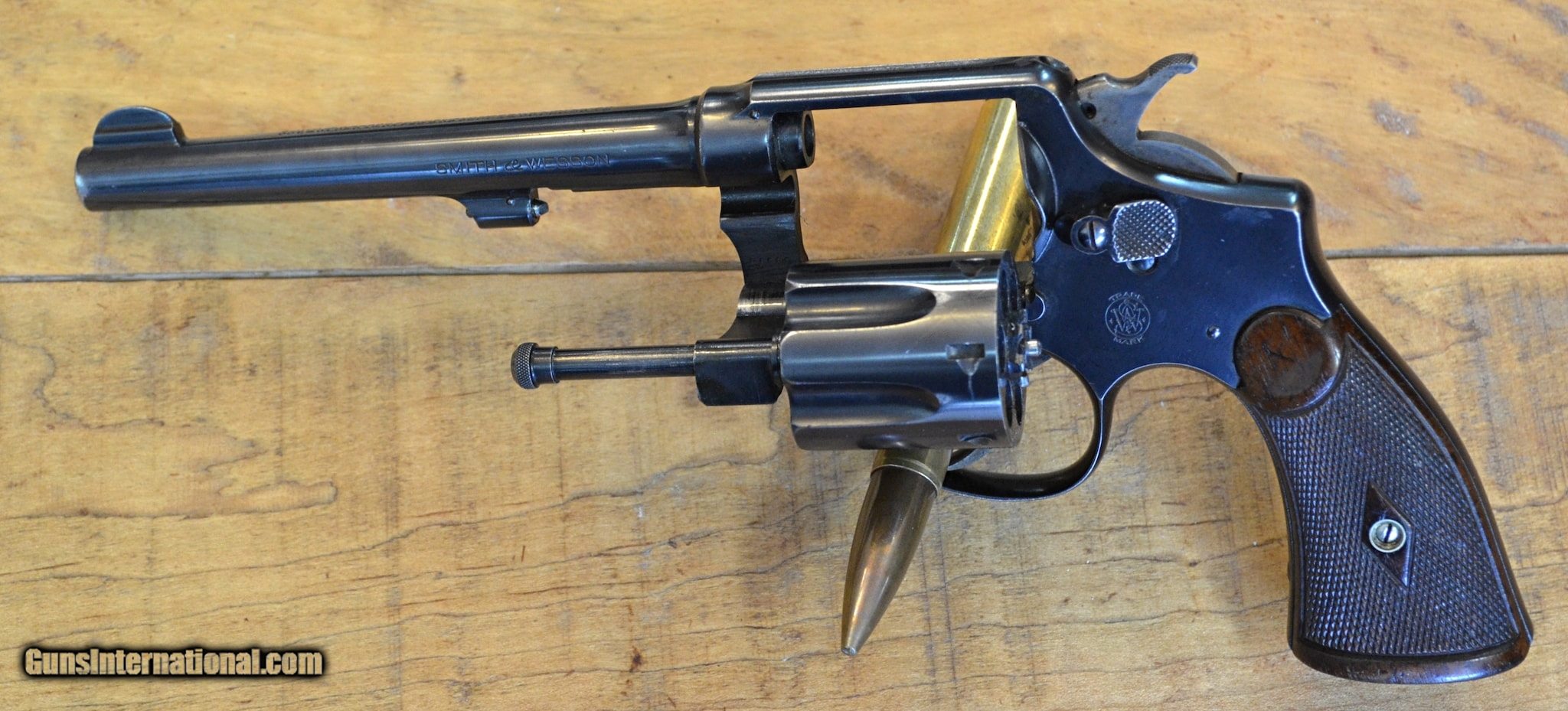 Description: Guns Listing ID: 663578 Smith & Wesson 32-20 WCF Hand Ejector (Model of 1905) 6 shot fluted cylinder. 6 inch barrel. Original walnut grips. This revolver mfg 1916-1928 as the barrel is marked .32 WCF. Retains 90% blue. Locks up tight. Very crisp action. SOLD Manufacturer: SMITH & WESSON Model: Model of 1905 Hand Ejector Caliber Info: 32 Condition: Used - Non-Certified Barrels: 6 BARREL Finish: BLUE |