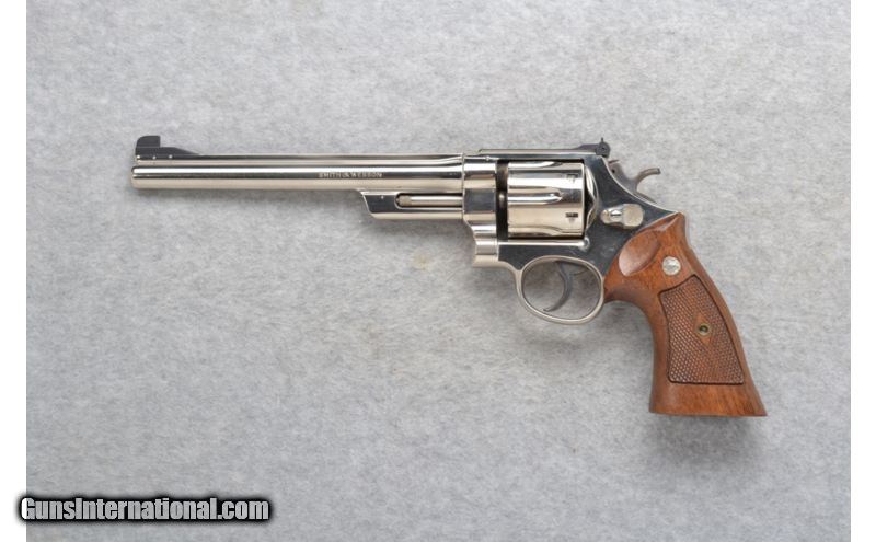 Description: SOLD Caliber Info: .357 Magnum Chambers: 6 shot. Metal Condition: Very good. Has some very light handling marks. Wood Condition: Very good. Minor handling/wear marks. Bore Condition: Excellent. Barrels: 8 3/8 inches. Nickel. Triggers: SA/DA Stock: Diamond checkered walnut with silver S&W medallions. Weight: 3 lbs. 0 oz. Sights: Raised blade front. Adjustable notch rear. Item Location: Richfield, WI |