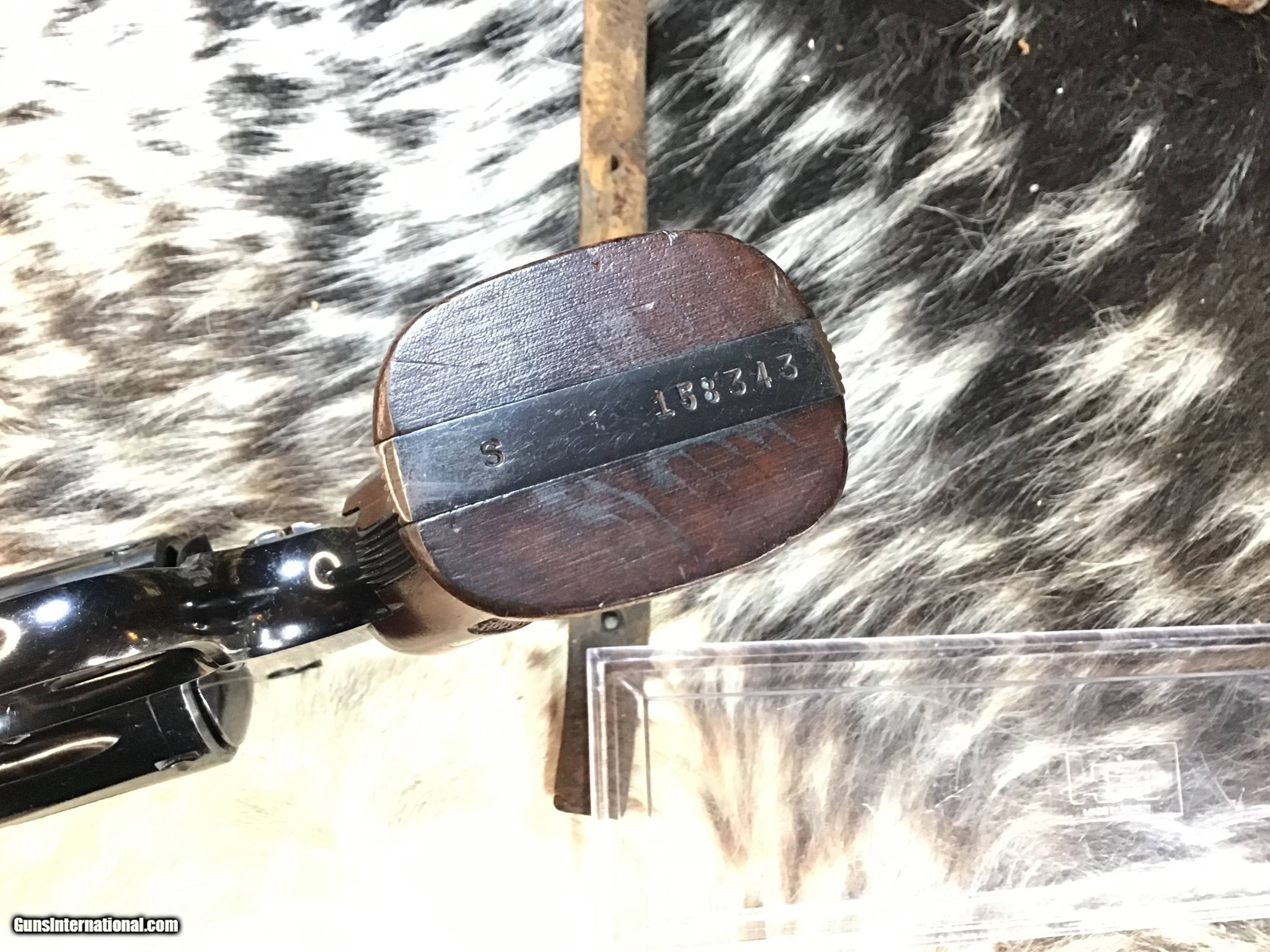 1950s Smith & Wesson N Frame Pre-27 Wearing a 5 inch solid ribbed barrel and Diamond Checkered Magna Service grips with Silver SW medallions. Original Blued finish at 97% or better. Pinned barrel, recessed cylinder, hand crosshatched rib to reduce glare. The pre 27 Smith & Wesson is a finely hand crafted revolver with a trigger like butter that fills your hand with .357 magnum power.
