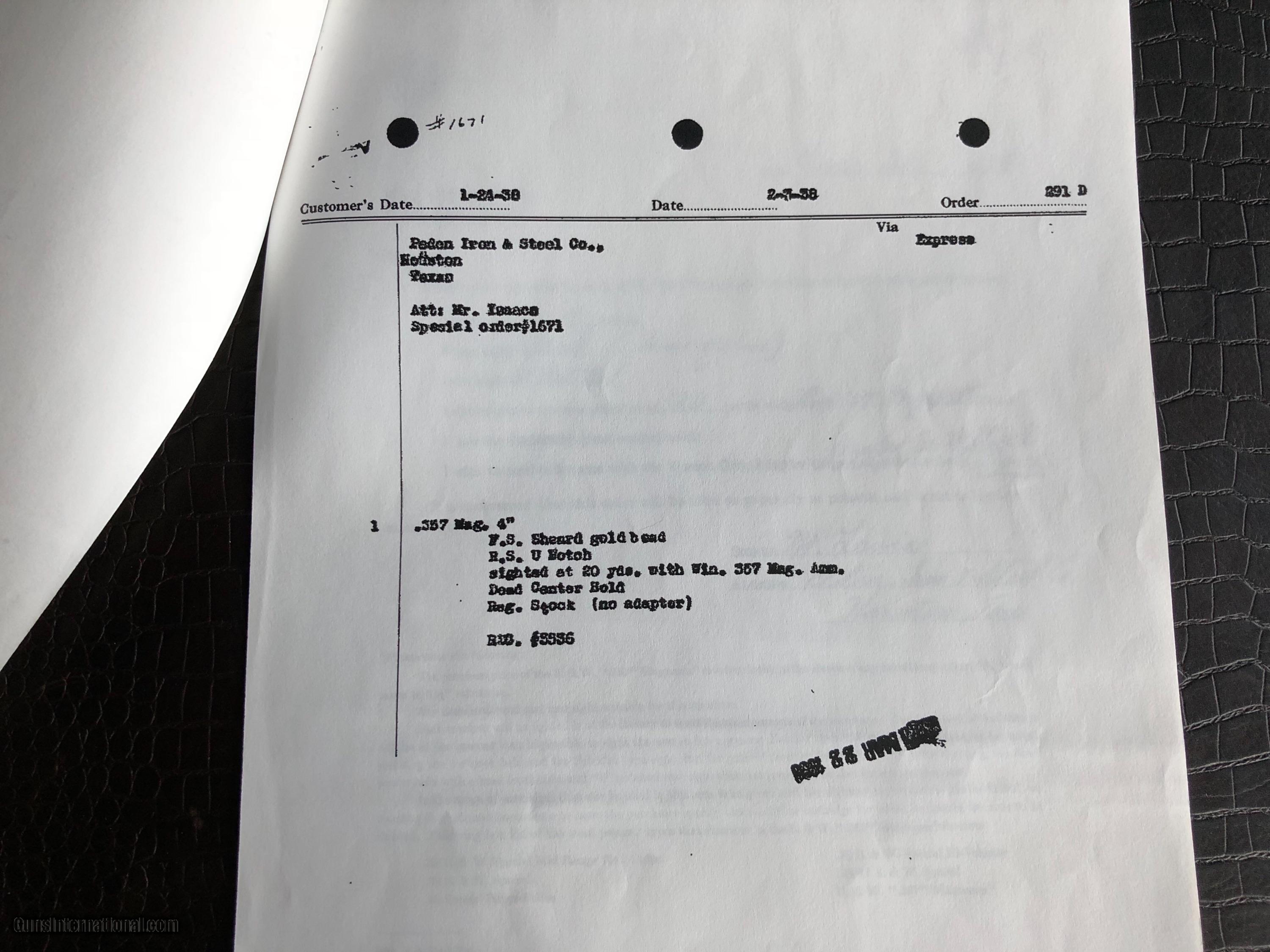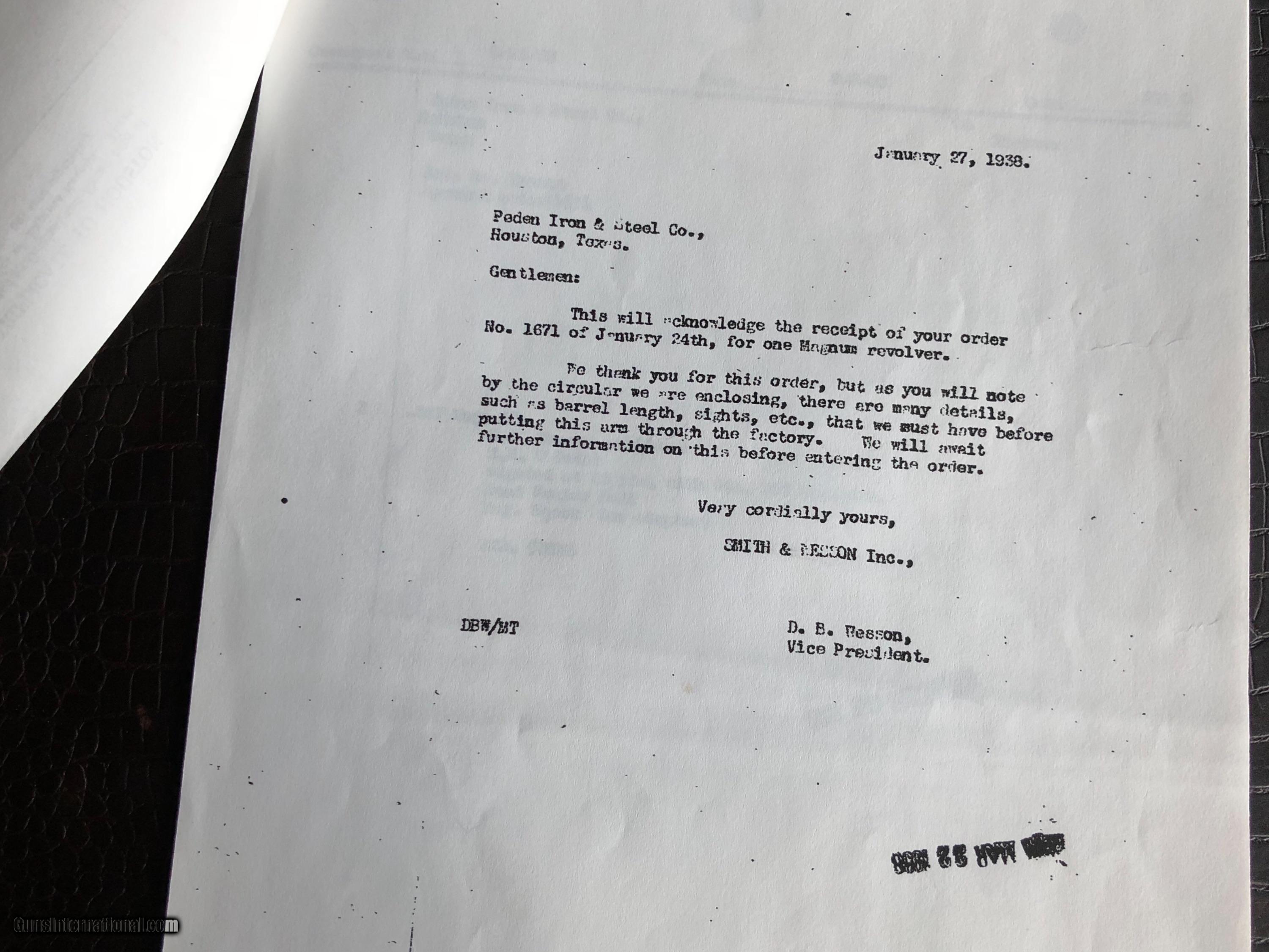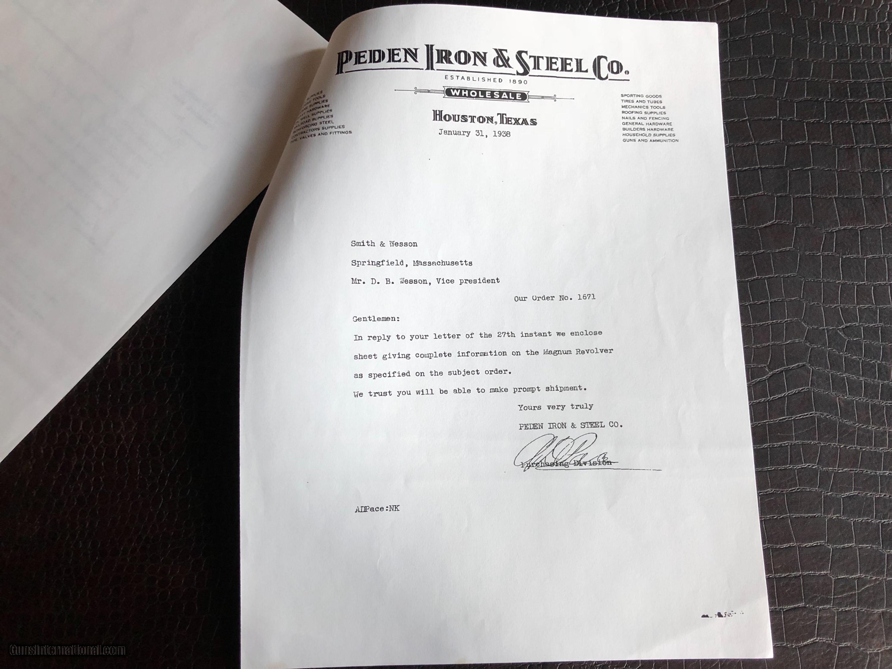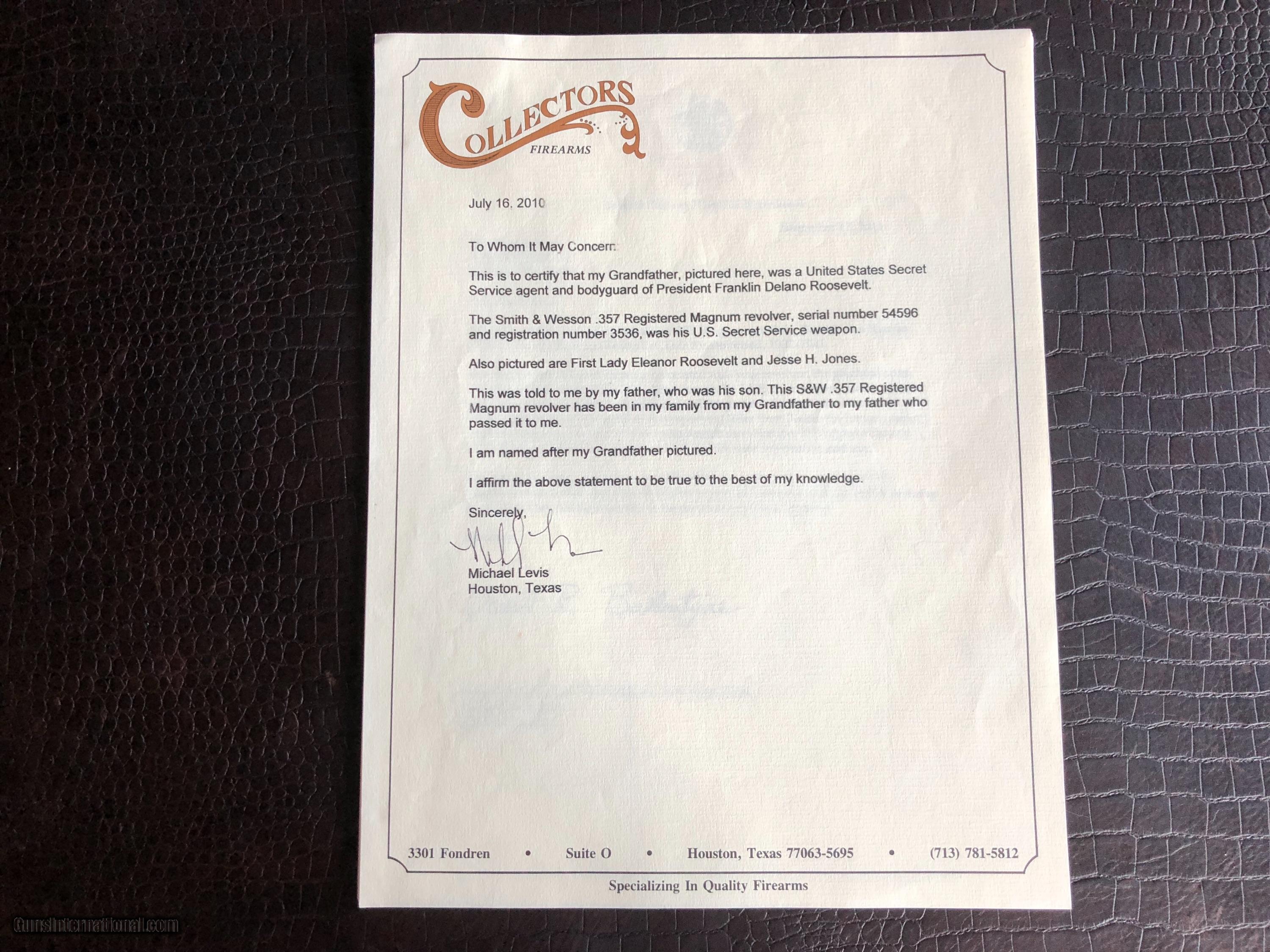 Description: ***SALE PENDING*** Smith & Wesson “Secret Service Agent .357 Magnum Revolver Used to Protect President Franklin Delano Roosevelt and First Lady Eleanor Roosevelt” by Secret Service Agent Michael Levis (not Lewis and misspelled on the certificate pictured here) - There is a Photo Picturing Agent Levis walking along side the Presidential Motorcade (on the left) with President Roosevelt and the First Lady - A Letter Signed by Grandson Michael Levis on Collector Firearms Letterhead - Letter from S&W Historical Foundation with five additional Documents Acknowledging the “Special Order” by Mr. Levis at Peden Iron & Steel Co. of Houston, TX - February 3, 1938 - a Letter signed by D.B. Wesson Dated January 27, 1938 - The Actual Order Sheet Dated January 21, 1938 - and additional documentation as shown in the pictures attached to this Ad. Introduced in 1935 and Built on Large N-Frame - A Highly Collectible Revolver All its own - But this one is a well documented piece American History. *****SPECIAL NOTE***** 1. I am a reasonable man – I encourage you to make reasonable offers on my listings. At times, there is some flexibility in pricing – other times there is not. I have been collecting guns since 1988 – so I have amassed quite a covey of what I consider to be some very fine guns and some utility guns. Feel free to call me, unlike most gun dealers – I am easy to talk to and will answer the phone on weekends and late evenings (not after 9PM CST). 2. I DO NOT ACCEPT TRADES 3. I do provide LAY-A-WAY plan, please inquire about my terms if you have a need – glad to do it when I can. 4. My collection consists of many guns that were bought from individuals – that means **I BUY GUNS** but I only buy clean used guns with collectibility. In particular - **I BUY SHOTGUNS** 5. ALL OF MY TRANSACTIONS ARE DONE THROUGH MY FFL with whom I have a very solid relationship. If you buy a guns from me, you’ll pay them, they will ship to your FFL of choice and all dealings will be with them post receipt of funds. They are a high end boutique gun dealer in the Texas Hill Country and can accommodate the entire transaction. If you live in Texas and want to drive to see one of my guns, reach out to me to discuss making an appointment with my FFL – I do not show guns at my home nor do I meet guys at public locations for viewings or sales. ALL GUNS ARE LEGALLY TRANSFERRED through my FFL – there are NO EXCEPTIONS. 6. Certified funds are preferred – if you send a personal check for payment the FFL ships one week after receipt. Certified funds payments – shipments are done next business day. NO CREDIT CARD payments are accepted. 7. I encourage you to shoot the guns you buy from me – so during your 3 day inspection – shoot the gun. Make sure it is operating in the manner you expected. If you are not happy – return the gun for a full refund except shipping costs. SOLD |