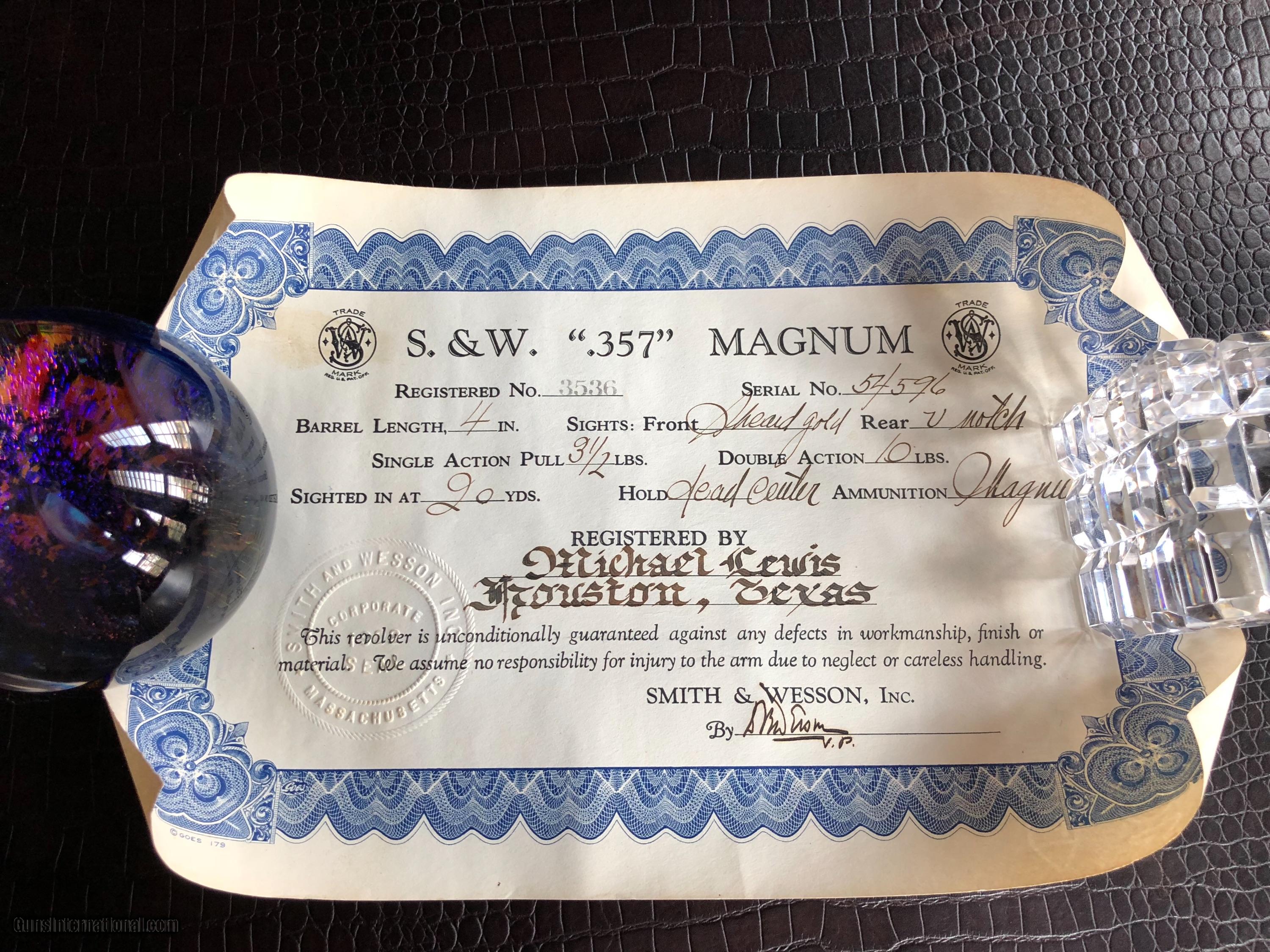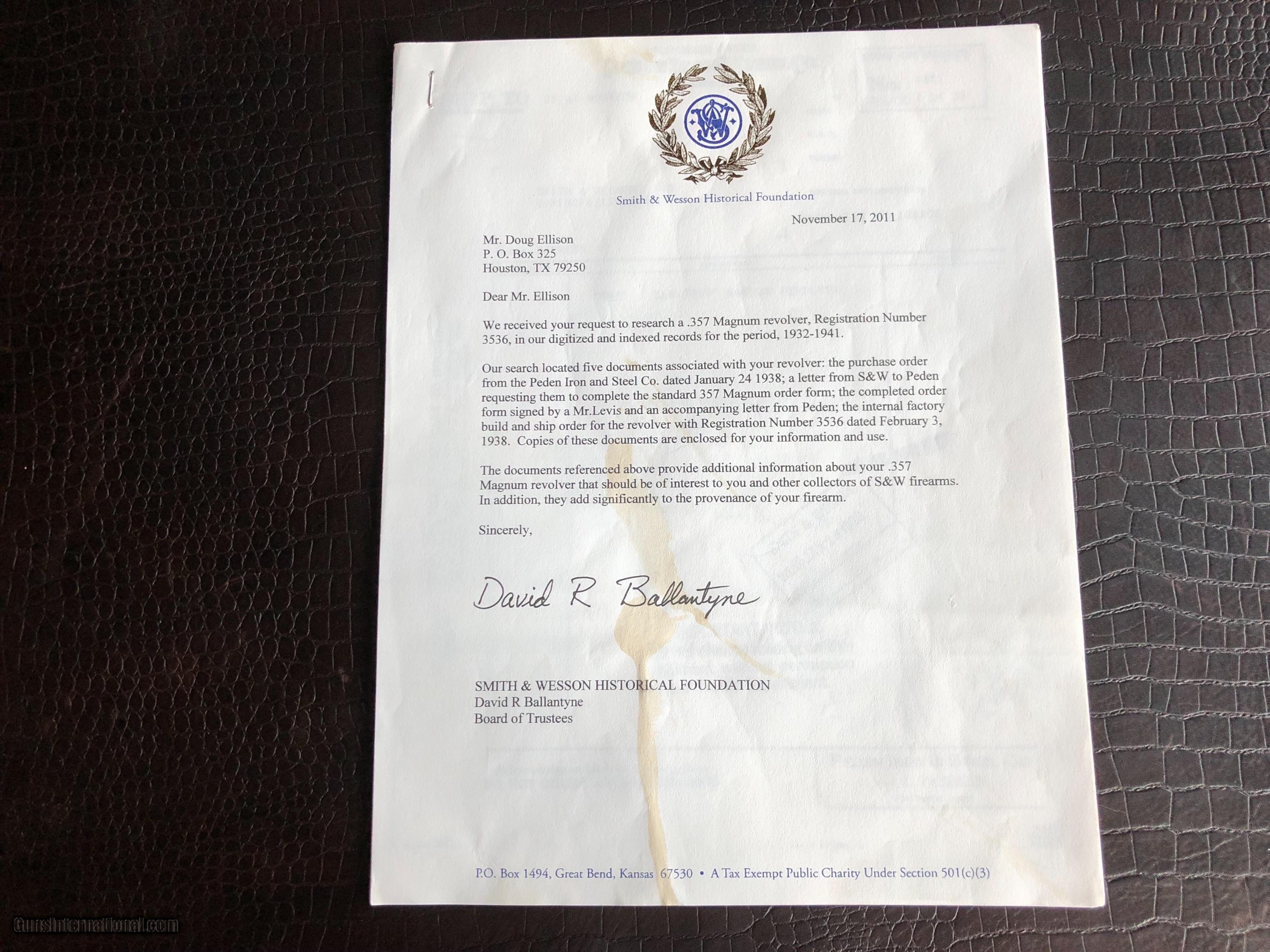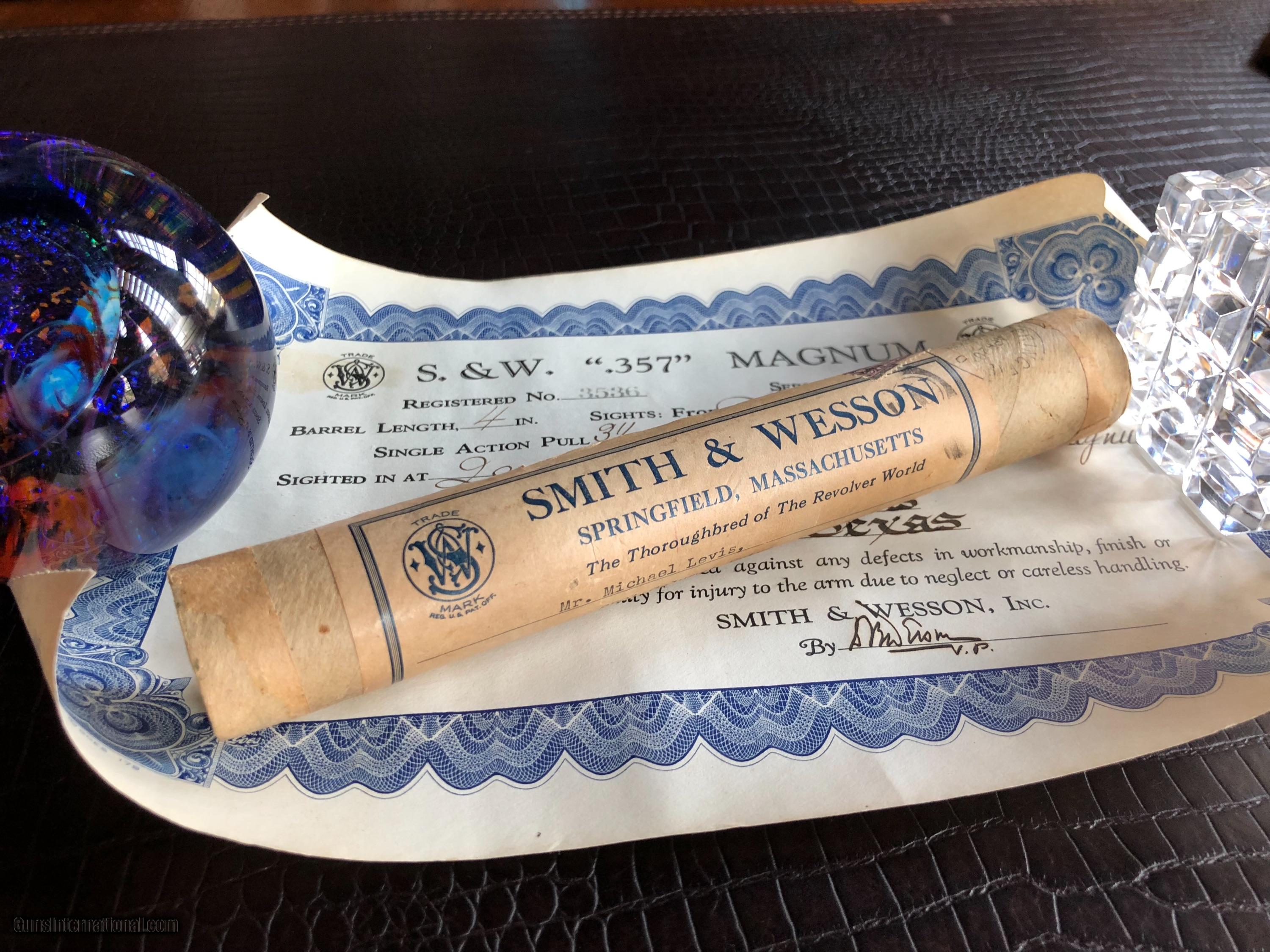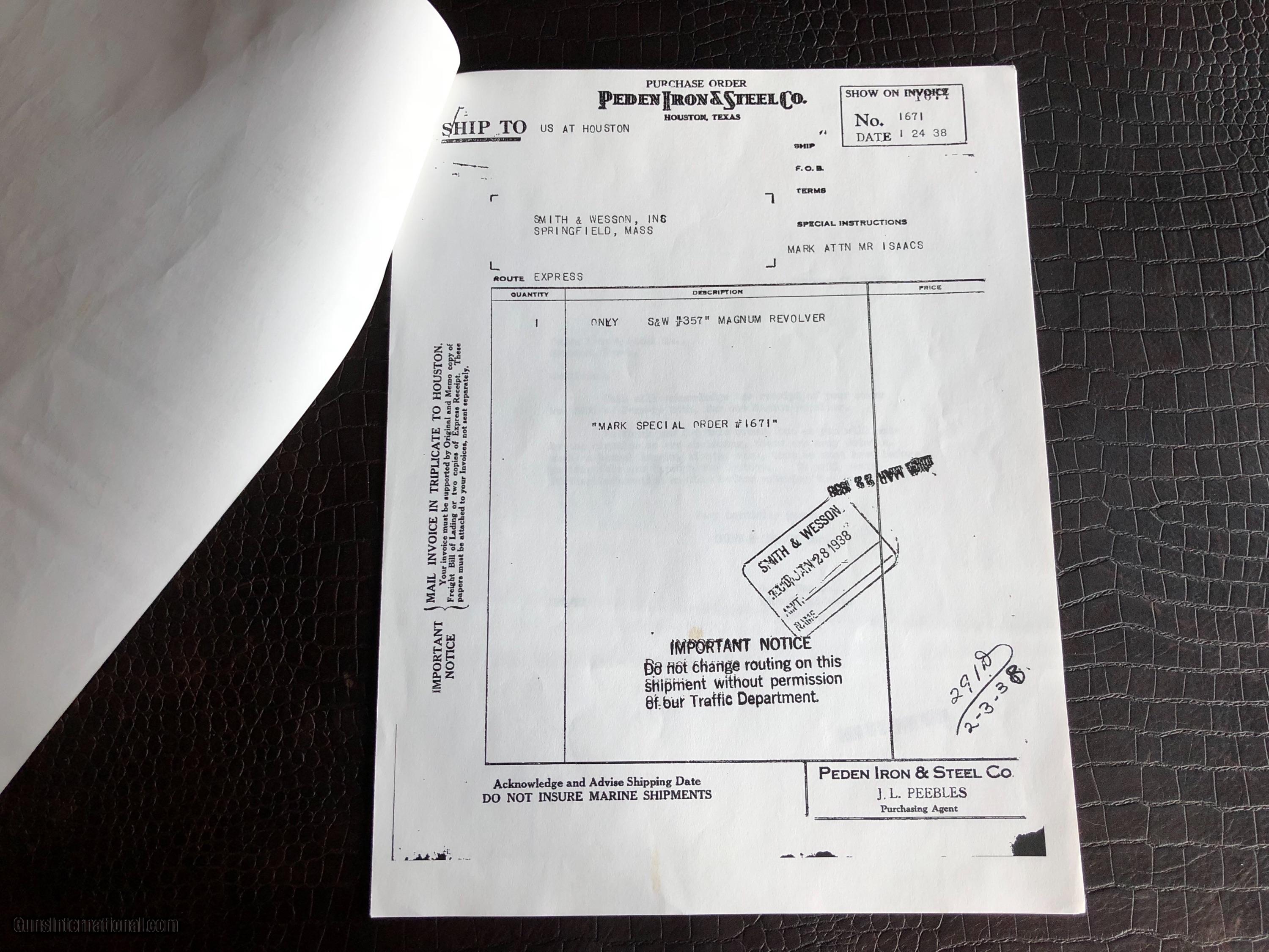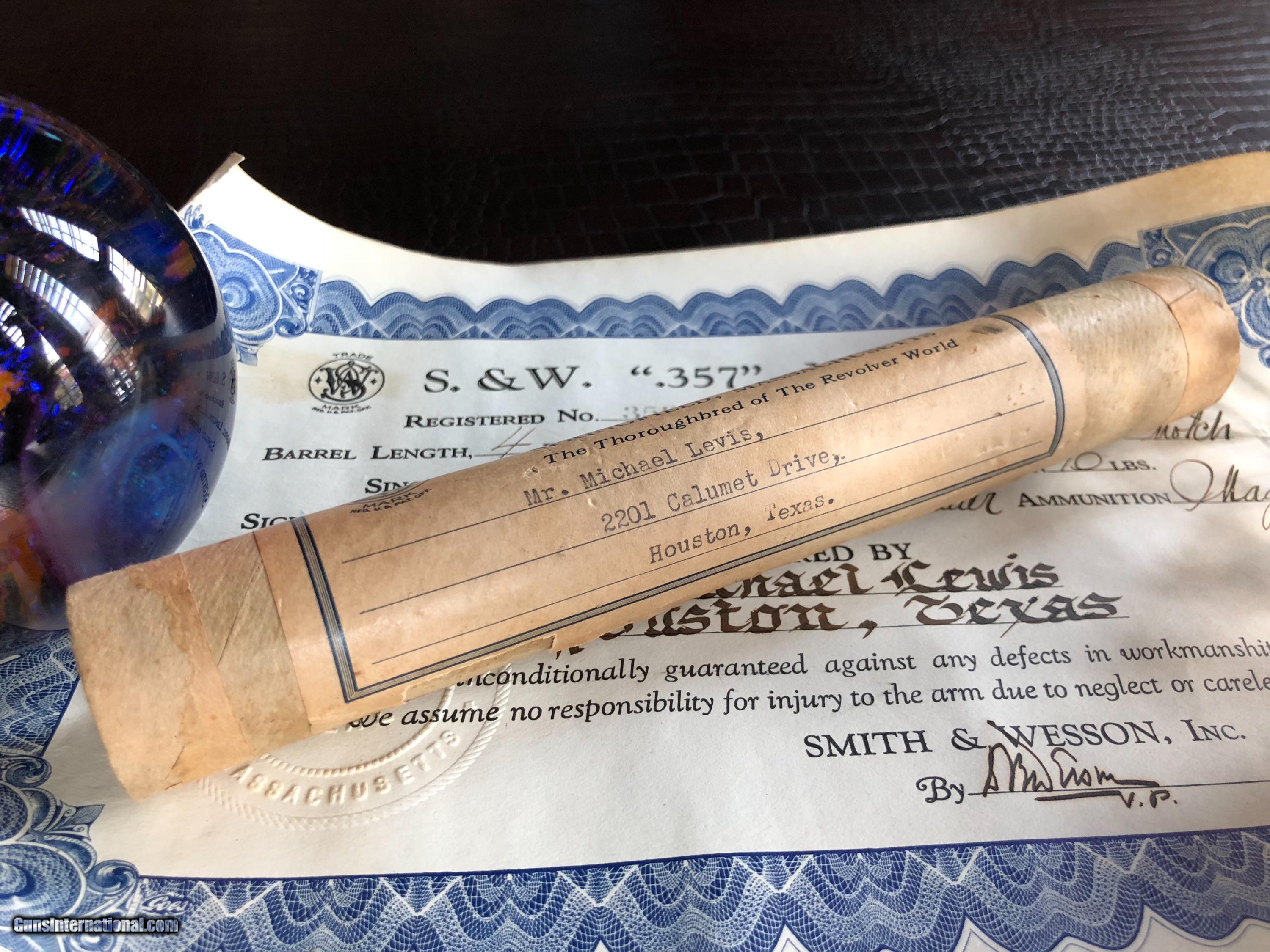 Description: ***SALE PENDING*** Smith & Wesson “Secret Service Agent .357 Magnum Revolver Used to Protect President Franklin Delano Roosevelt and First Lady Eleanor Roosevelt” by Secret Service Agent Michael Levis (not Lewis and misspelled on the certificate pictured here) - There is a Photo Picturing Agent Levis walking along side the Presidential Motorcade (on the left) with President Roosevelt and the First Lady - A Letter Signed by Grandson Michael Levis on Collector Firearms Letterhead - Letter from S&W Historical Foundation with five additional Documents Acknowledging the “Special Order” by Mr. Levis at Peden Iron & Steel Co. of Houston, TX - February 3, 1938 - a Letter signed by D.B. Wesson Dated January 27, 1938 - The Actual Order Sheet Dated January 21, 1938 - and additional documentation as shown in the pictures attached to this Ad. Introduced in 1935 and Built on Large N-Frame - A Highly Collectible Revolver All its own - But this one is a well documented piece American History. *****SPECIAL NOTE***** 1. I am a reasonable man – I encourage you to make reasonable offers on my listings. At times, there is some flexibility in pricing – other times there is not. I have been collecting guns since 1988 – so I have amassed quite a covey of what I consider to be some very fine guns and some utility guns. Feel free to call me, unlike most gun dealers – I am easy to talk to and will answer the phone on weekends and late evenings (not after 9PM CST). 2. I DO NOT ACCEPT TRADES 3. I do provide LAY-A-WAY plan, please inquire about my terms if you have a need – glad to do it when I can. 4. My collection consists of many guns that were bought from individuals – that means **I BUY GUNS** but I only buy clean used guns with collectibility. In particular - **I BUY SHOTGUNS** 5. ALL OF MY TRANSACTIONS ARE DONE THROUGH MY FFL with whom I have a very solid relationship. If you buy a guns from me, you’ll pay them, they will ship to your FFL of choice and all dealings will be with them post receipt of funds. They are a high end boutique gun dealer in the Texas Hill Country and can accommodate the entire transaction. If you live in Texas and want to drive to see one of my guns, reach out to me to discuss making an appointment with my FFL – I do not show guns at my home nor do I meet guys at public locations for viewings or sales. ALL GUNS ARE LEGALLY TRANSFERRED through my FFL – there are NO EXCEPTIONS. 6. Certified funds are preferred – if you send a personal check for payment the FFL ships one week after receipt. Certified funds payments – shipments are done next business day. NO CREDIT CARD payments are accepted. 7. I encourage you to shoot the guns you buy from me – so during your 3 day inspection – shoot the gun. Make sure it is operating in the manner you expected. If you are not happy – return the gun for a full refund except shipping costs. SOLD |