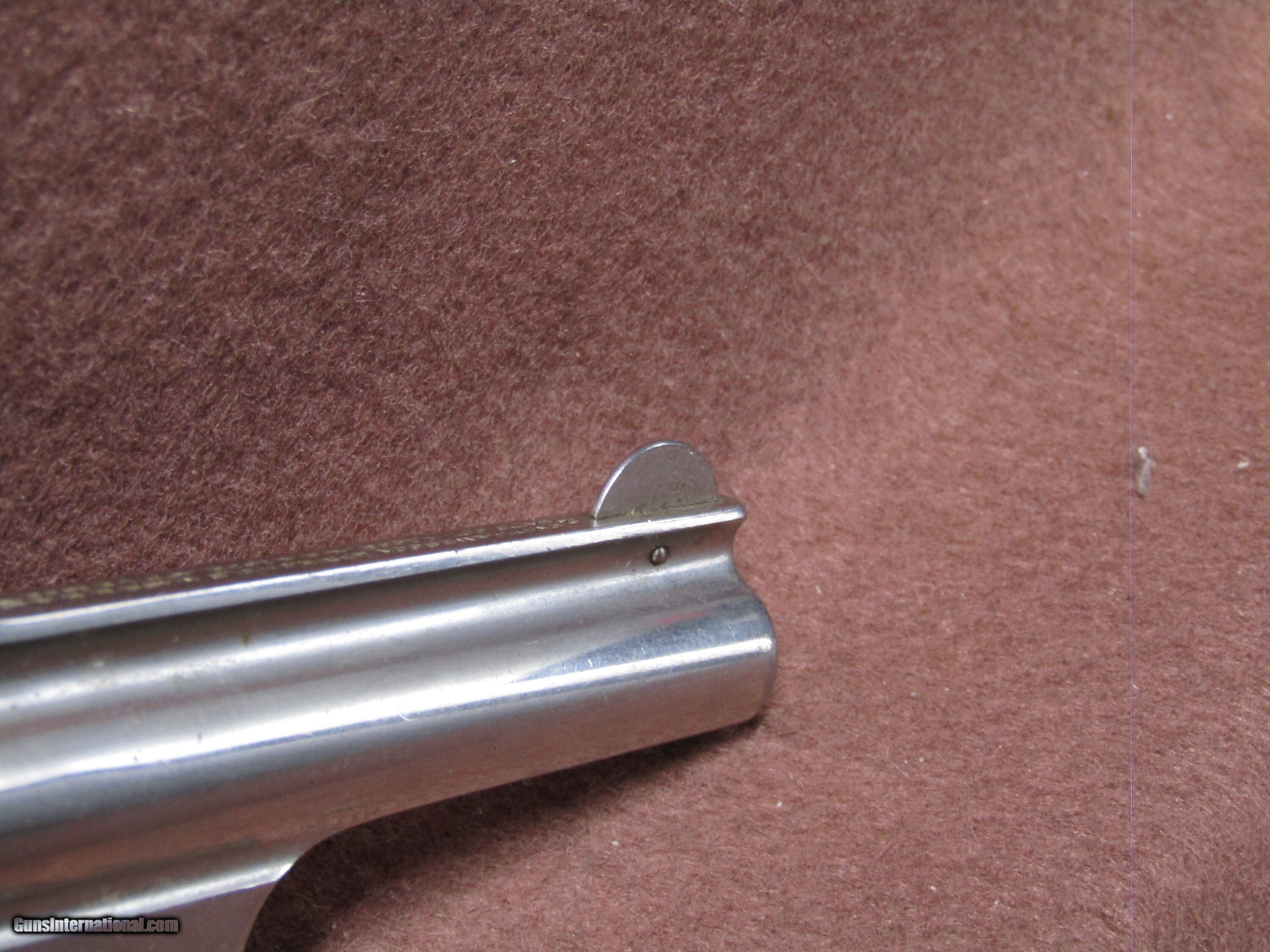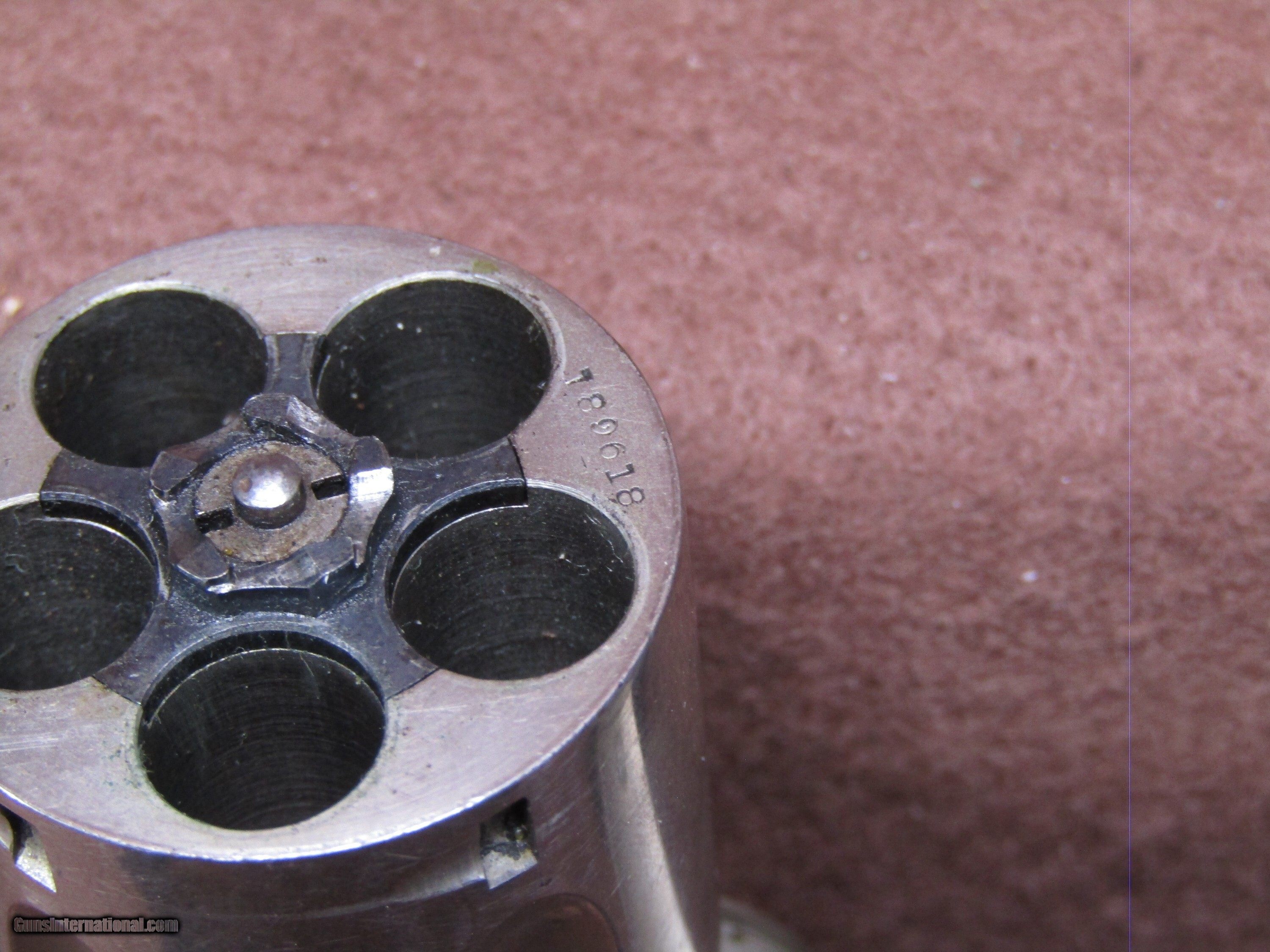 Description: Smith & Wesson Top Break 4th Generation Lemon Squeezer 38 S&W 5 Shot Double Action Revolver with a 3.25" Barrel and Fixed Sights. Backstrap/Grip Safety. The Nickel Finish is in Good Condition Showing some Wear. The Black Checkered S&W Hard Rubber Grips are in Very Good Condition - Free of Cracks and Chips. Nice Strong Action with Good Timing and a Tight Lockup. The Extractor Works Fine. The Bore is Very Good with Nice Shine and Rifling. The Serial Number is 189618 and the Cylinder Matches. Very Good Overall Condition - 80%. Handgun Caliber: .38 S&W (.38 Colt New Police, .38 Super Police) Manufacturer: Smith & Wesson Model: Lemon Squeezer 4th Gen Serial Number: 189618 Barrel Length: 3.25 Chambers: 5 Condition: 80% Metal Condition: Good Bore Condition: Very Good Price: $319.00 Shipping: $31.88 Contact Seller |